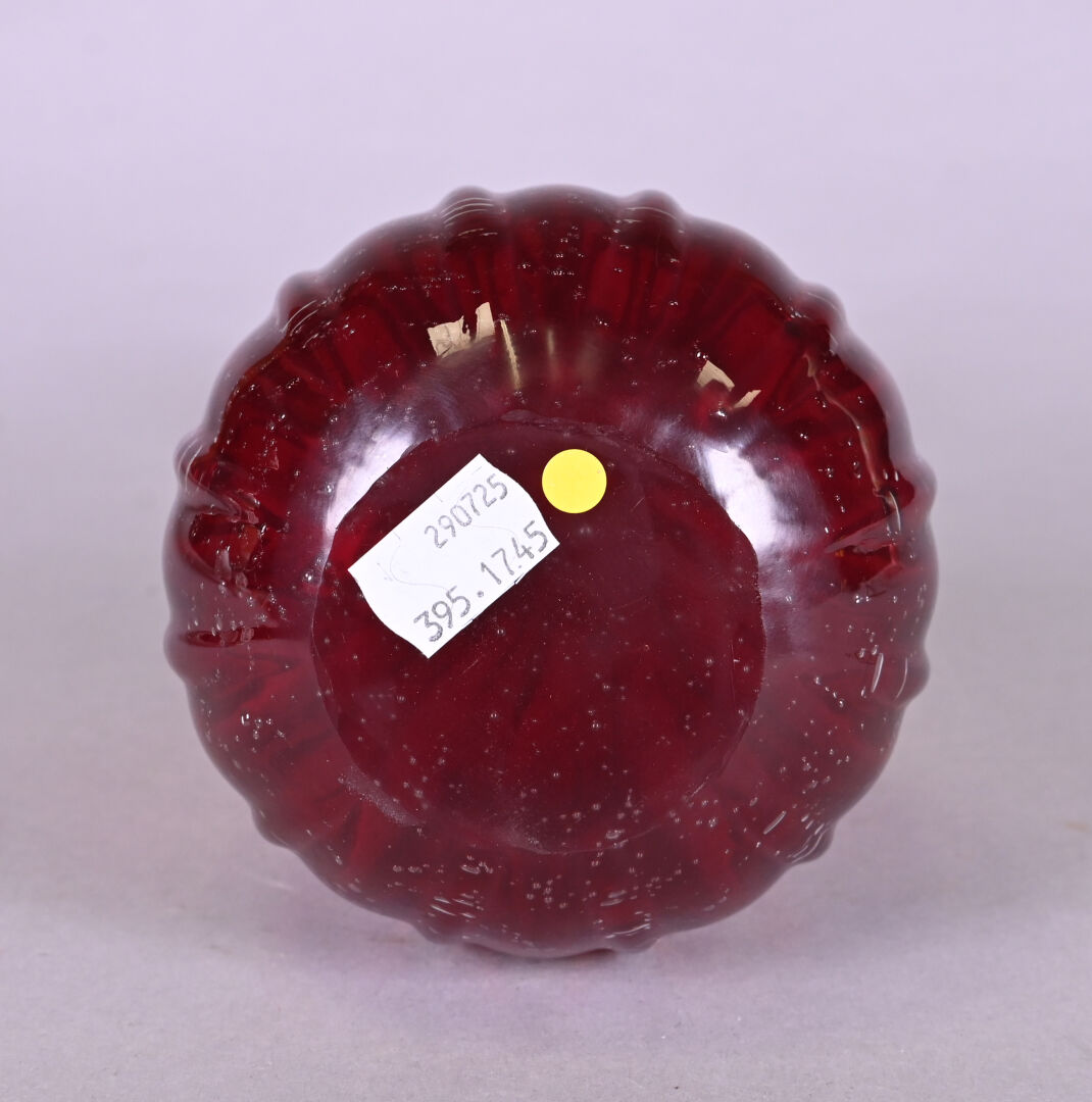 Vase bulbe à haut col en verre soufflé bullé torsadé rouge. Haut. : 29 cm.