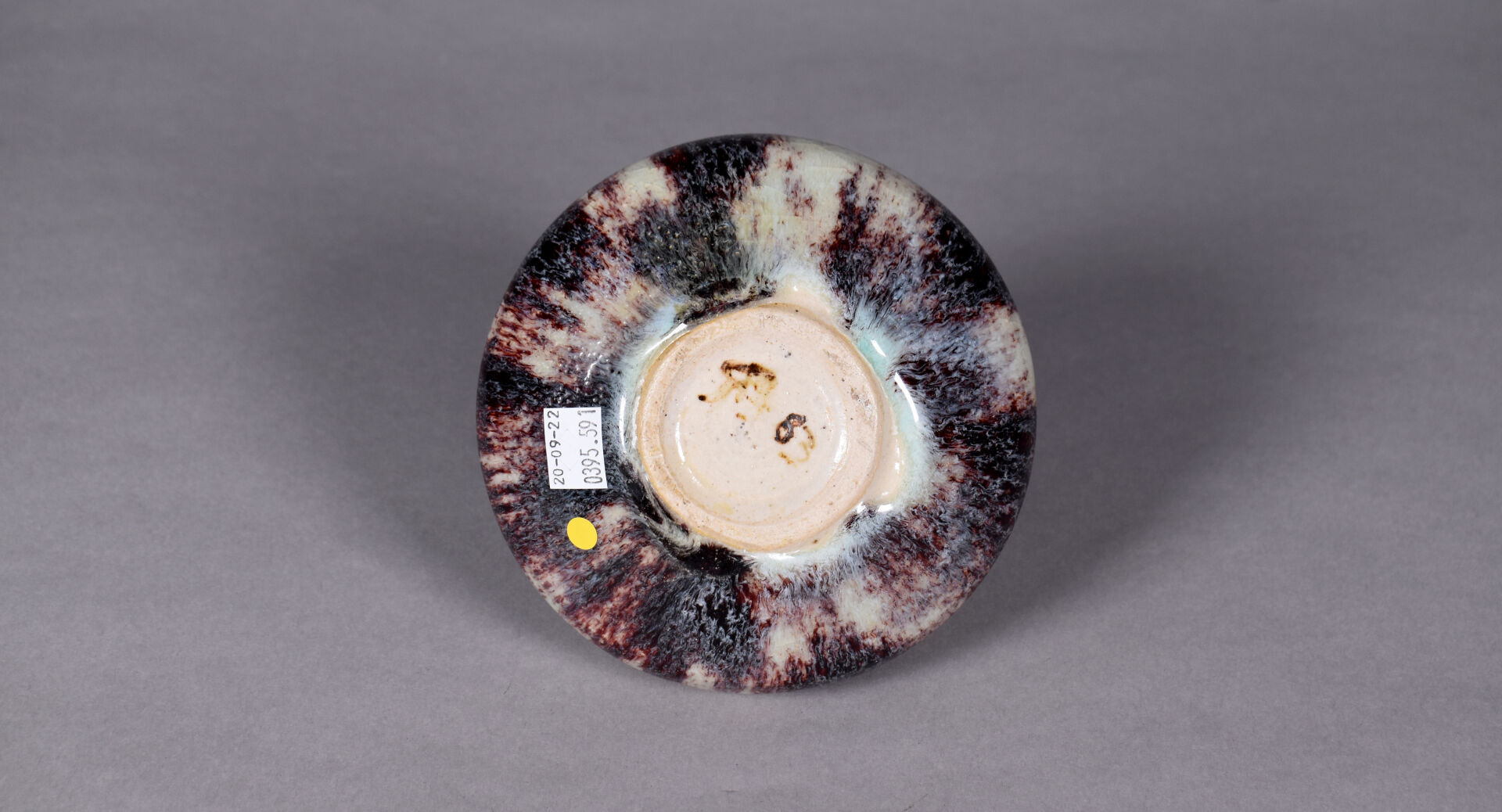 Vase bulbe en céramique émaillée sang de boeuf violine et légèrement bleuté (2 petites restaurations au col). Porte une signature au dessous. Haut. : 15 cm.