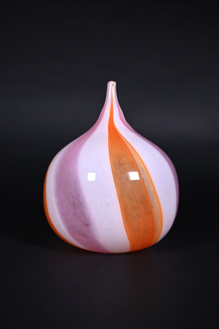 Vase bulbe en verre à rubans orange, rose et blanc. Probablement Murano, XXe siècle. Haut. : 27 cm.
