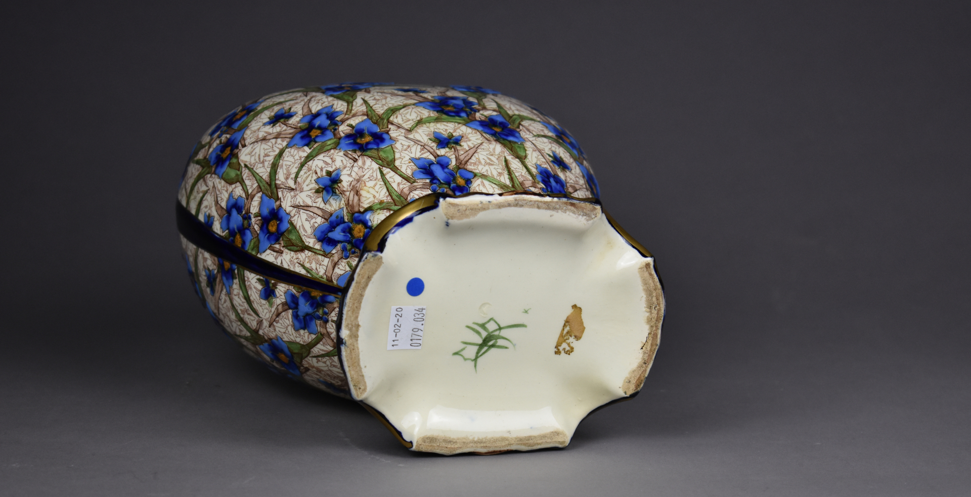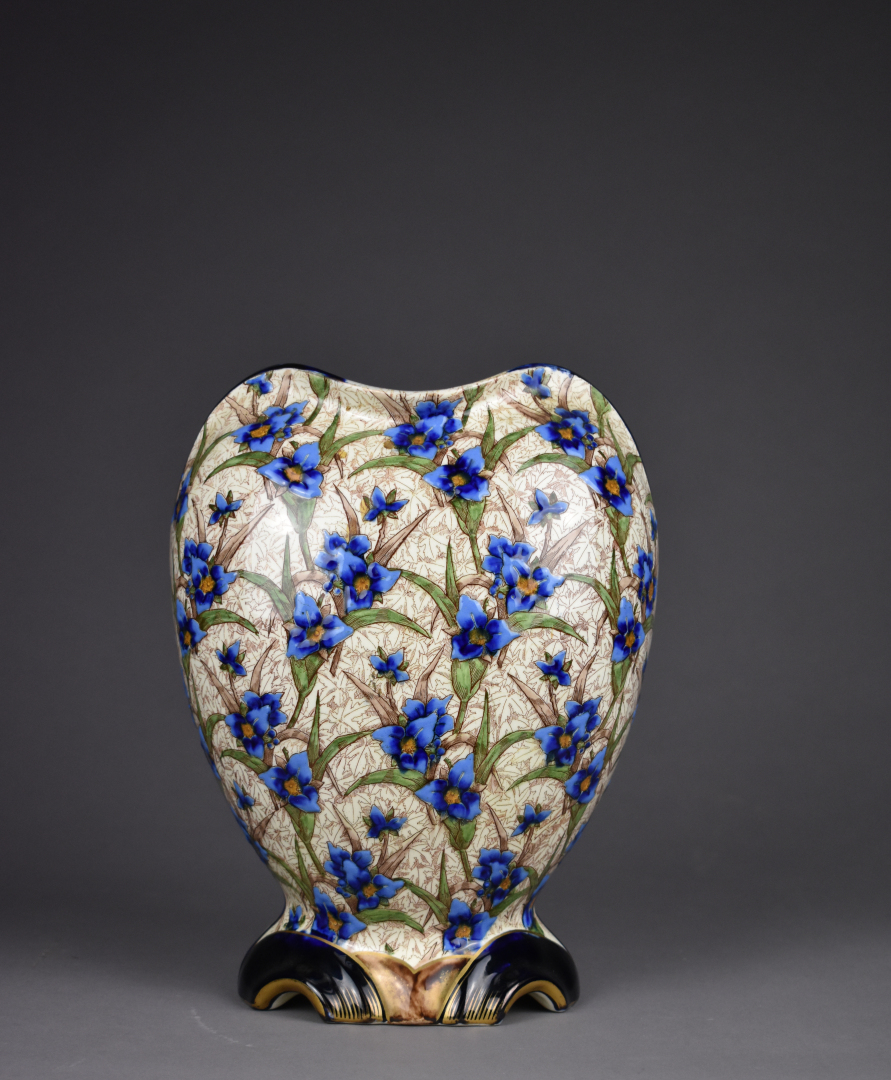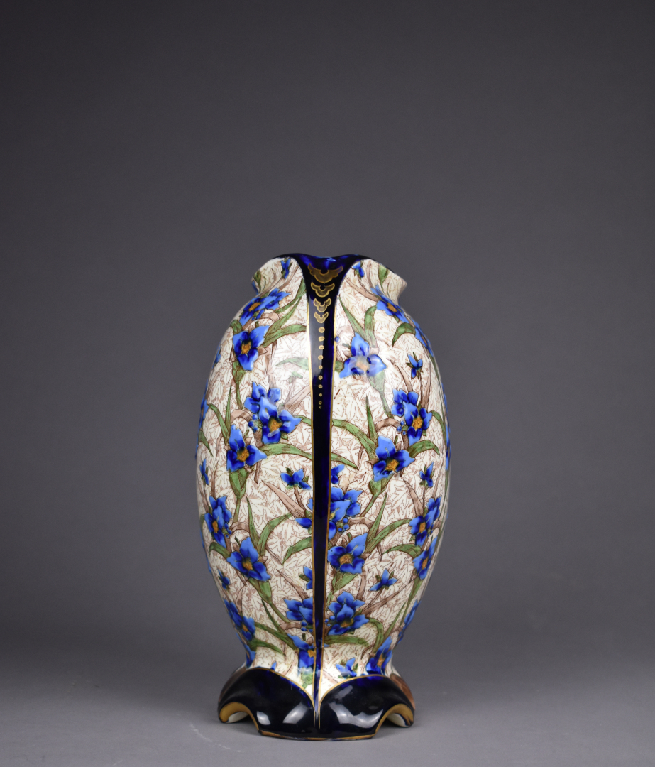 Vase coeur en faïence à décor émaillé de fleurs bleues sur fond beige et bleu de Sèvres or. Marqué sous la base. Fin du XIXe siècle. Haut. : 28 cm.