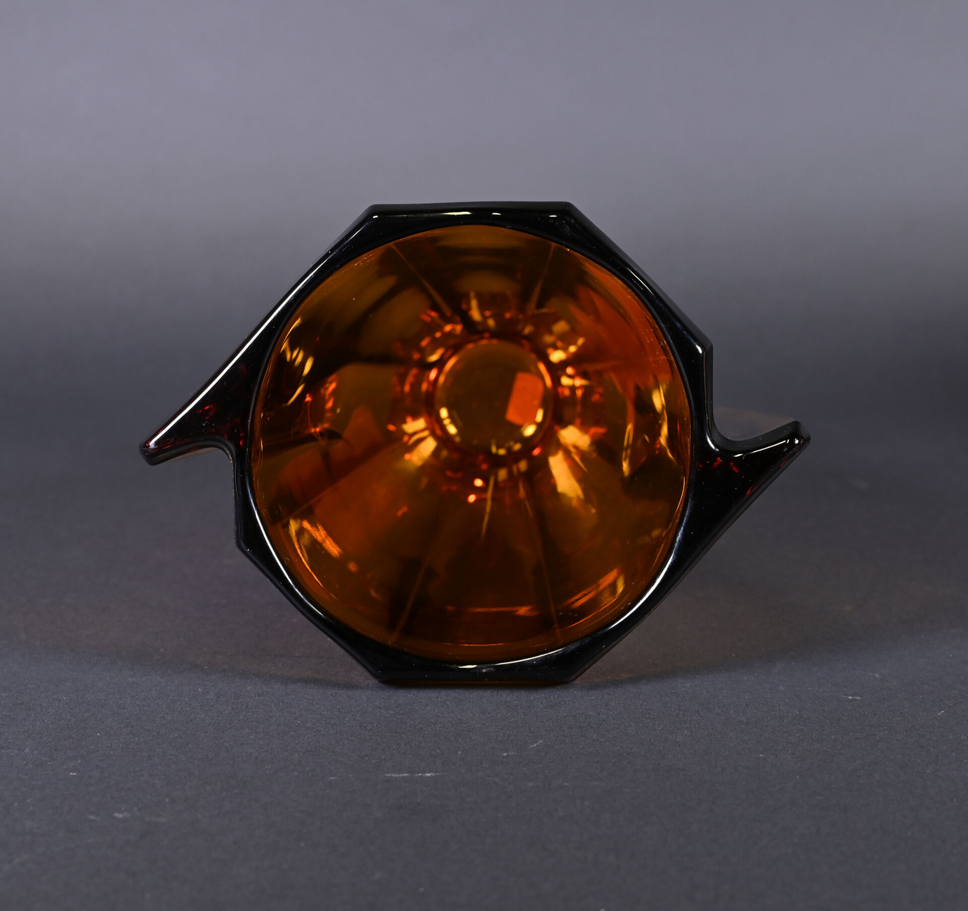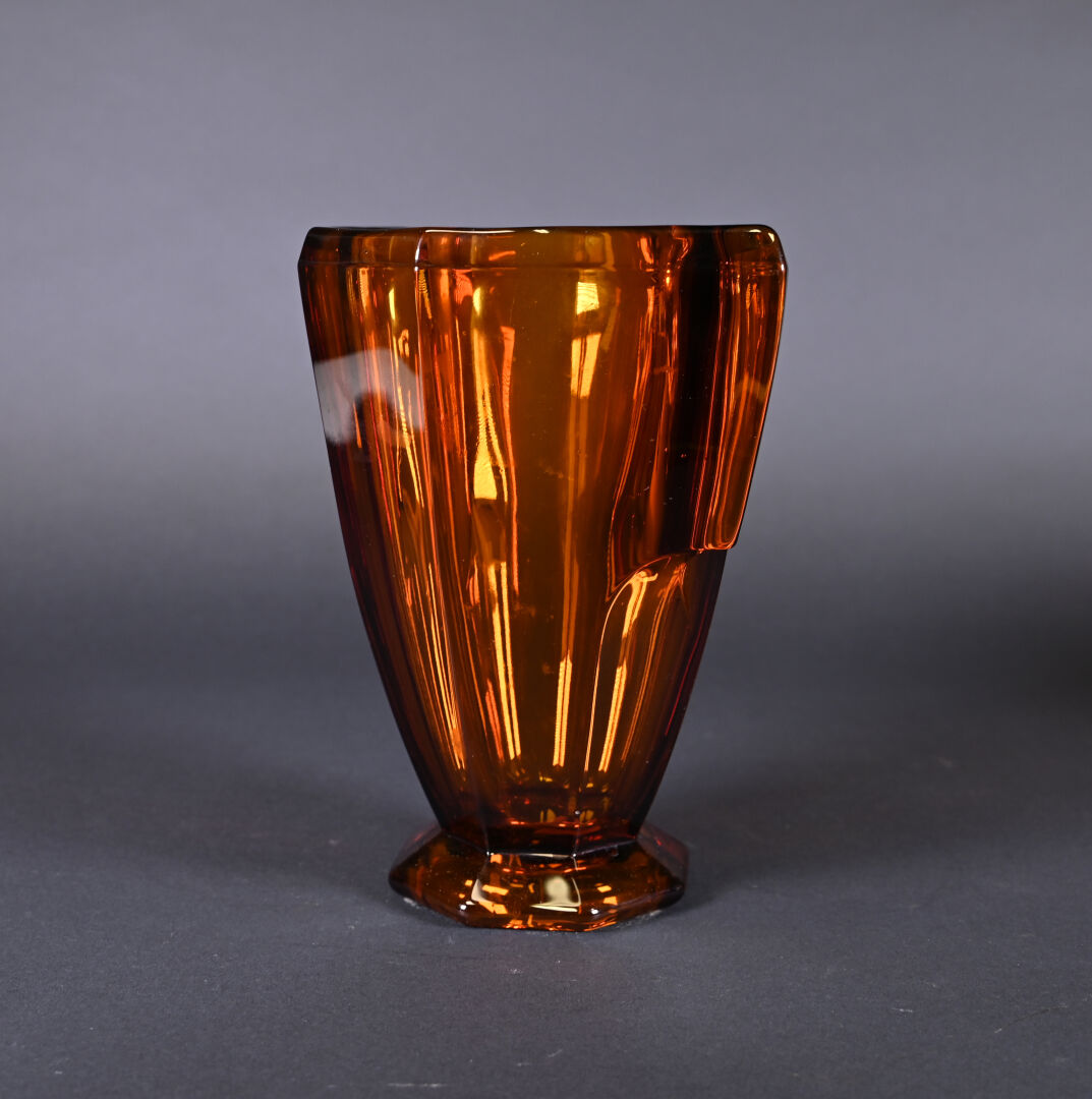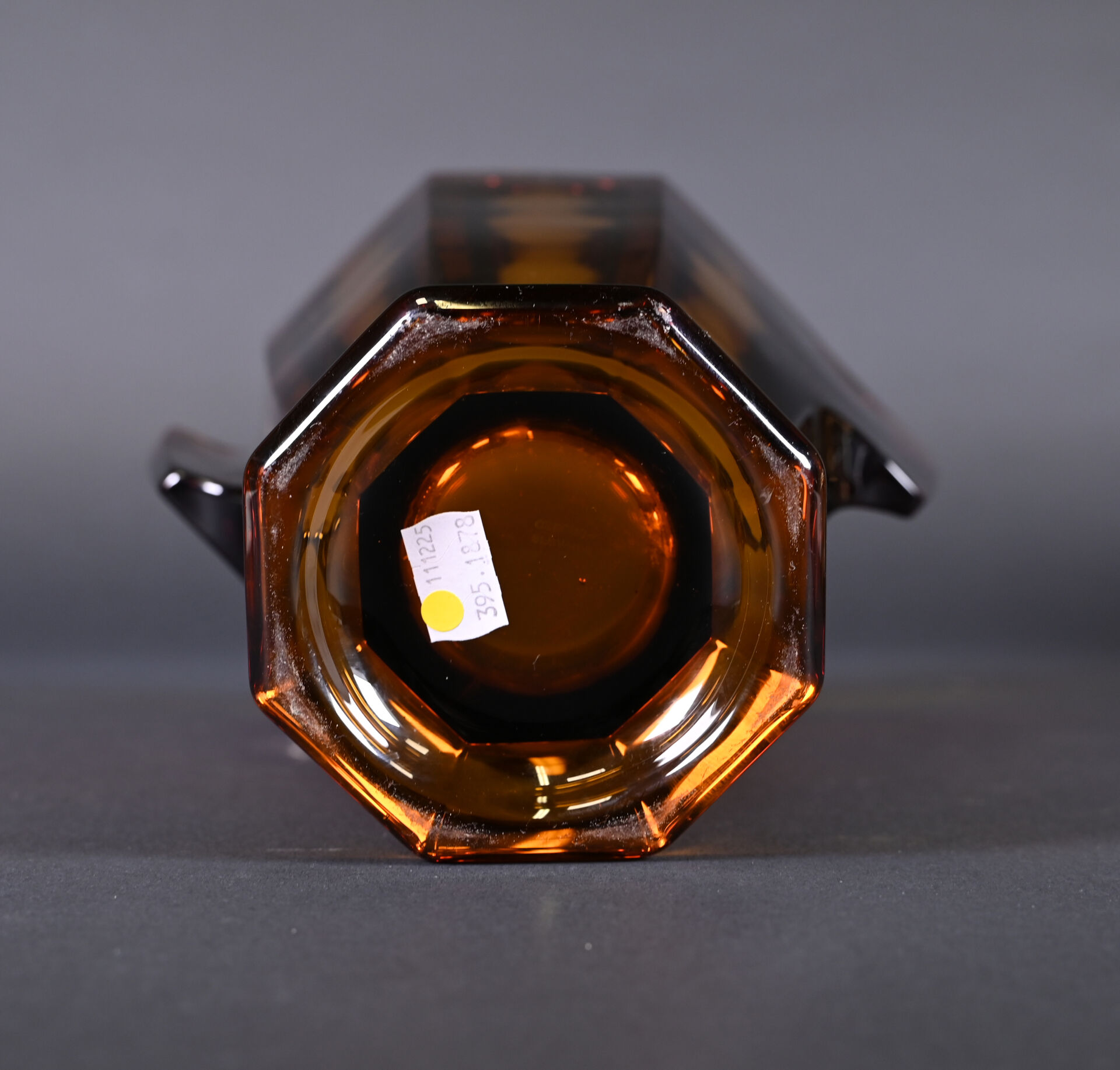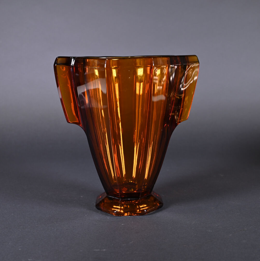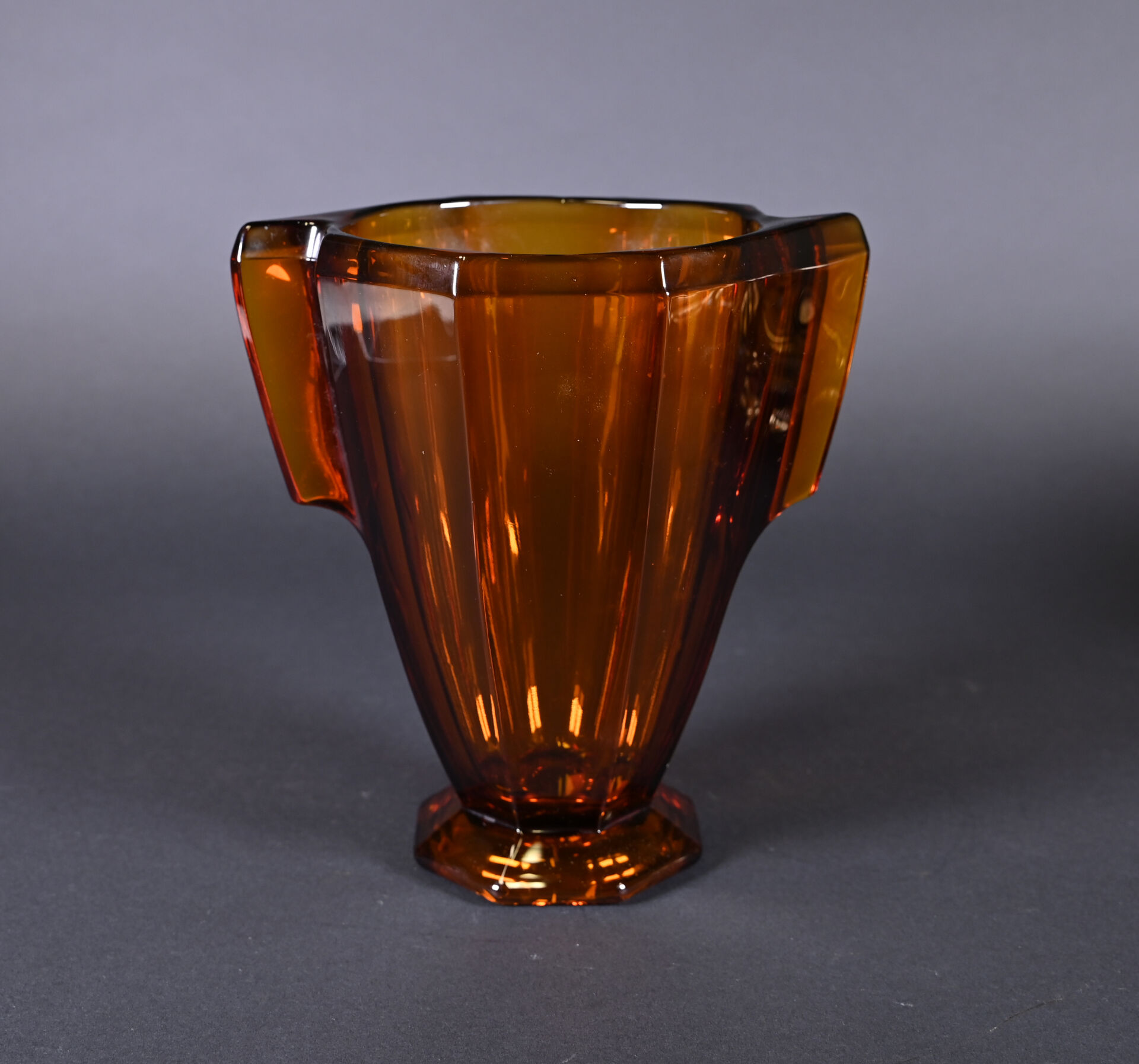 Vase cornet à anses en verre ambré, pietement octogonal. Epoque Art Déco. Haut. : 25,5 cm.