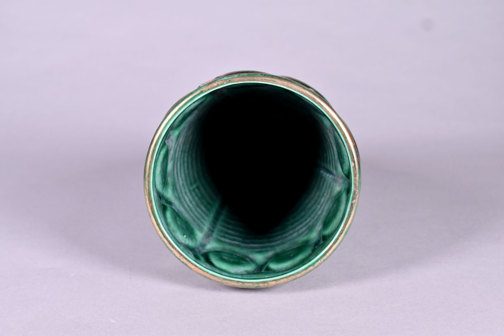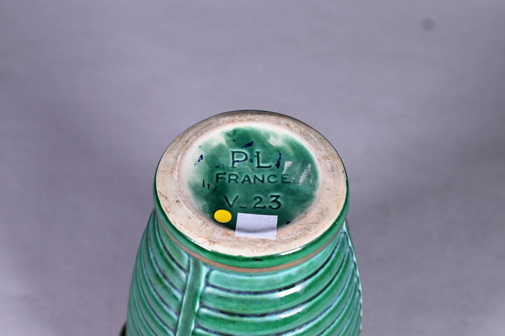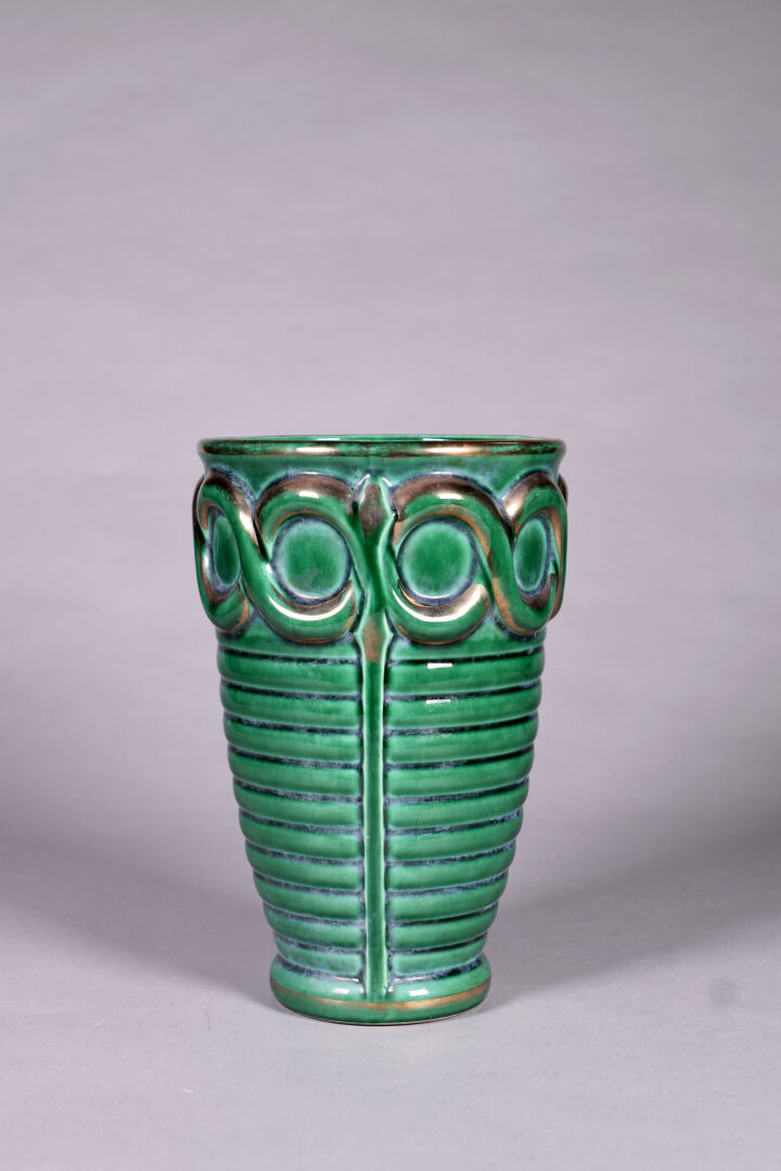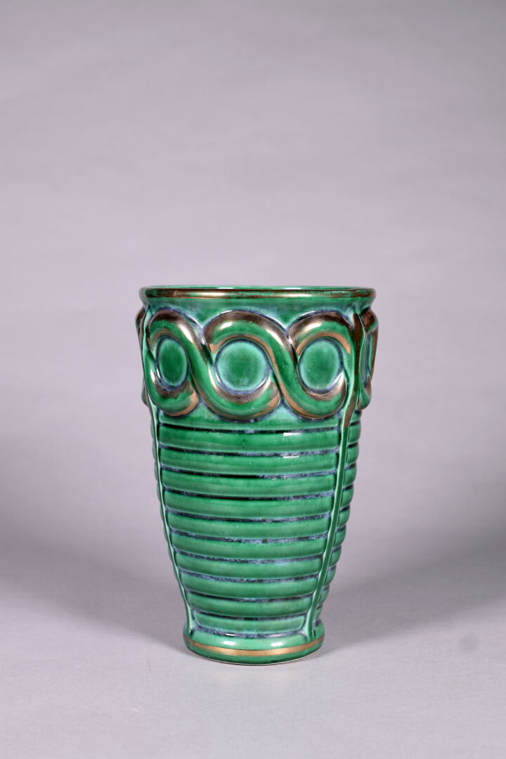 Vase cornet bourrelé en barbotine et dorure, la partie supérieure ornée d’entrelacs (usures). Vers 1940/1950. Haut. : 26 cm.