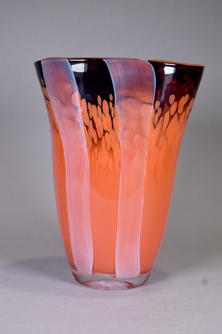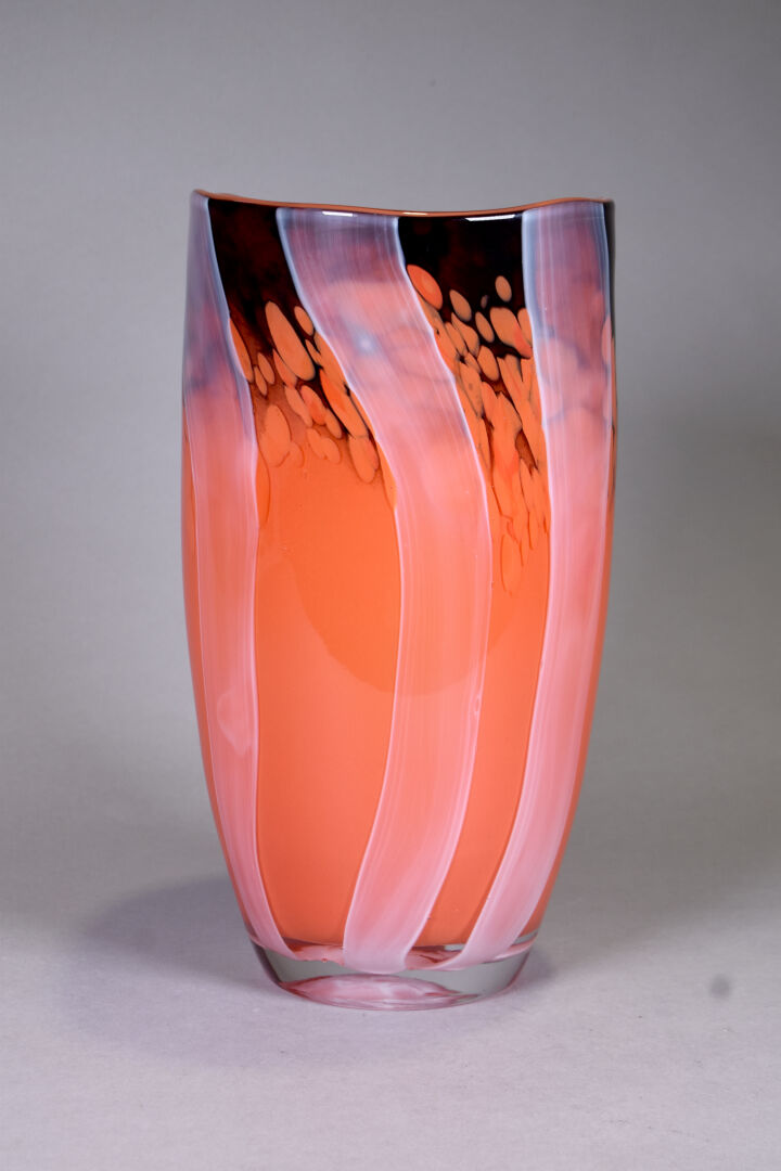 Vase cornet en verre orange, la bordure en noir et rubans blancs. Haut. : 34,5 cm.