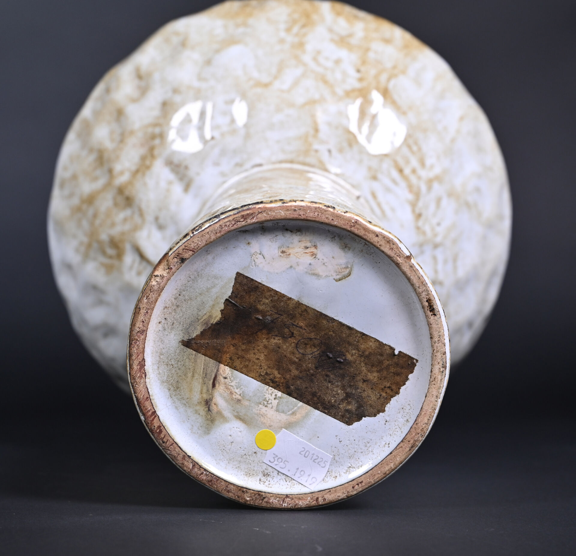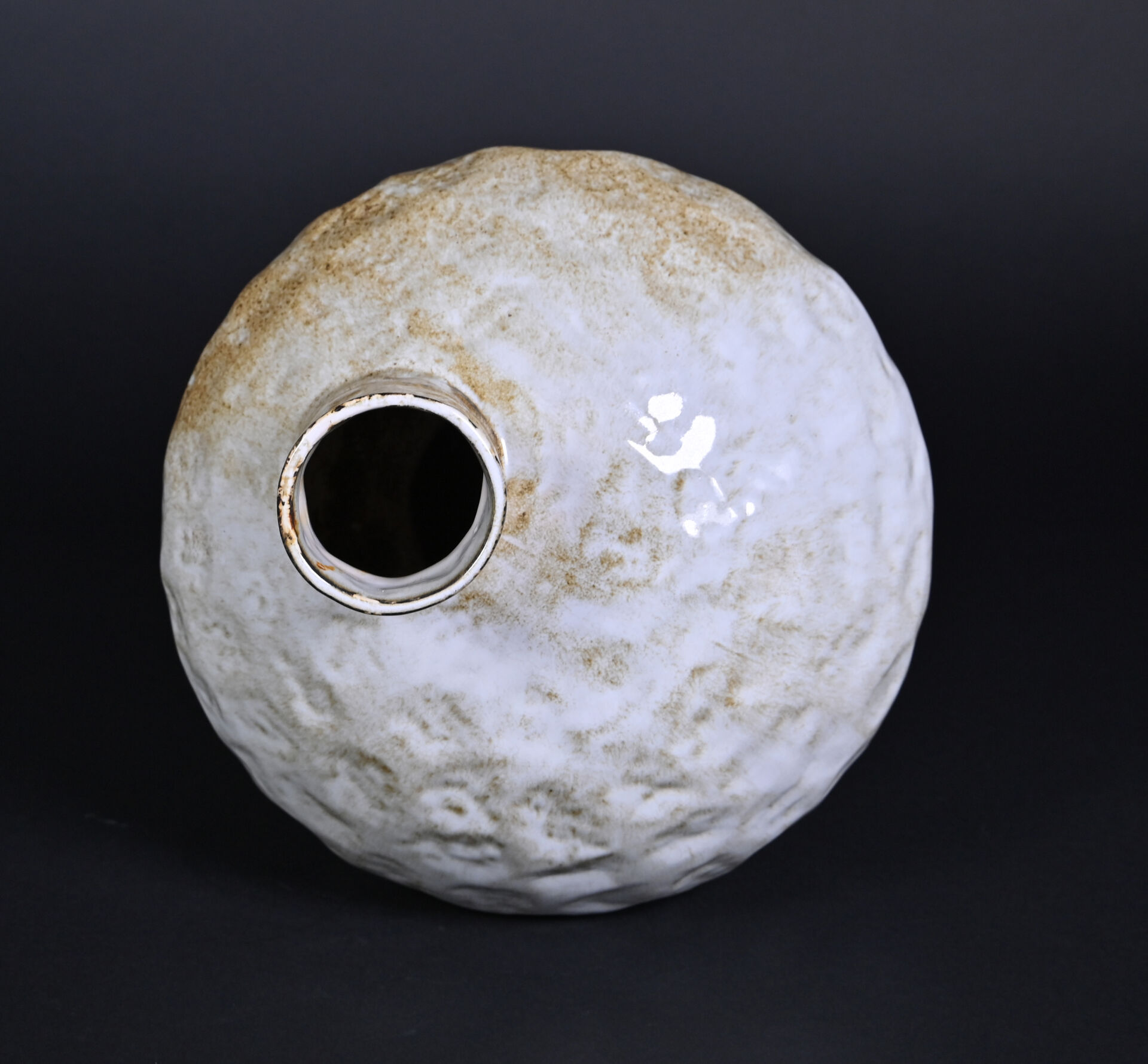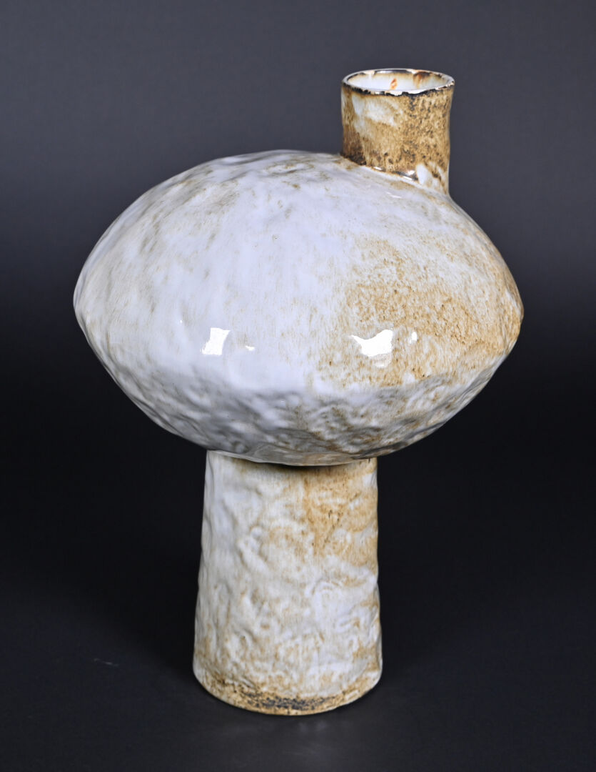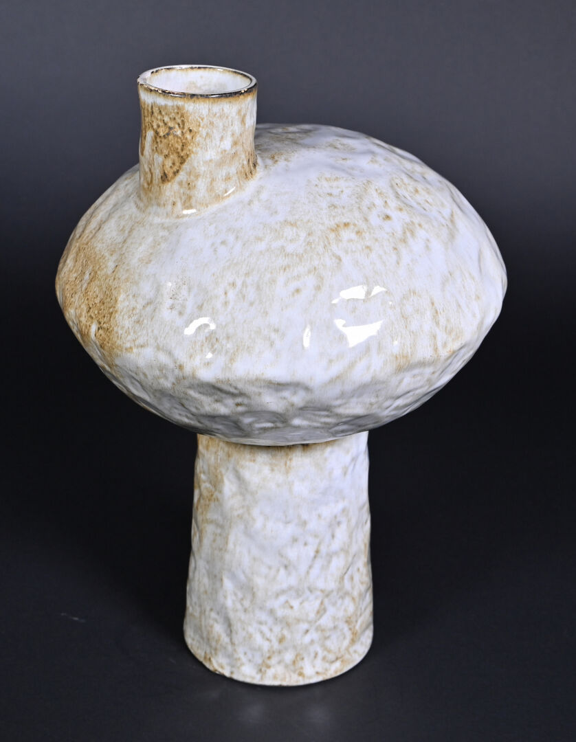 Vase de forme libre en céramique bosselée émaillée crème et ocre (un petit éclat à la base). Le col déporté. Vers 1950/1960. Haut. : 40 cm.