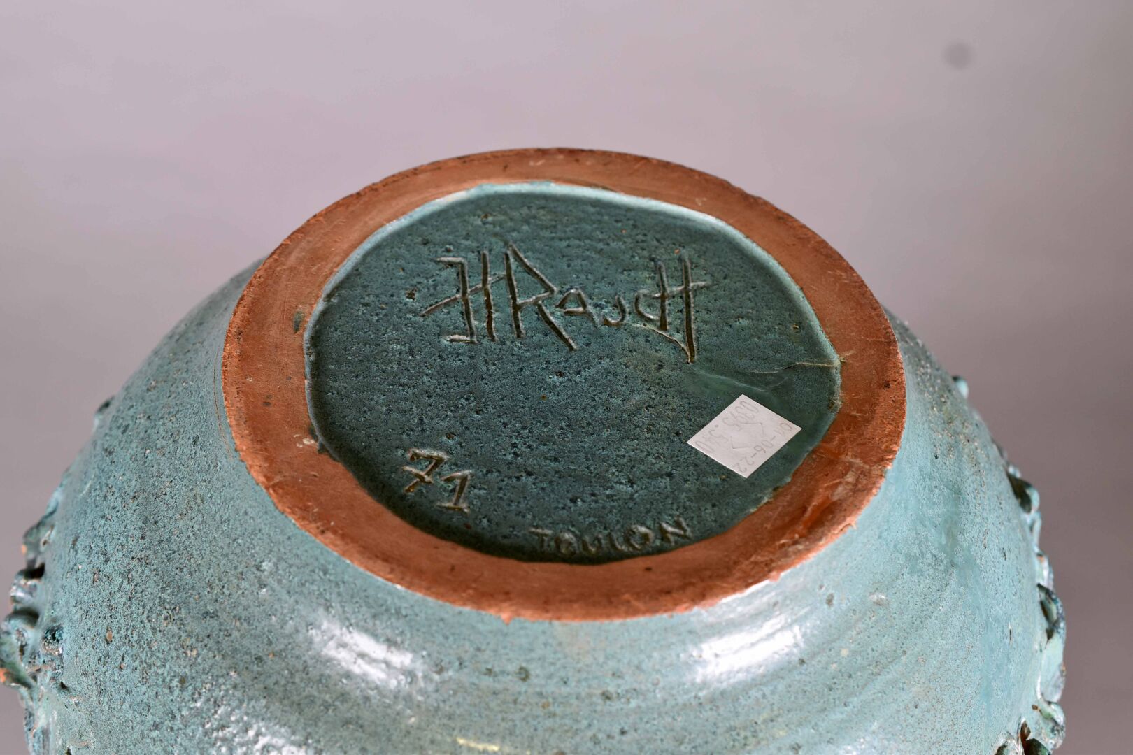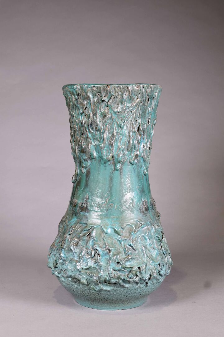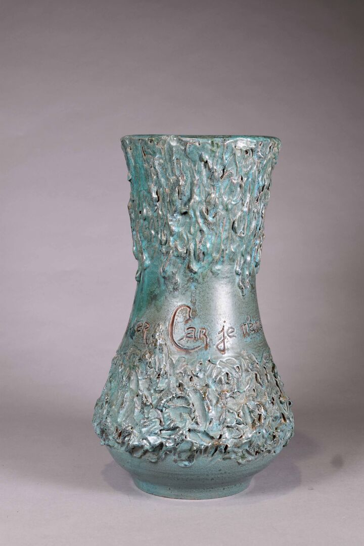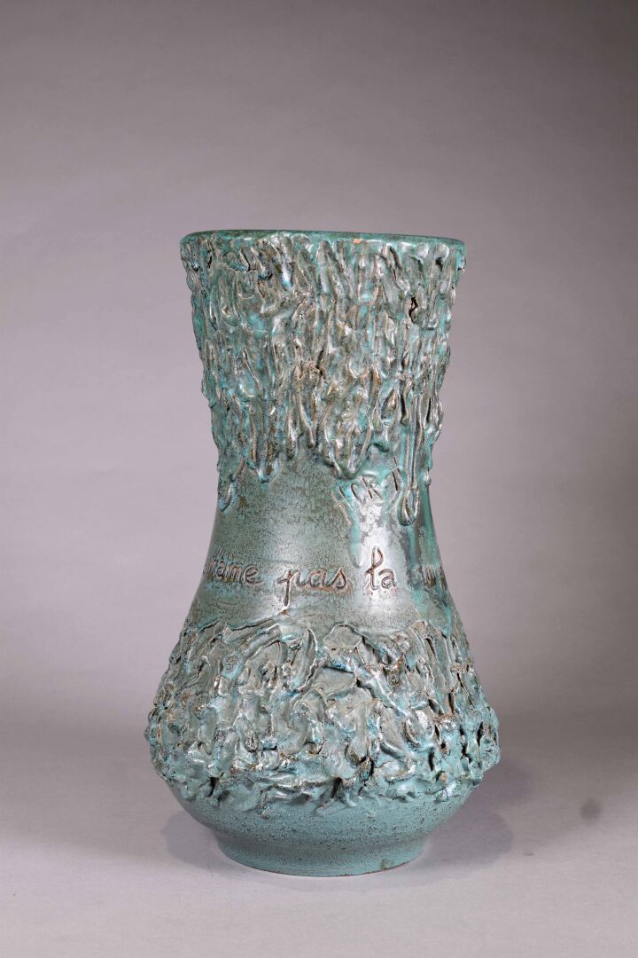 Vase en céramique parlanteverte « Je n’aime pas la simple idée…. ». Marqué au dessous Haut. : 45 cm.