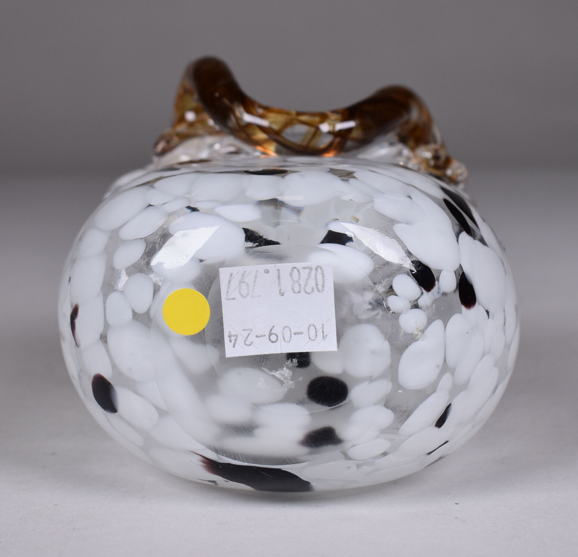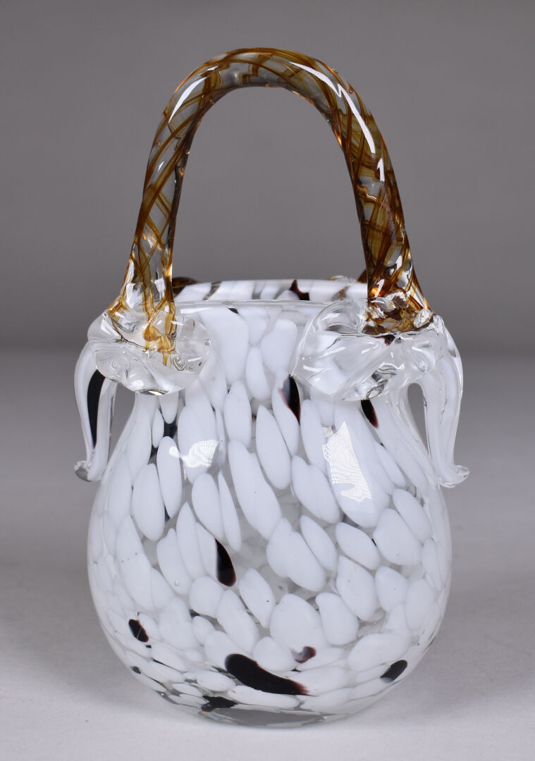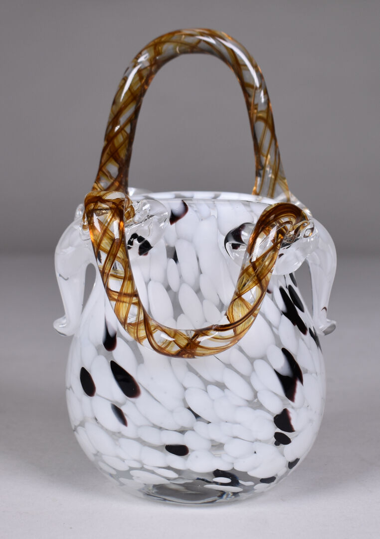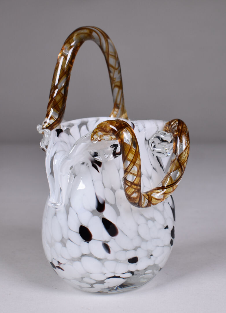 Vase en verre à rubans ocre, blanc et noir figurant un sac à main. Murano XXe siècle. Haut. : 16,5 cm.