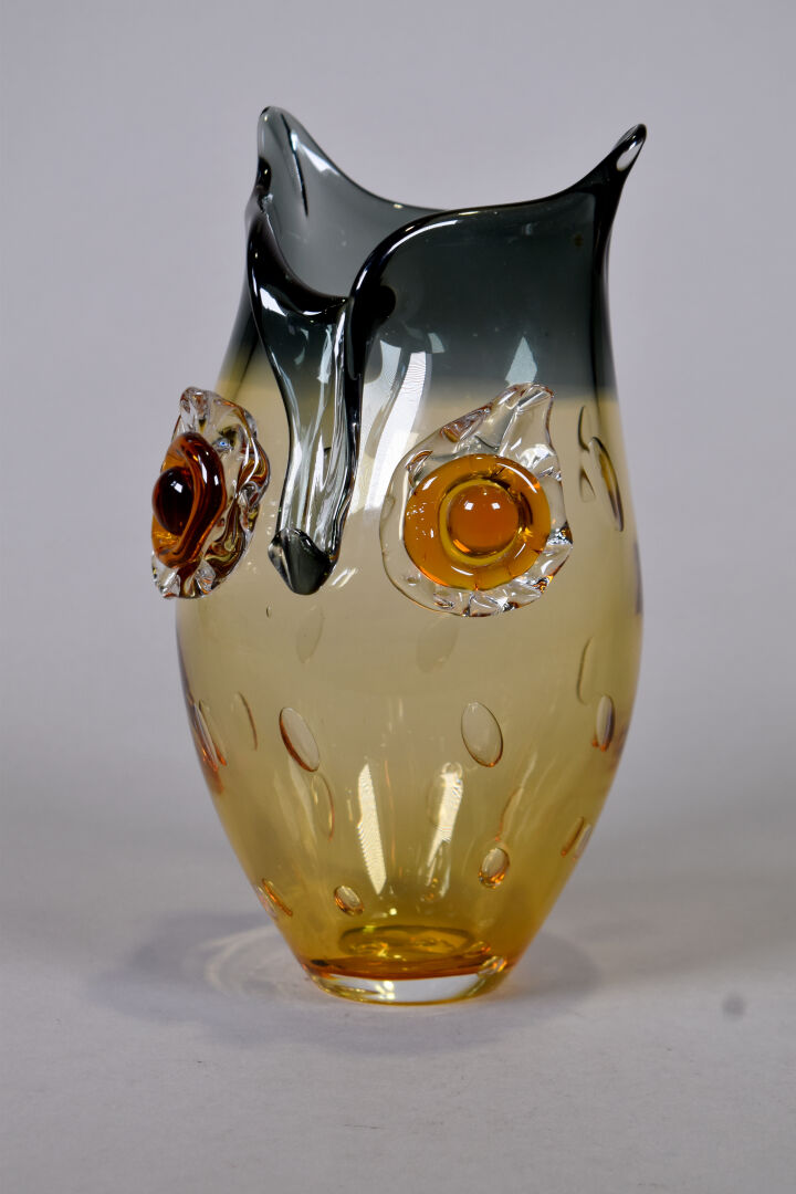 Vase en verre fumé et ambré figurant un hibou. Murano, XXe siècle. Haut. : 26 cm.