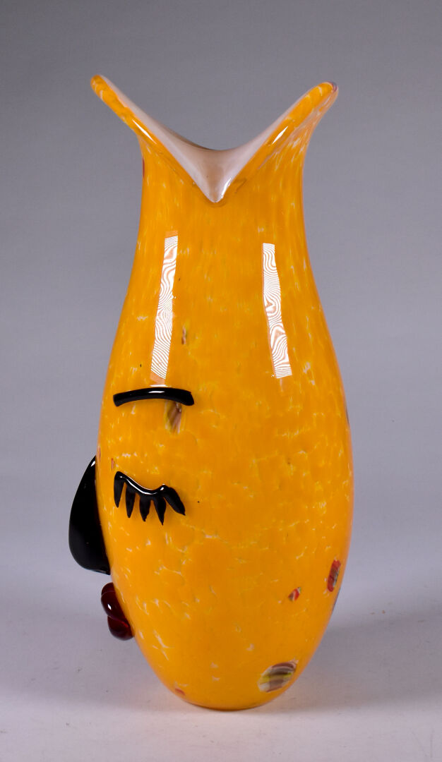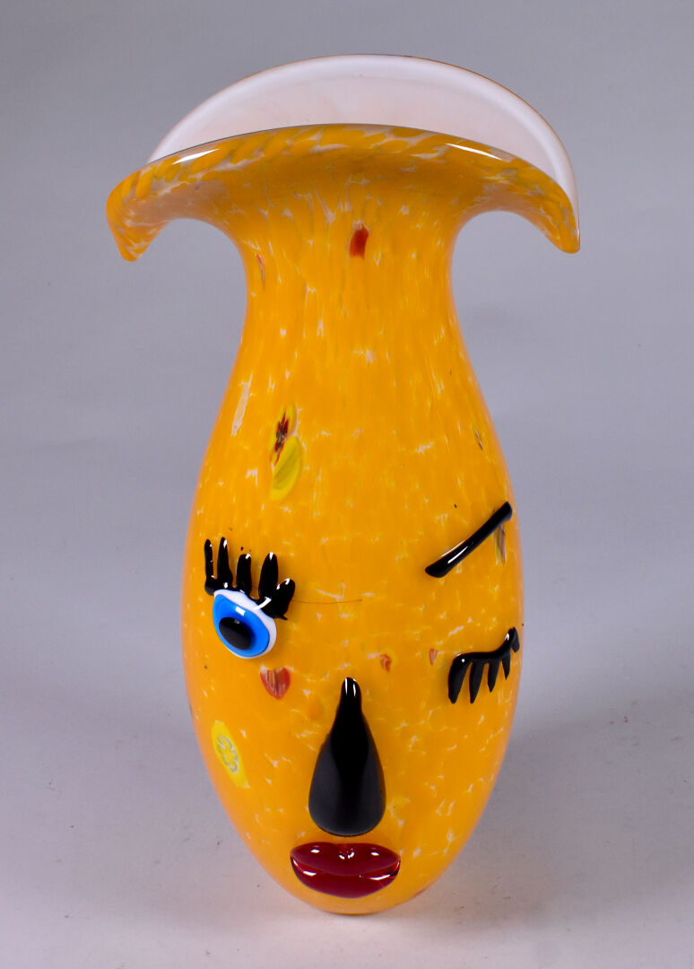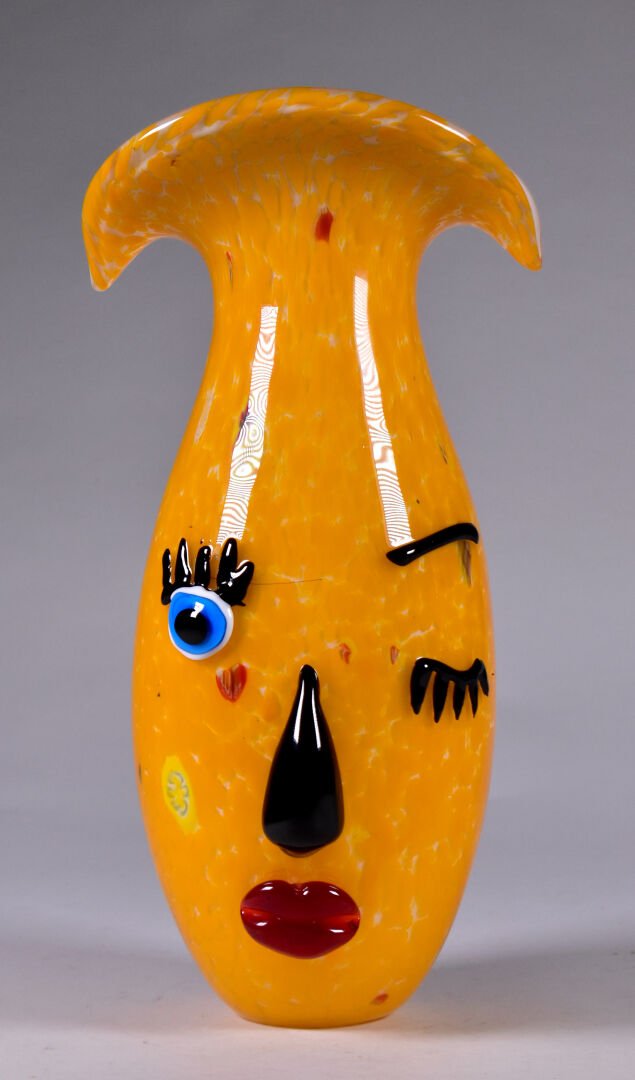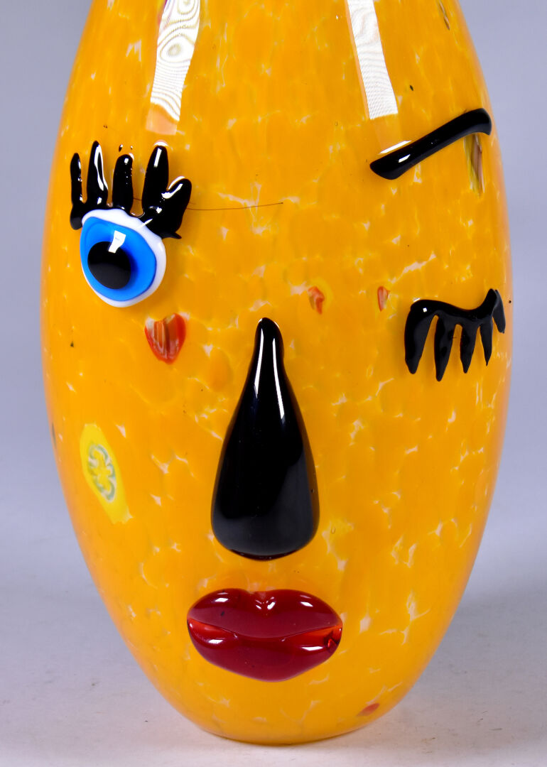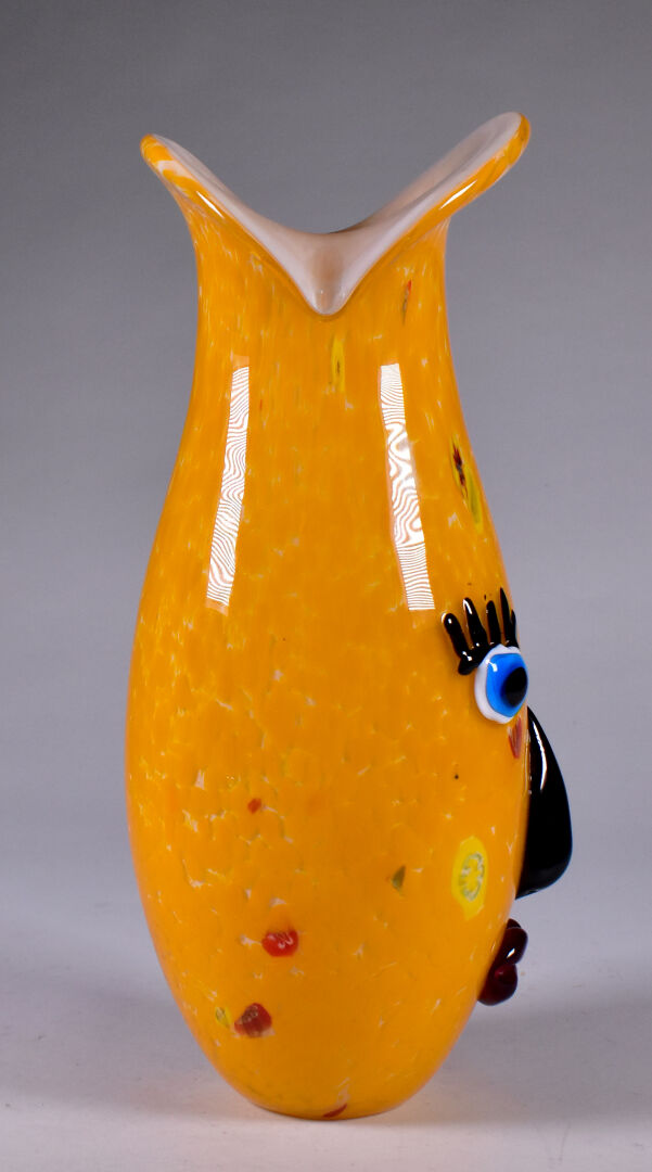 Vase en verre marmoréen orange à décor appliqué représentant un visage humain. Haut. : 39 cm.