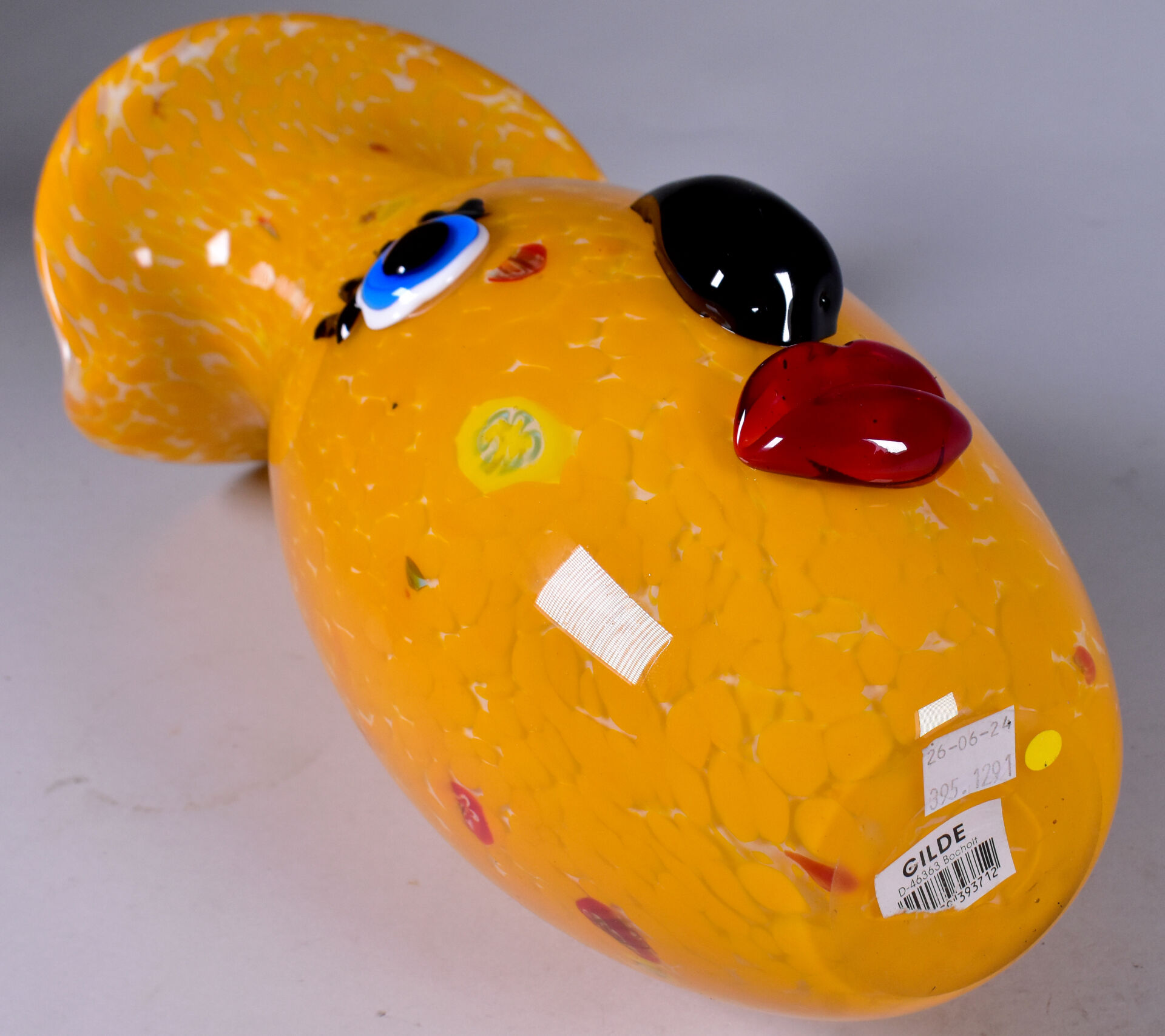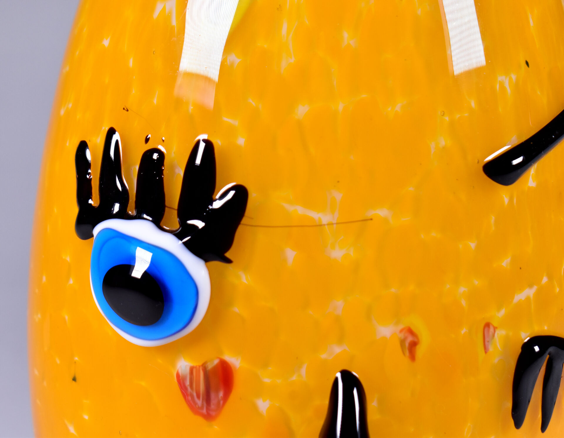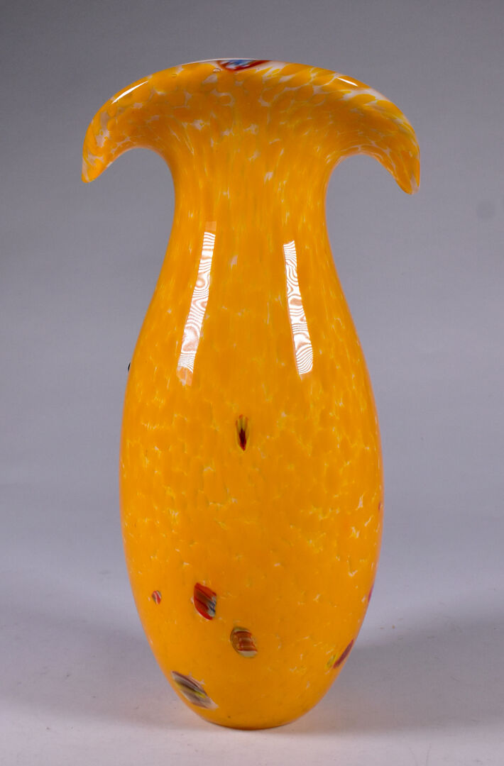 Vase en verre marmoréen orange à décor appliqué représentant un visage humain. Haut. : 39 cm.