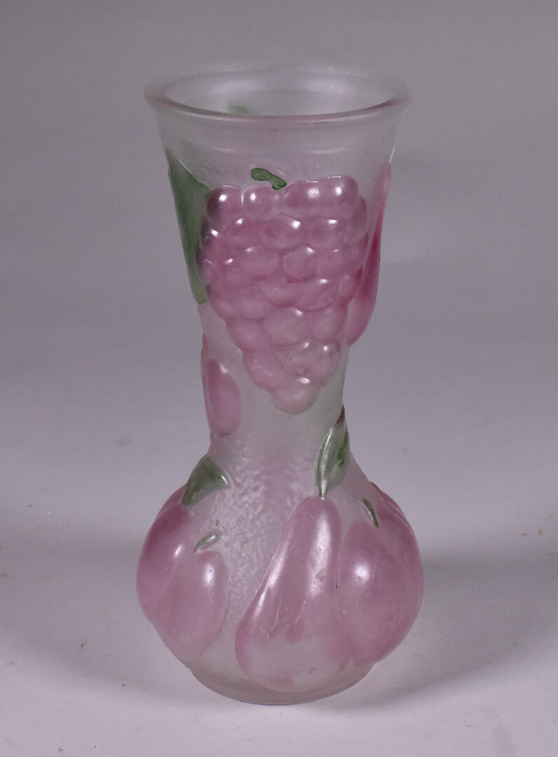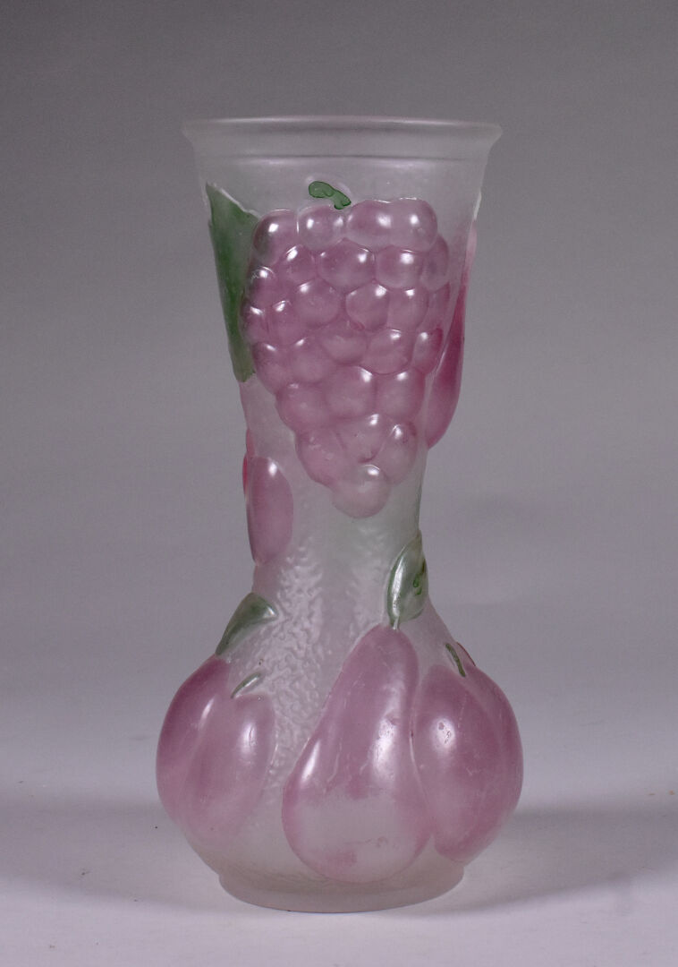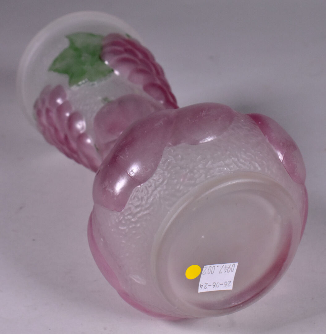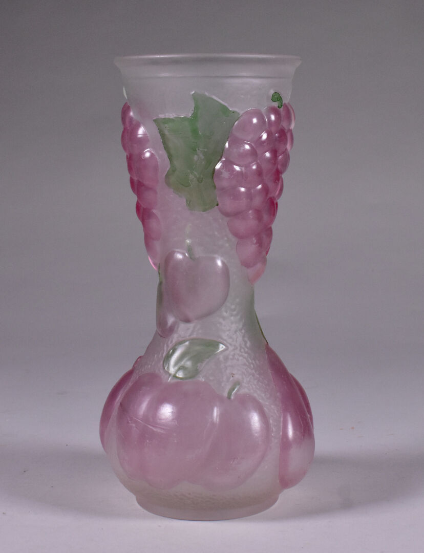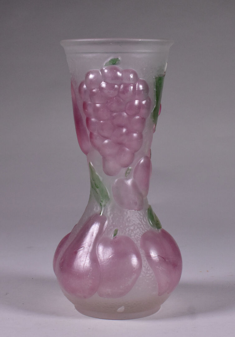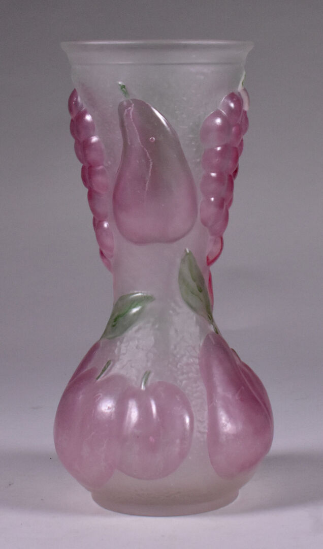 Vase en verre moulé rosé et dépoli à décor de fruits (usures, un défaut de cuisson). Haut. : 25 cm.