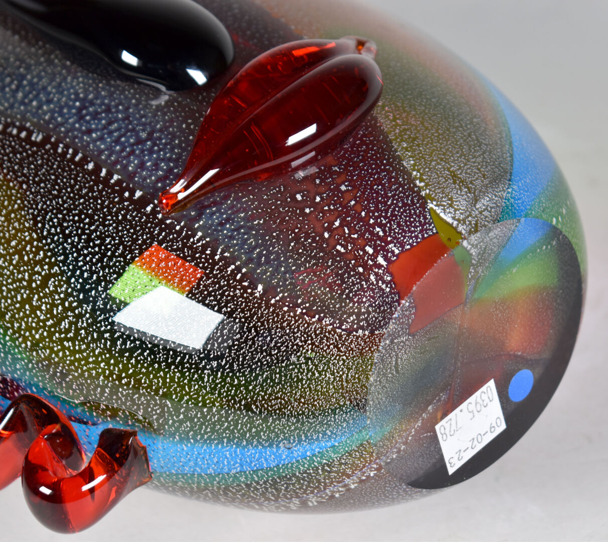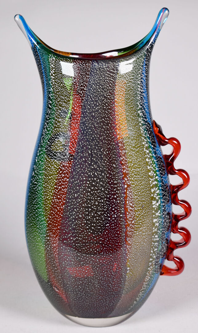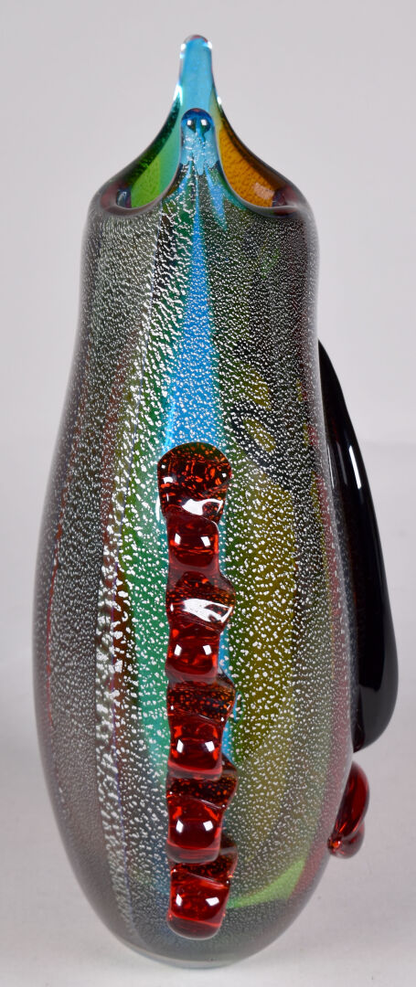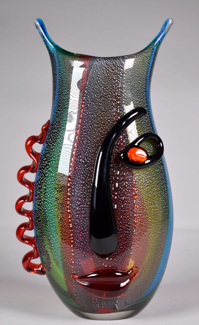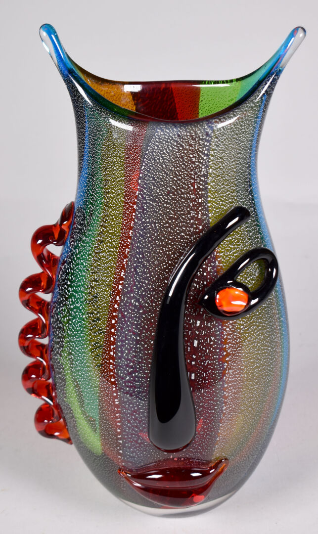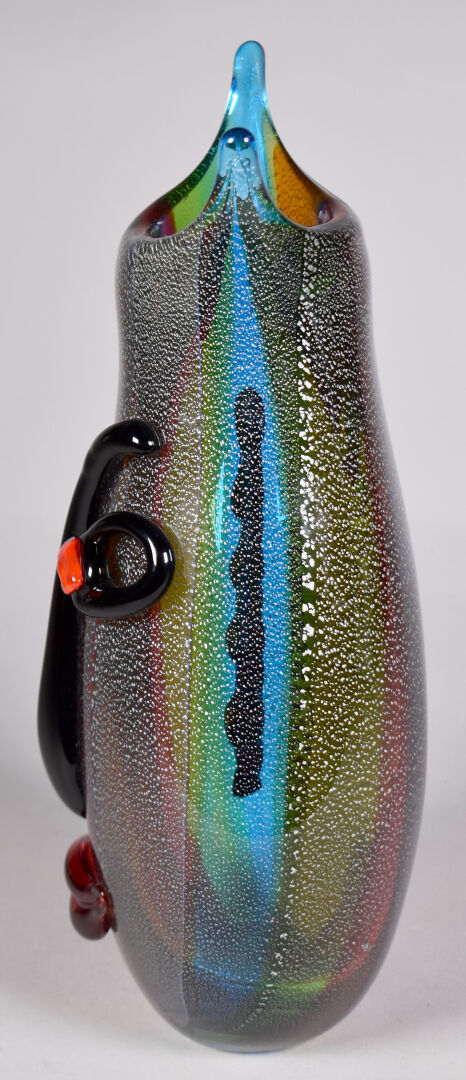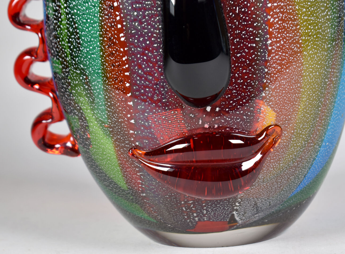 Vase en verre multicouche et appliqué rouge, vert bleu jaune figurant un visage humain. Probablement Murano, XXe siècle. Haut. : 34 cm.