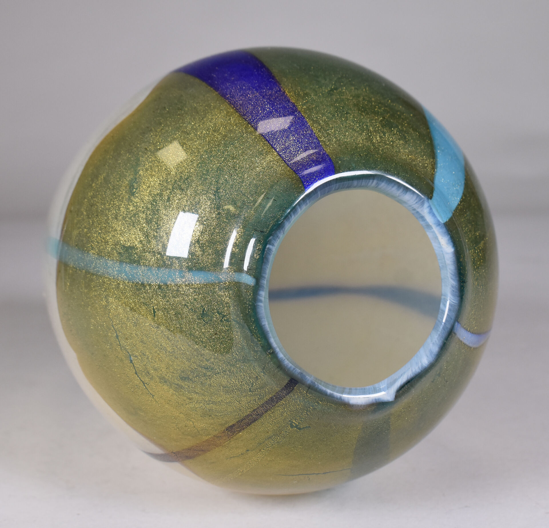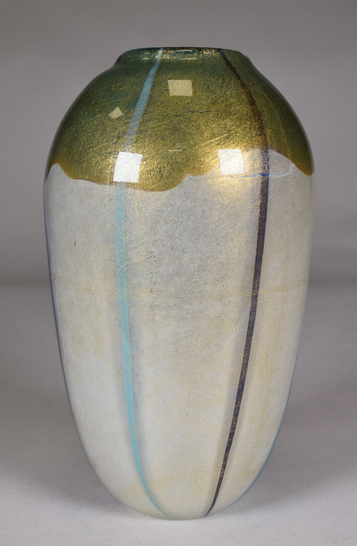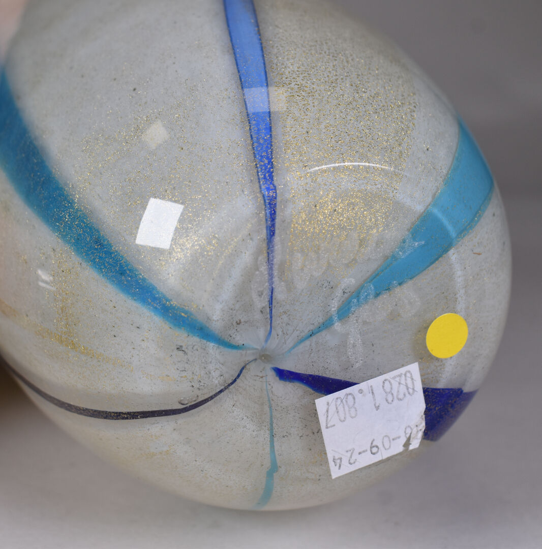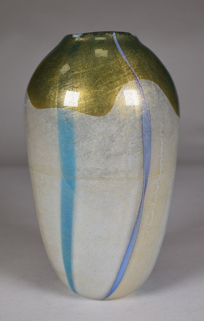 Vase fuseau en verre à décor de rubans bleu sur fond ocre et paillons or. Murano, XXe siècle. Haut. : 24 cm.