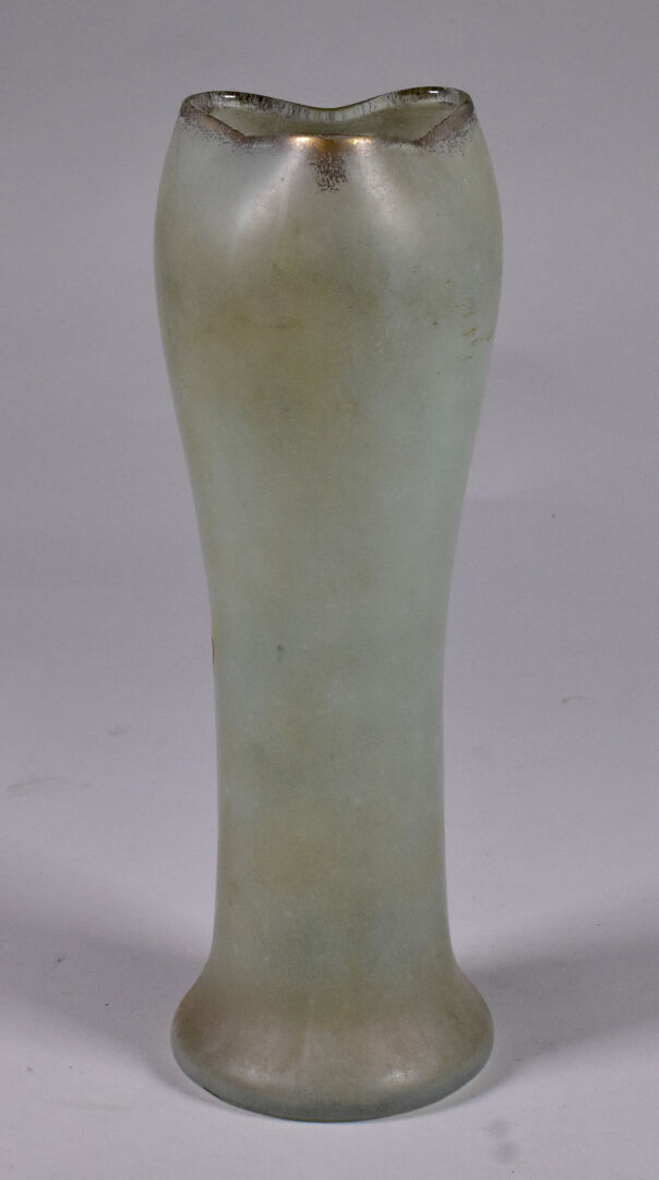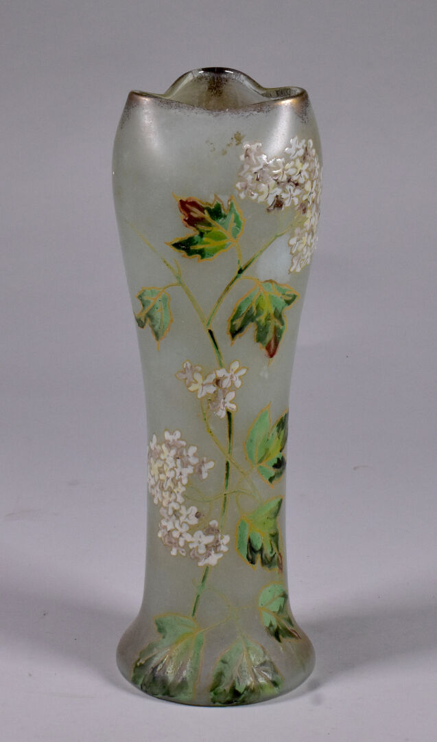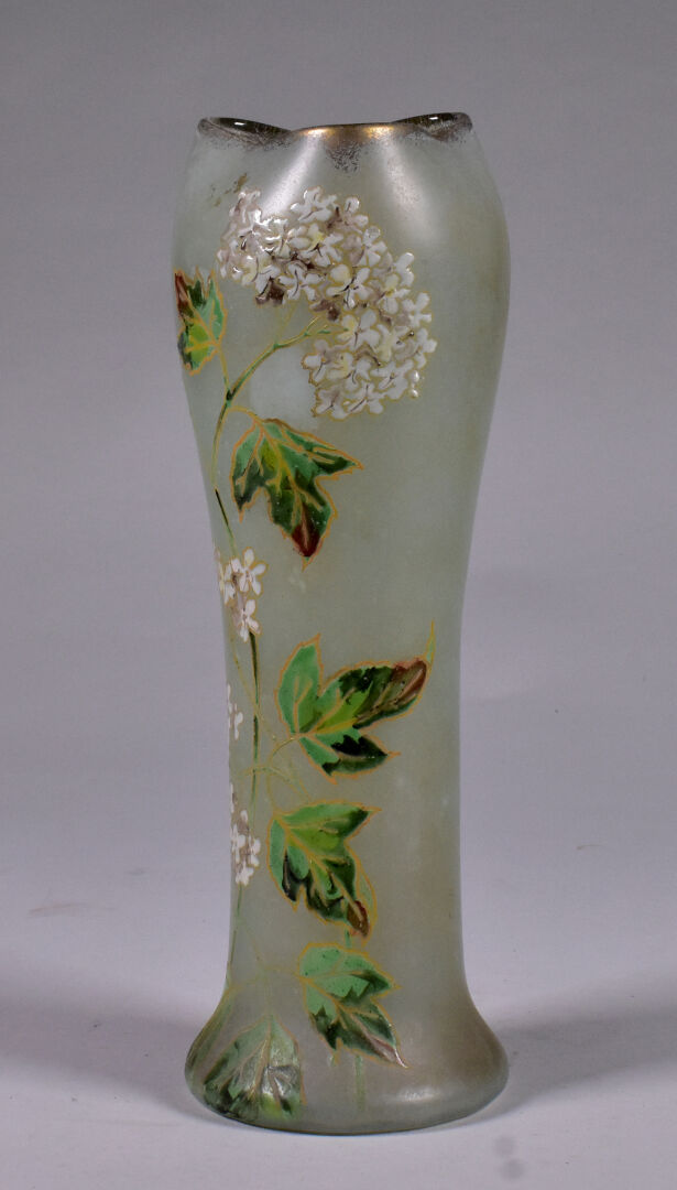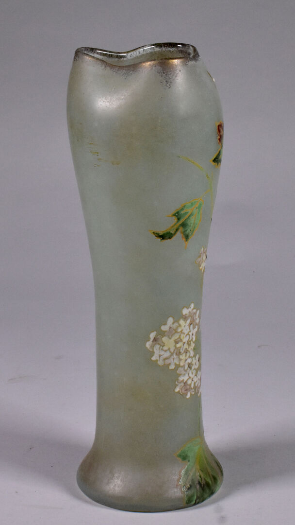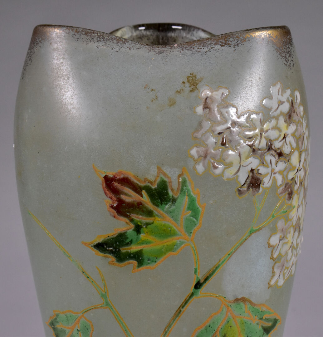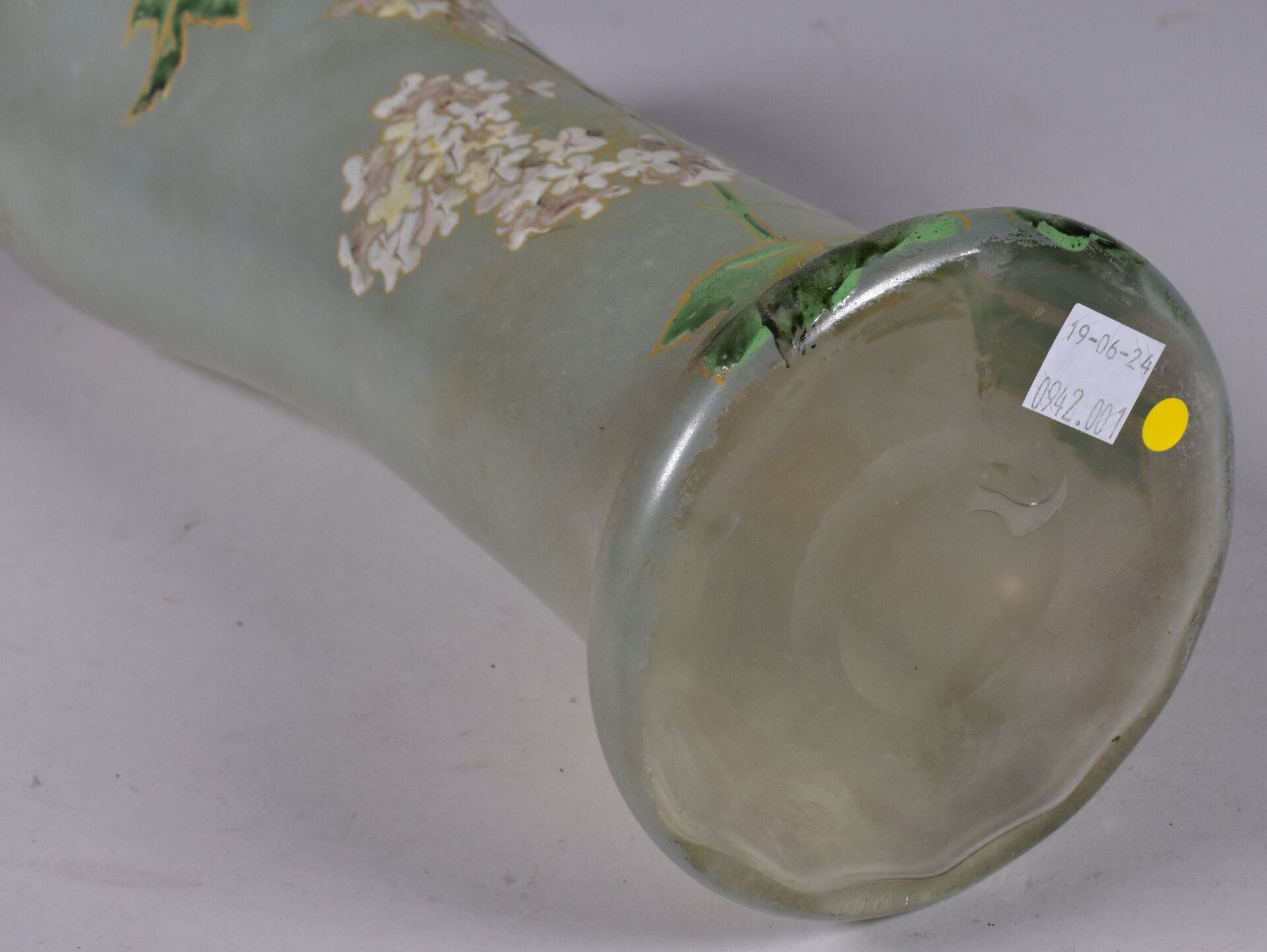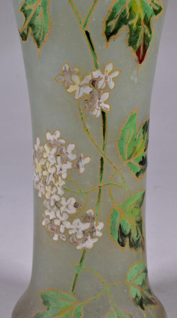 Vase fuselé à décor émaillé en polychromie de fleurs blanches (usures). Dans le goût de Legras, vers 1900. Haut. : 33 cm.