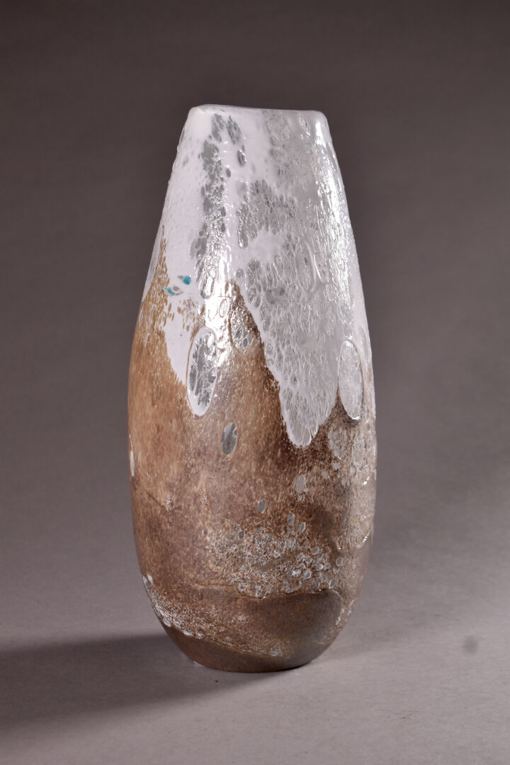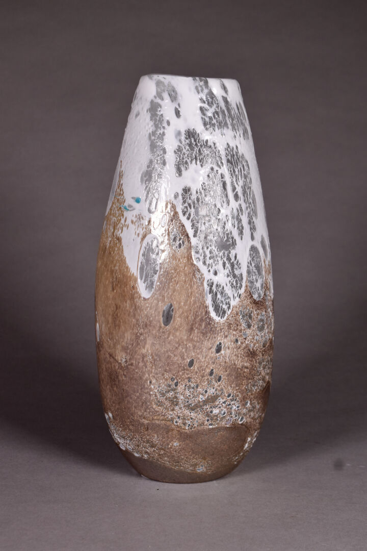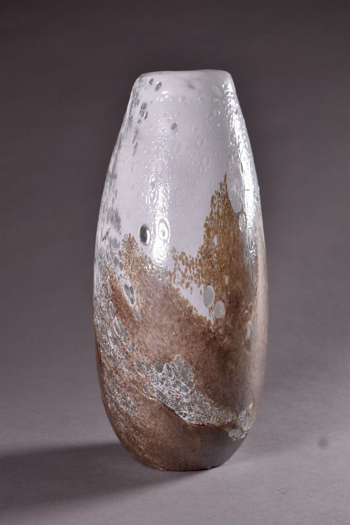 Vase fuselé en verre multicouche émaillé or et crème bullé. Haut. : 31 cm.