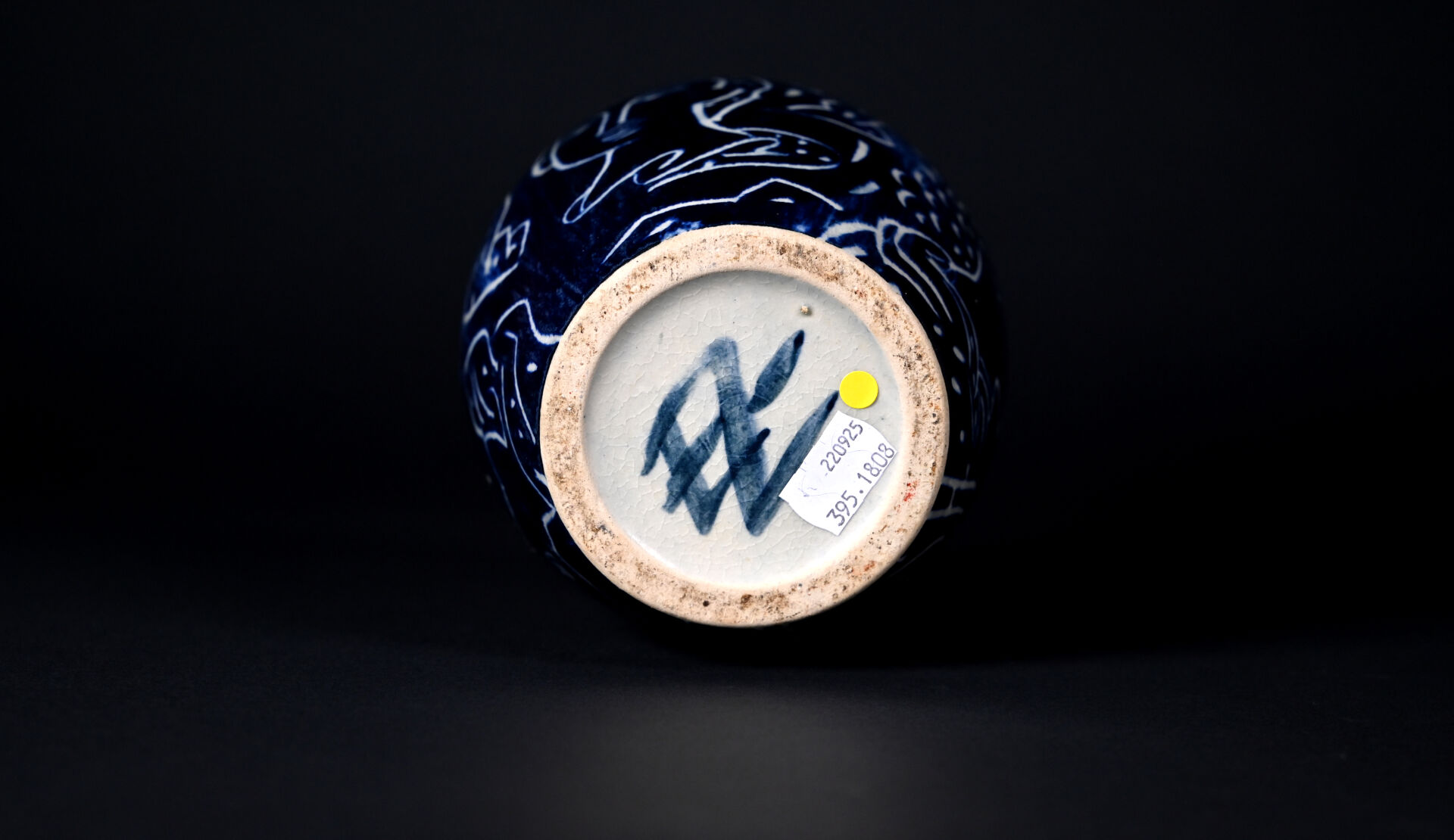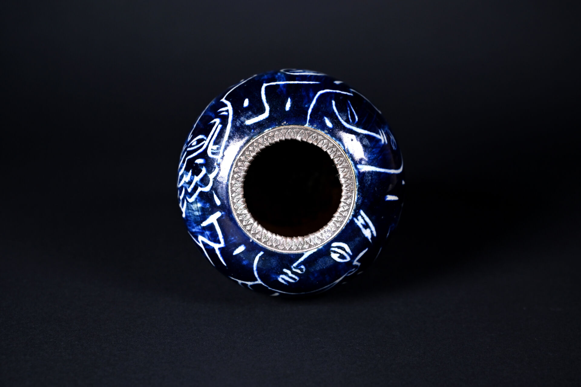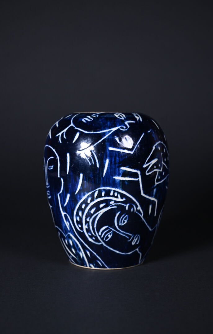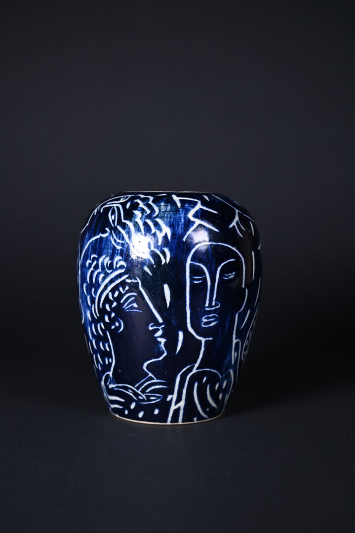 Vase légèrement balustre en céramique à décor émaillé de visages d’inspiration grecque sur fond bleu. Le col cerclé de métal gris. Signé au dessous. Haut. : 17,5 cm.