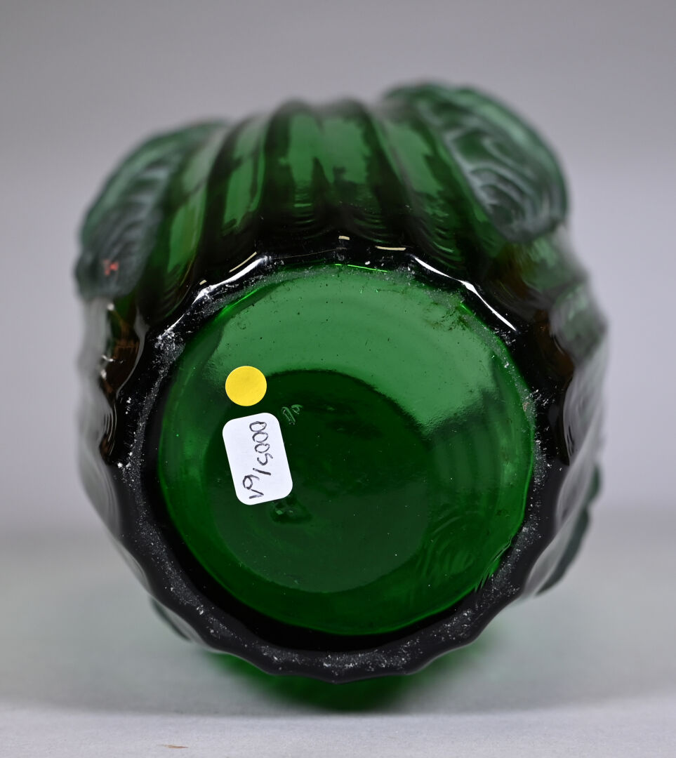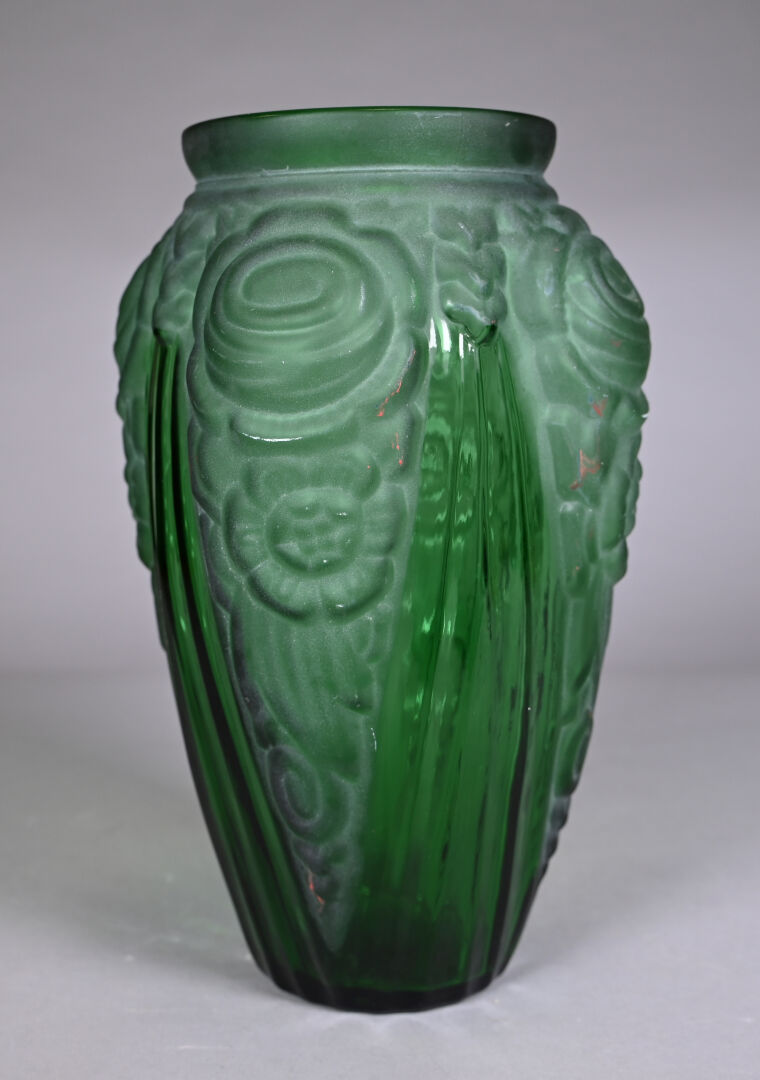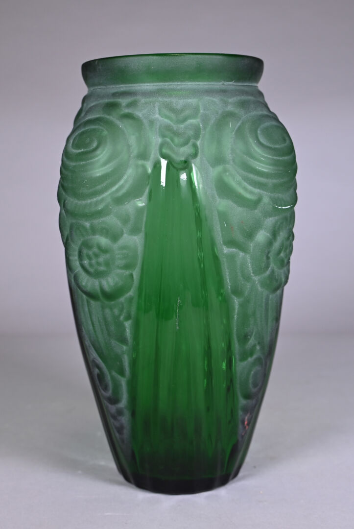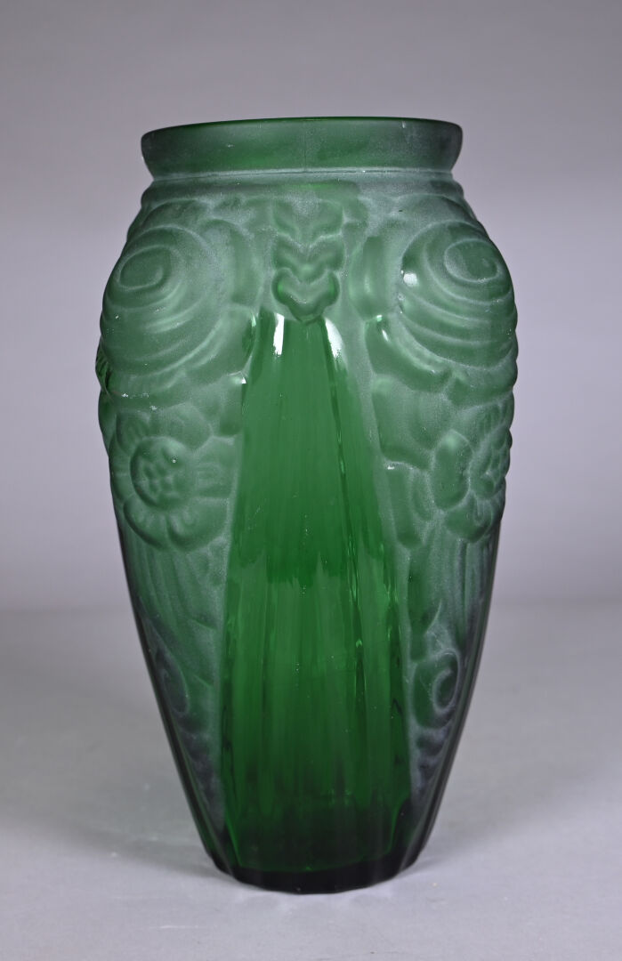 Vase légèrement balustre en verre moulé vert partiellement dépoli à décor de fleurs en relief. Epoque Art déco. Haut. : 31,5 cm.