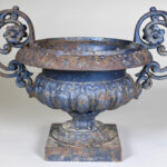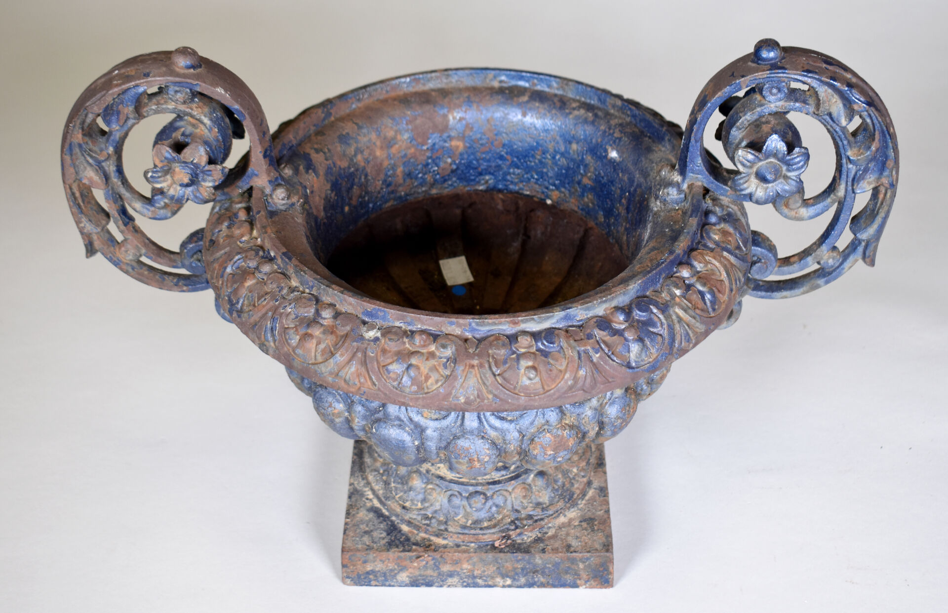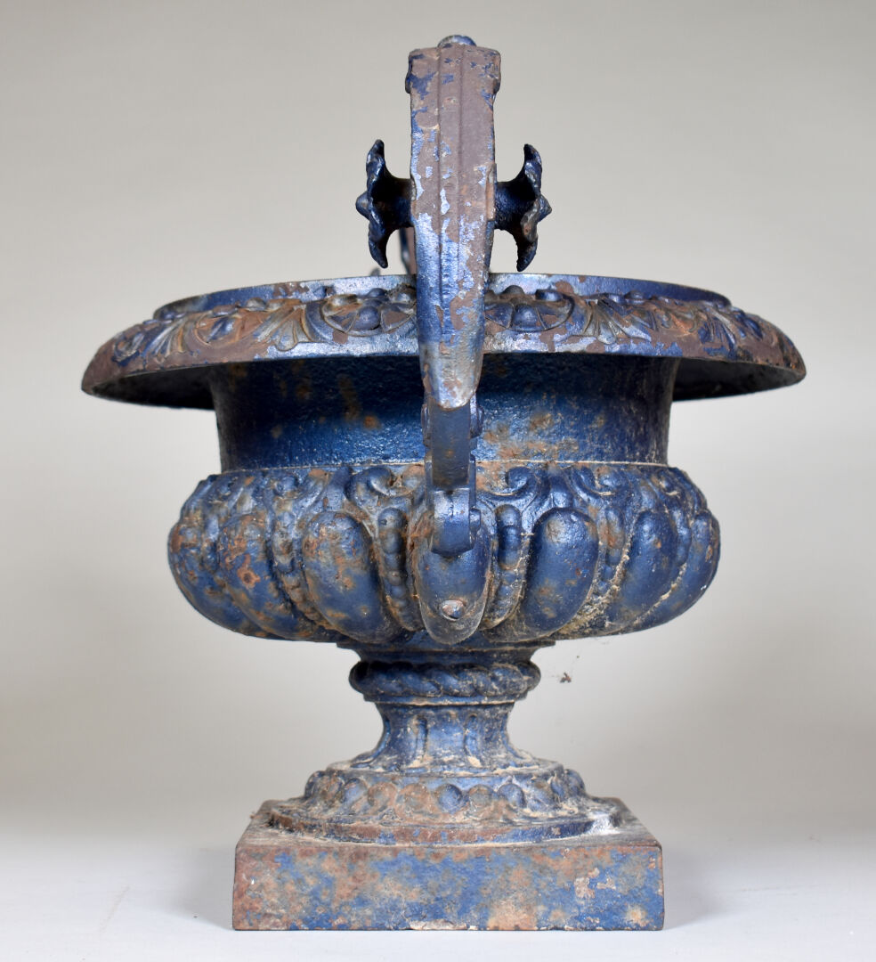 Vase Médicis à anses enroulées en fonte relaquée bleue (usure et sauts de peinture, rouille). Haut. : 31 cm. Diam. : 43 cm.