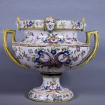 Vase médicis en faïence à décor de grand feu de fleurs, le col orné de quatre mascarons (petits éclats et fèles). Dans le goût de Moustier ou Nevers. Haut. : 36 cm.