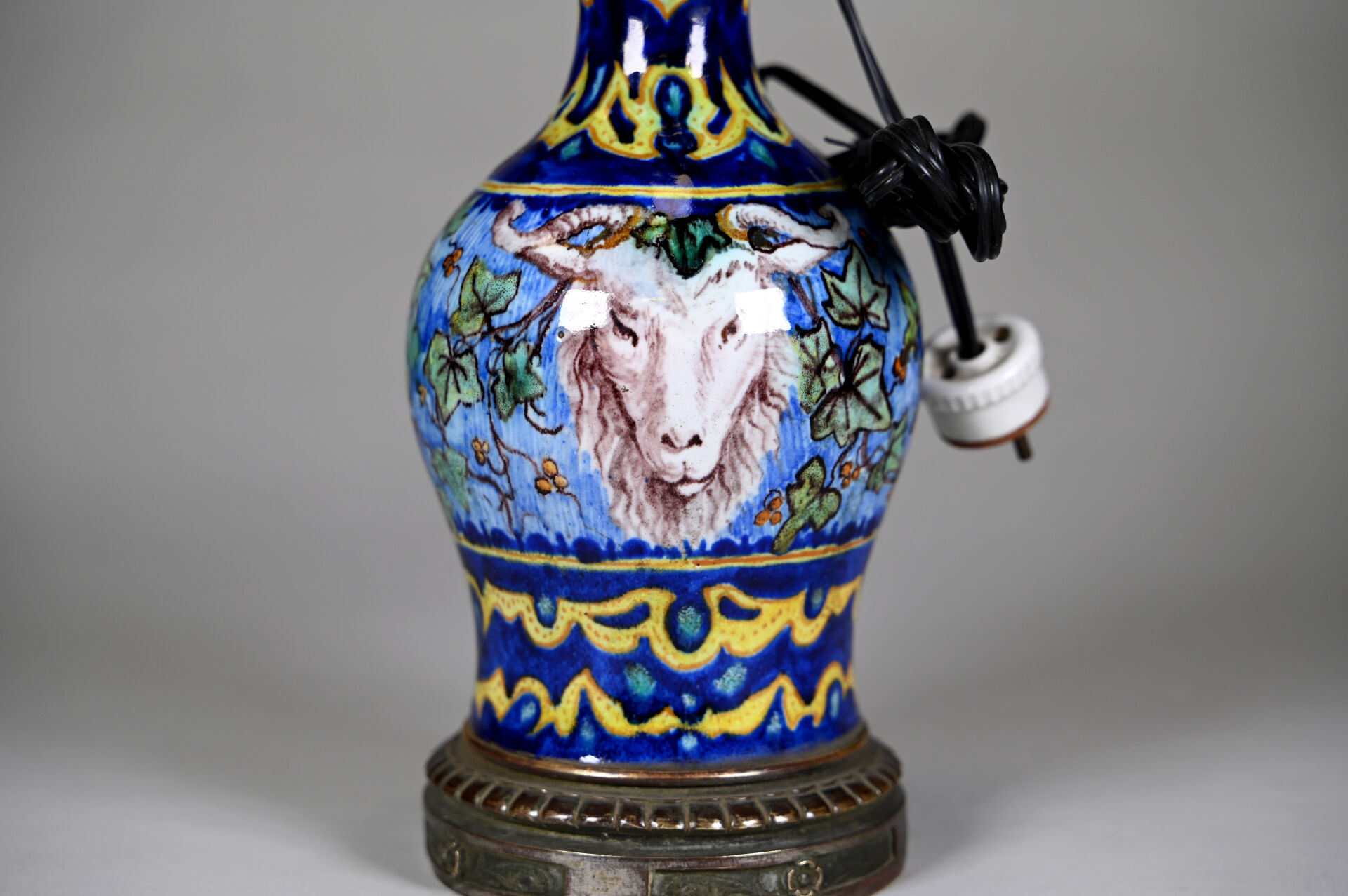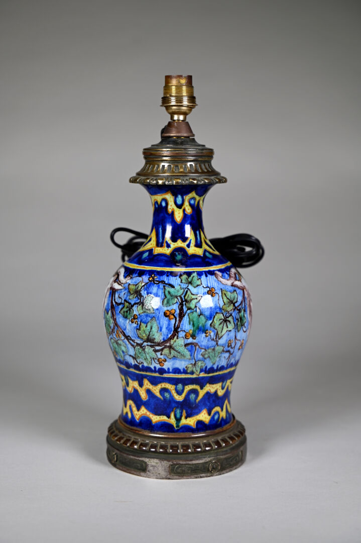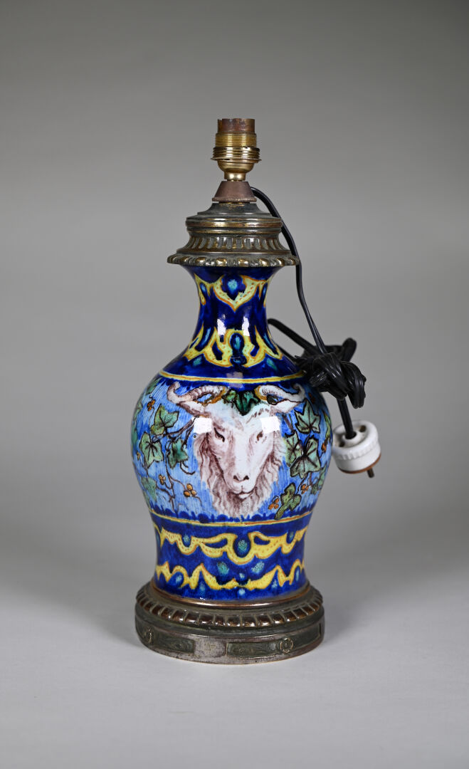 Vase monté en lampe à poser en faïence à décor de grand feu dans le goût italien du XVIe siècle d’une tête de bélier et pampres de vigne. La monture en bronze. XXe siècle. Haut. : 35 cm (avec douille).