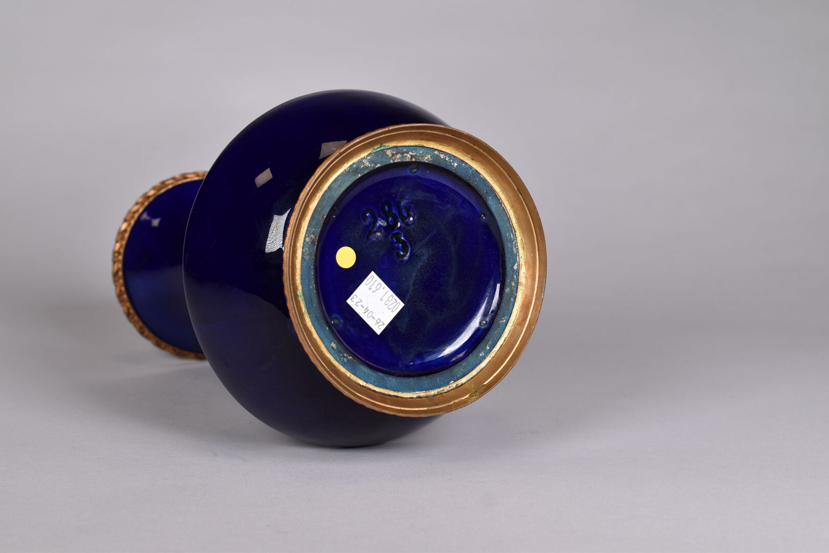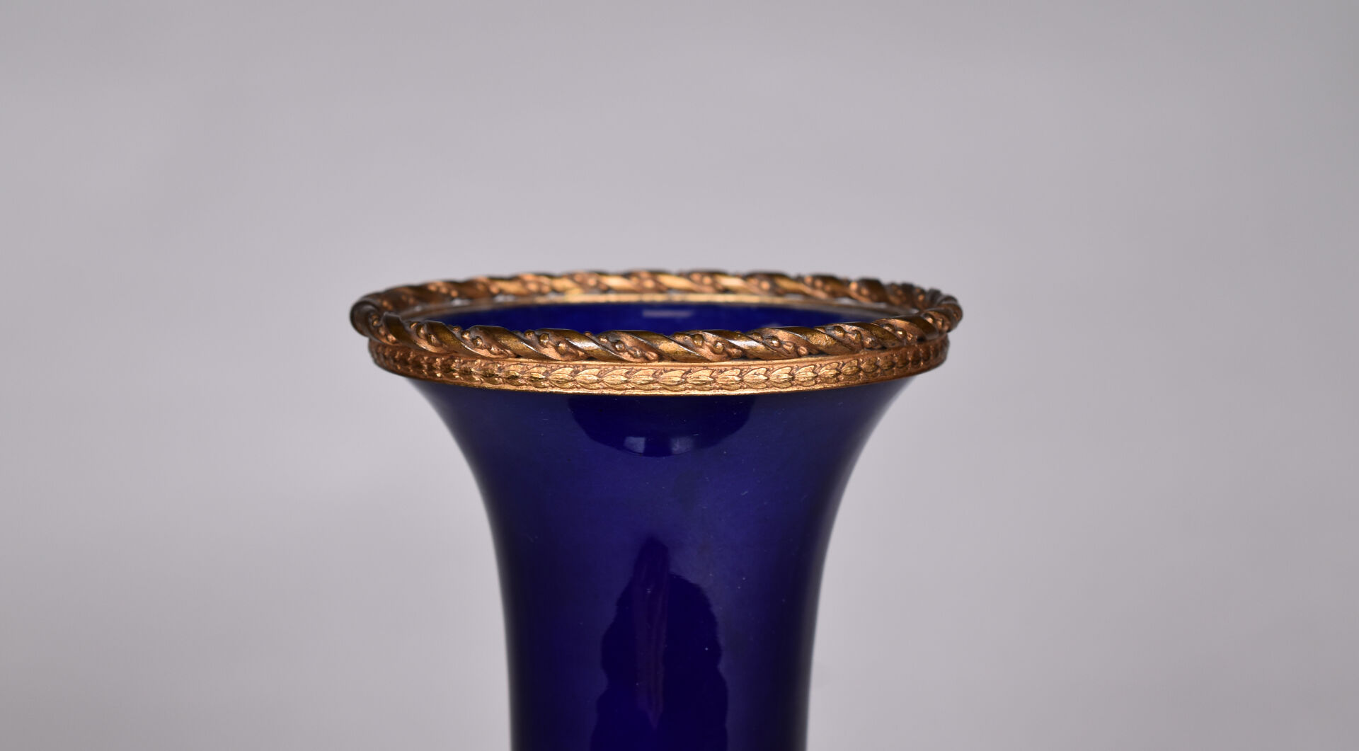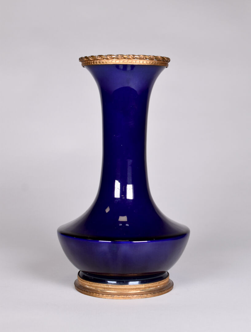 Vase monté en porcelaine émaillée bleue de Sèvres, la monture en métal (un accident de cuisson). Haut. : 27 cm.
