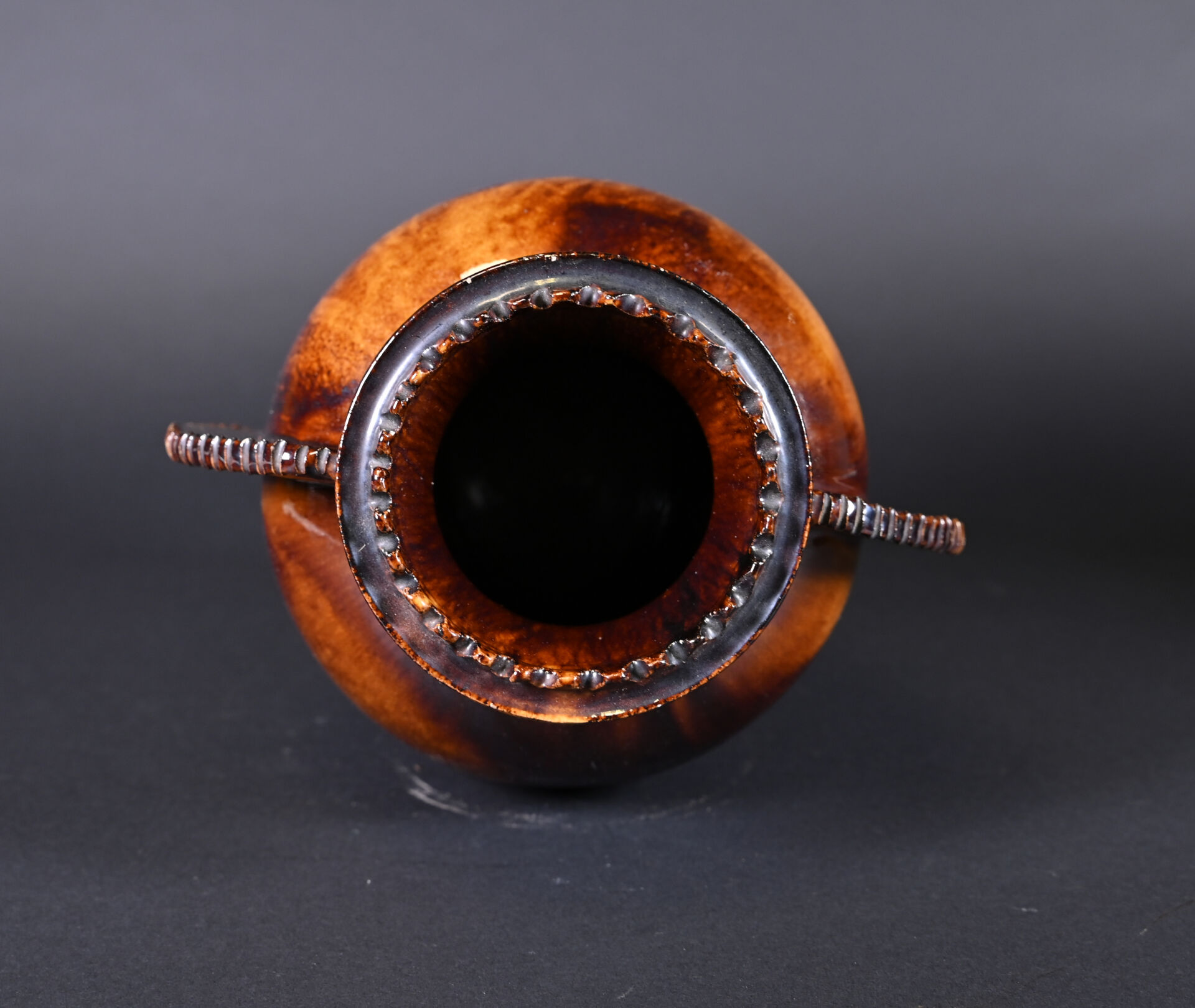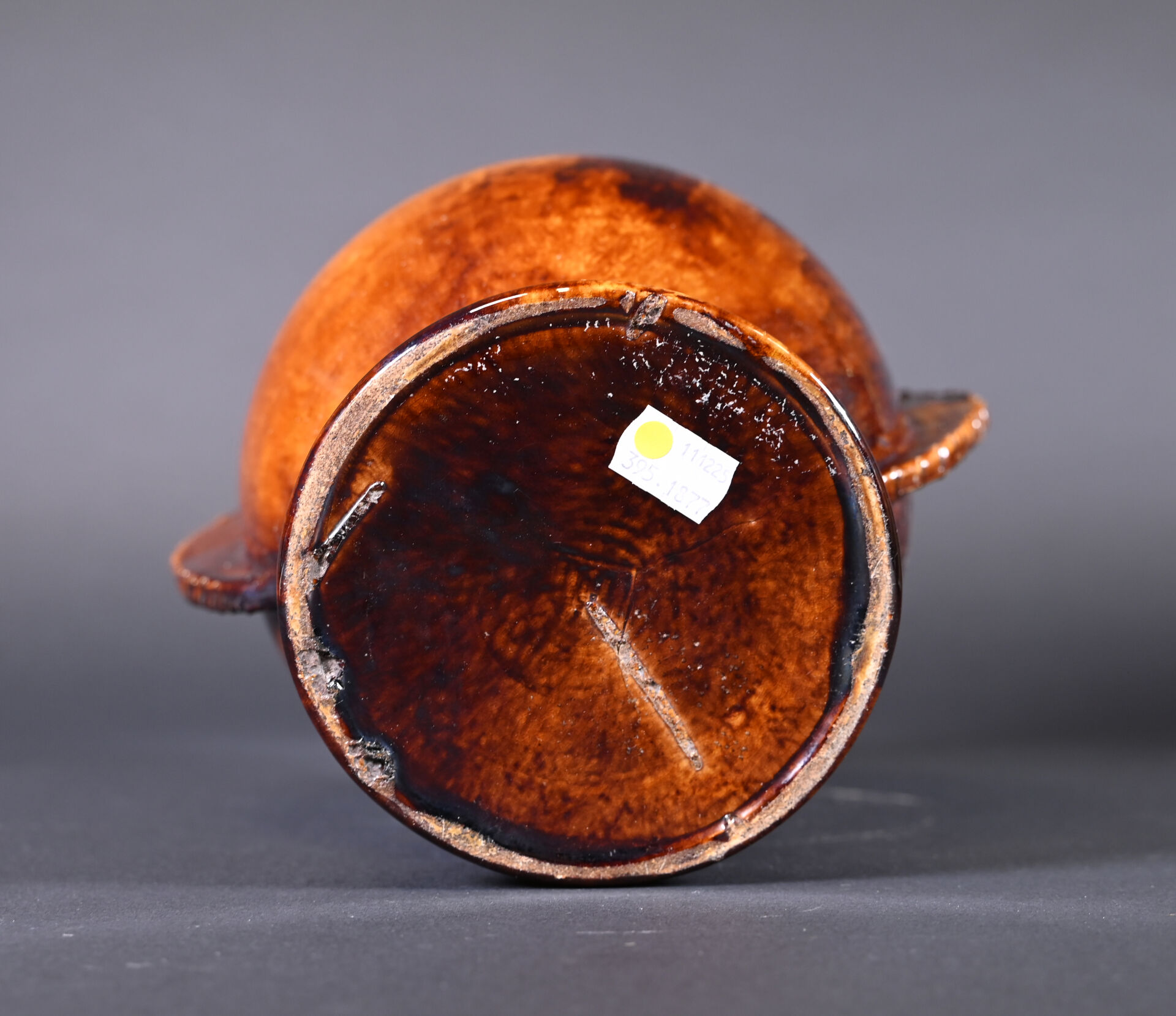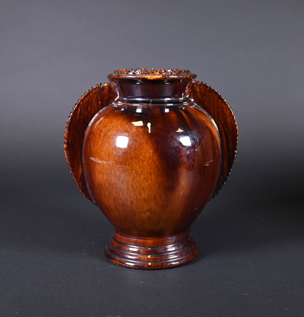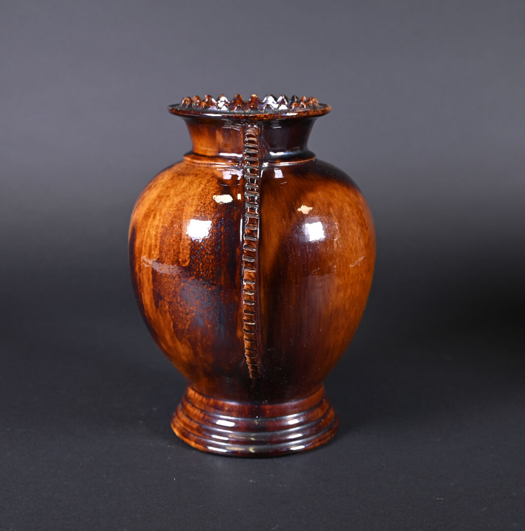 Vase ovoïde à anses et pietement en gradin en céramique vernissée chocolat. Le col et les anses dentelés. Vers 1930/1940. Haut. : 27 cm.