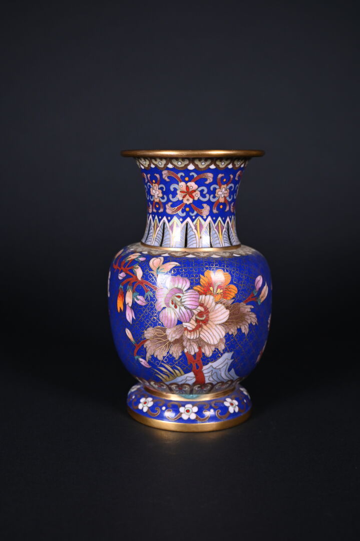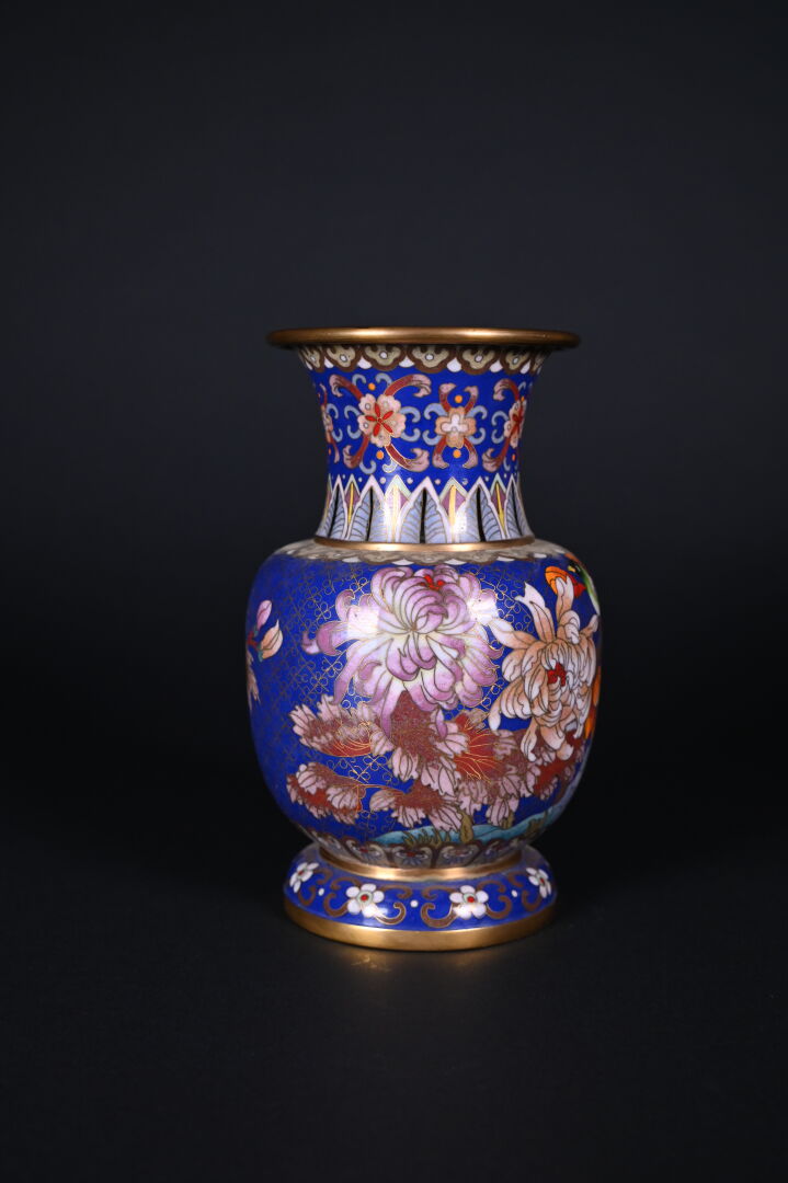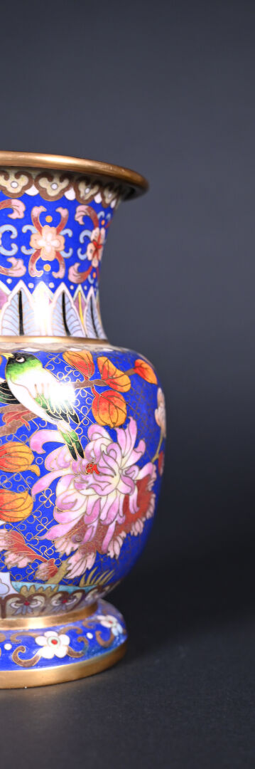 Vase ovoïde à haut col à décor polychrome en émaux cloisonnés d’oiseaux branchés et pivoines sur fond bleu roi (manques). Chine, XXe siècle. Haut. : 23 cm.