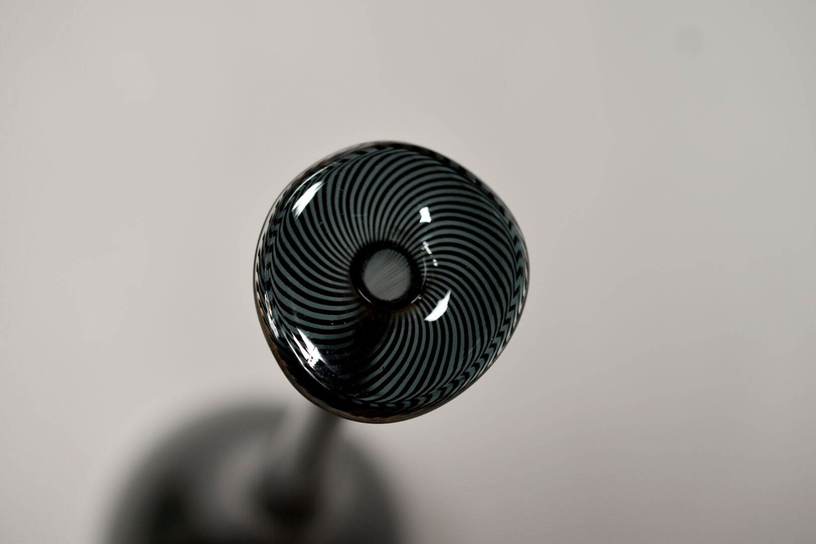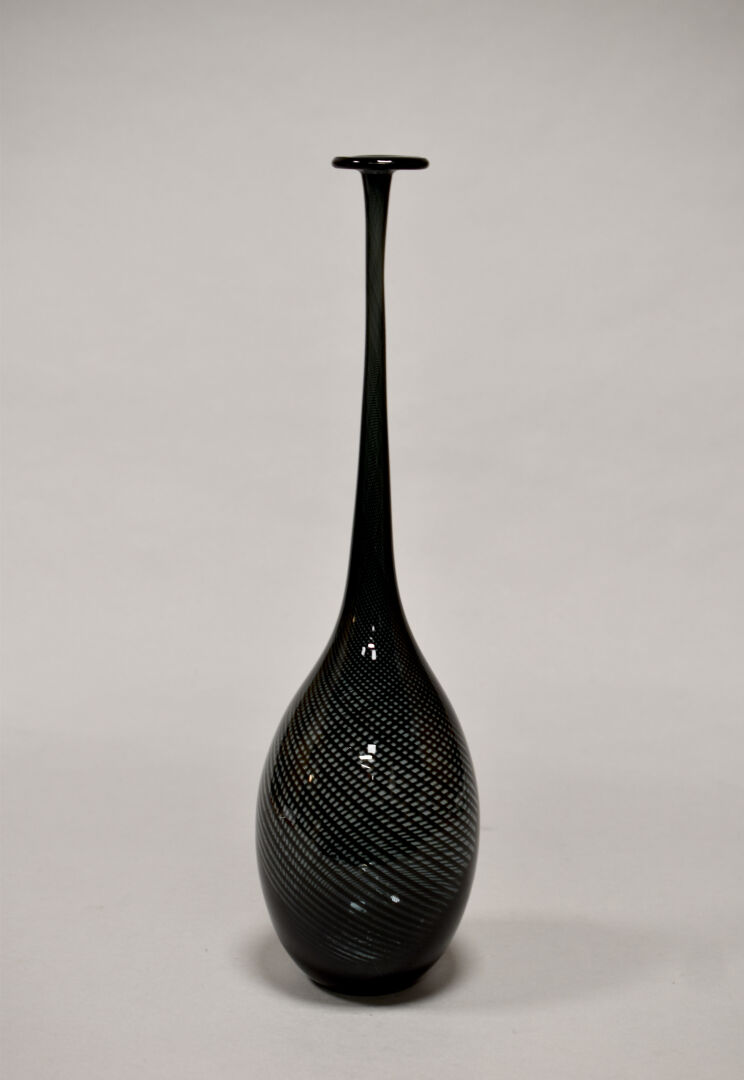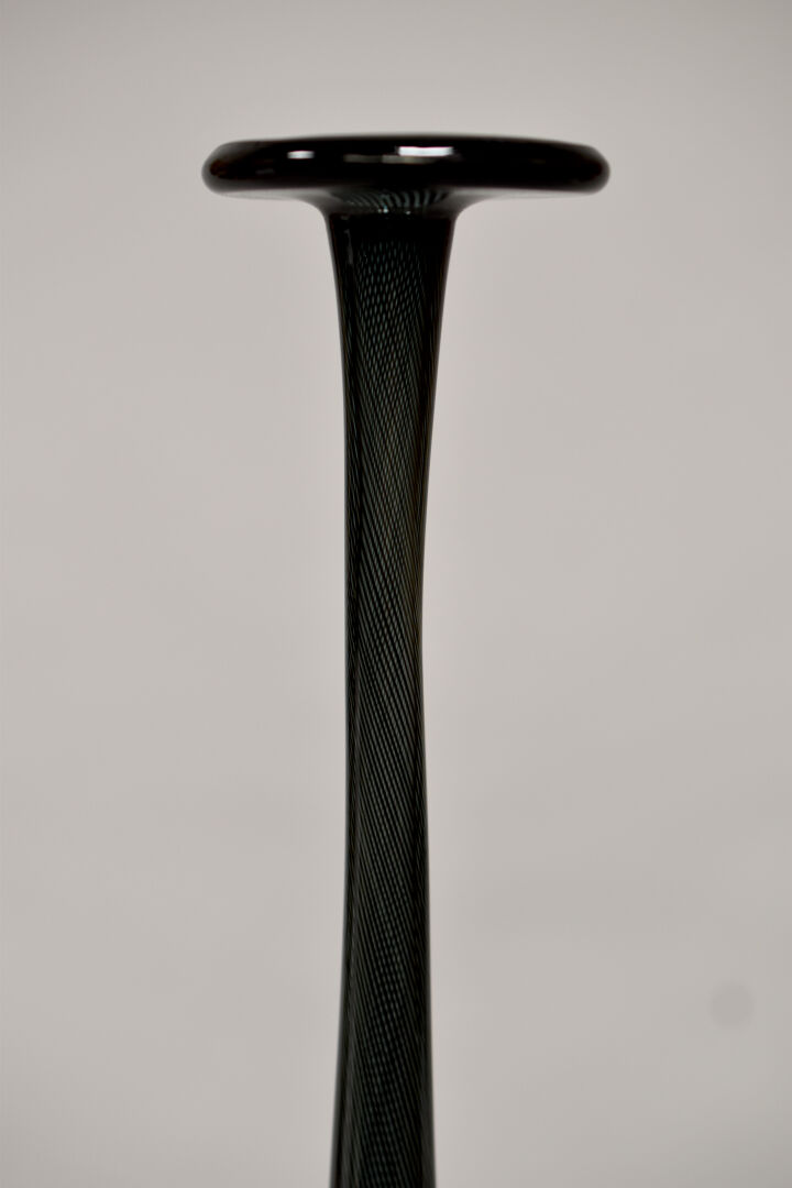 Vase ovoïde à très haut col en verre filigranné noir. Travail italien, XXe siècle. Haut. : 47,5 cm.