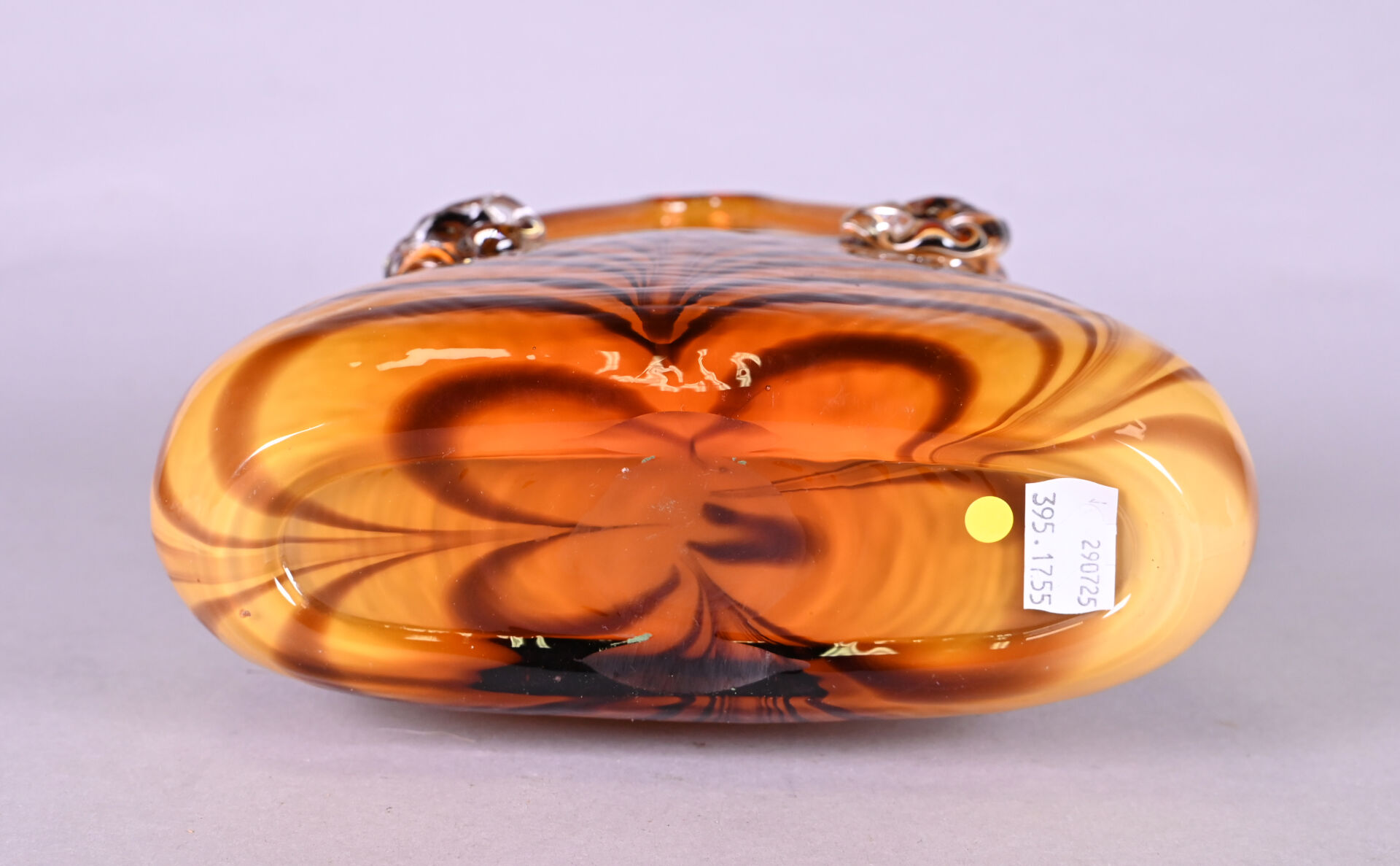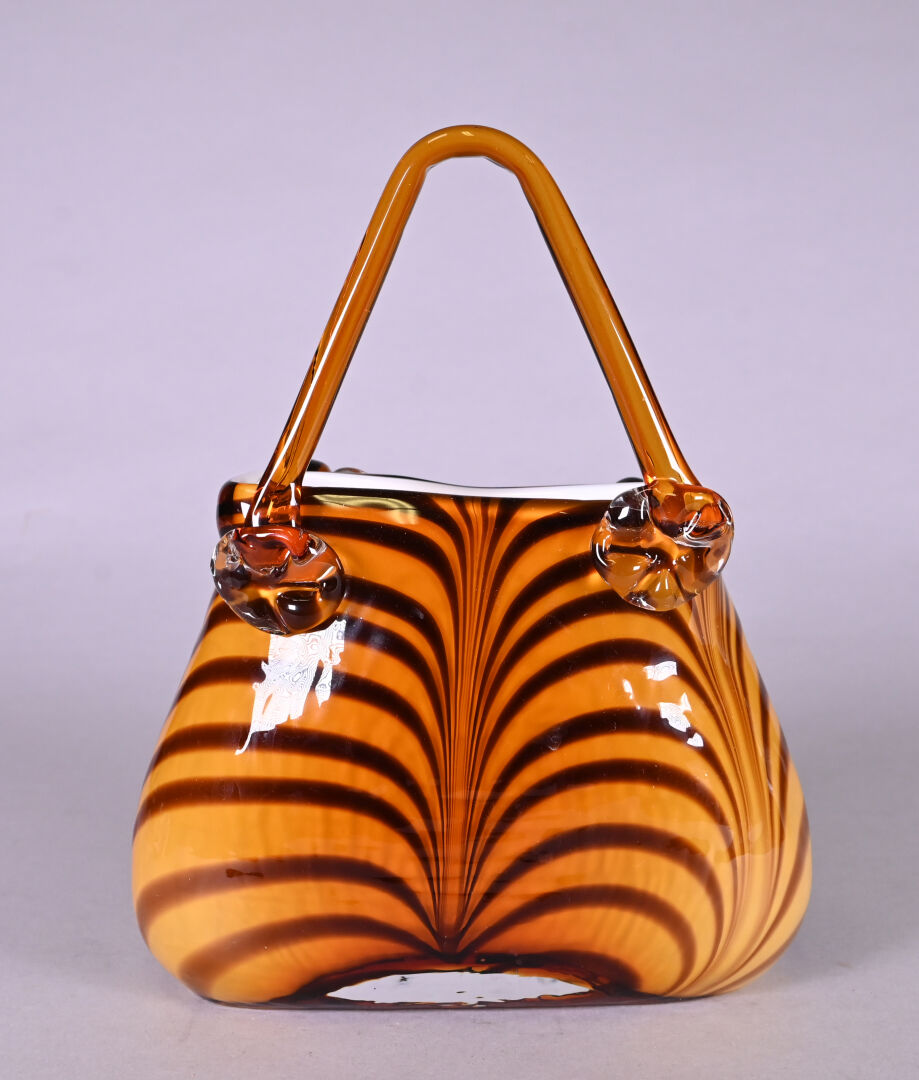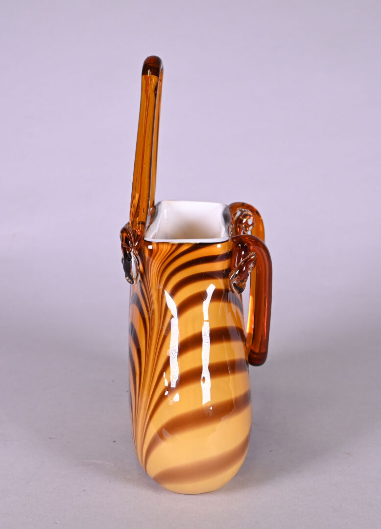Vase panier en verre ambré à rayures en brun. L’intérieur blanc. Probablement Murano, XXe siècle. Haut. : 27 cm.