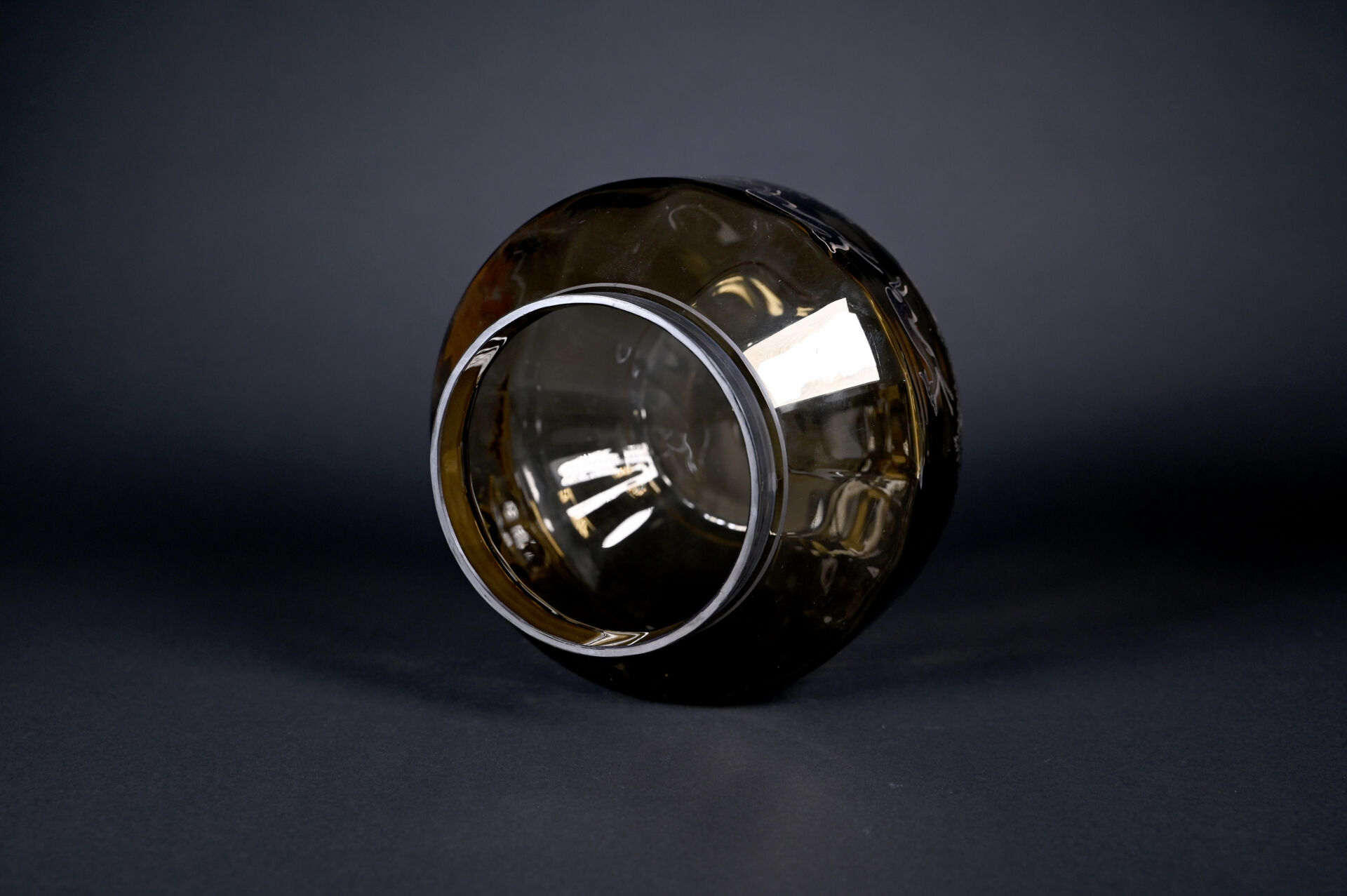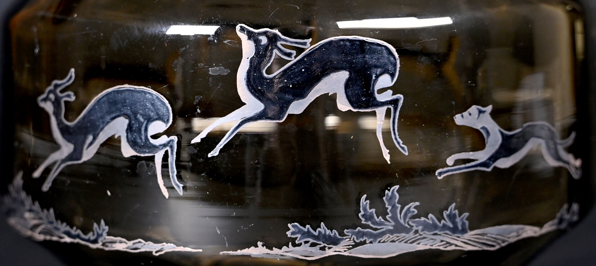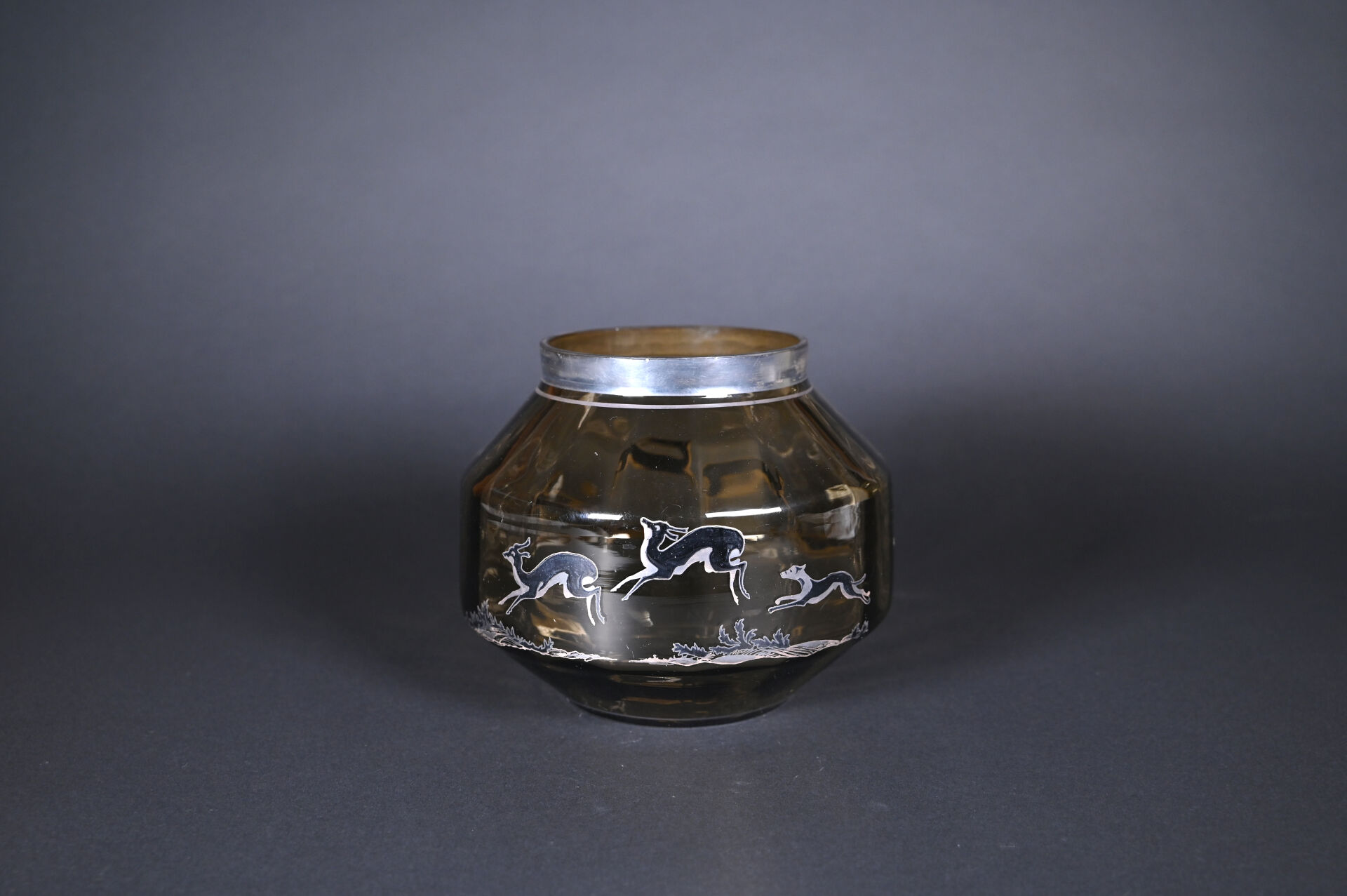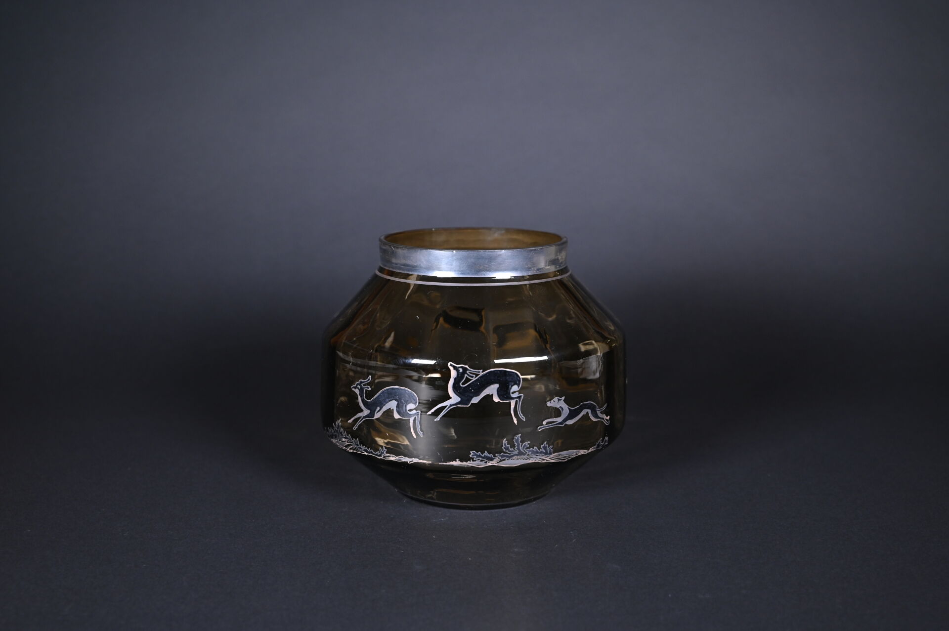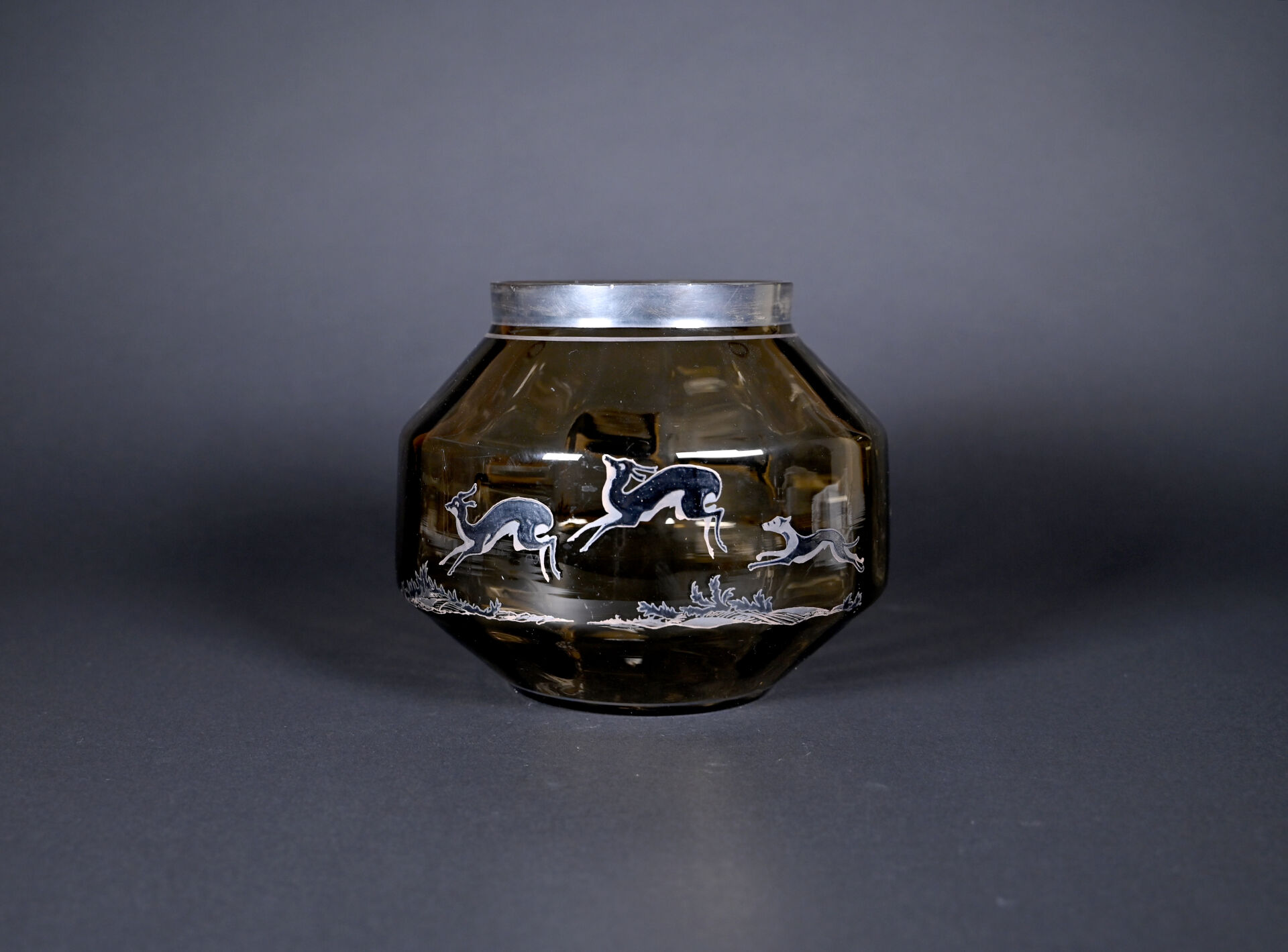 Vase pansu facetté en verre fumé et émaillé argent et noir à décor tournant d’une chasse aux biches. Vers 1930. Haut. : 19 cm – Larg. : 21 cm.