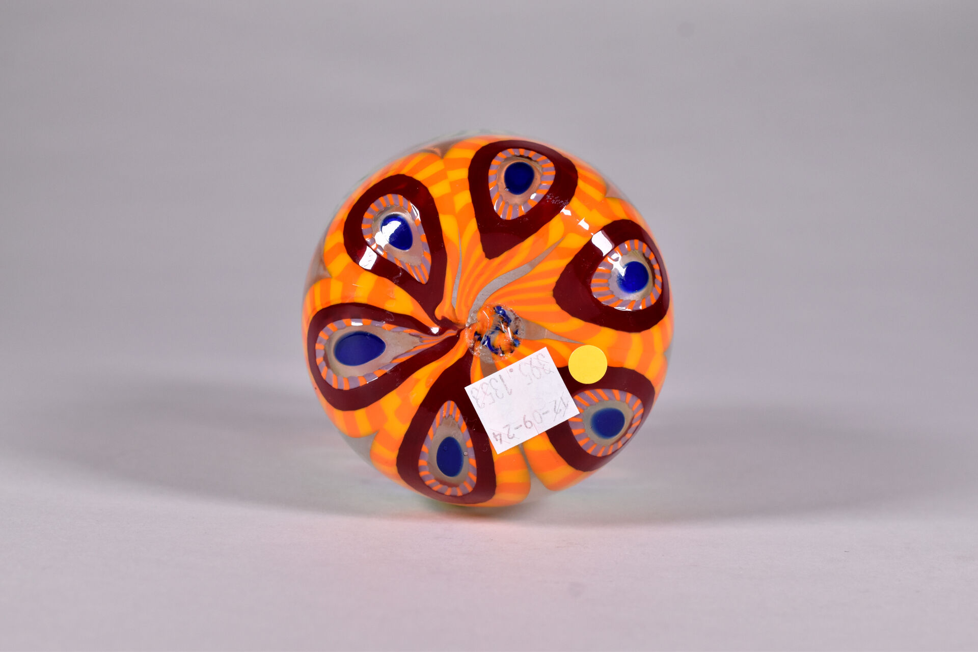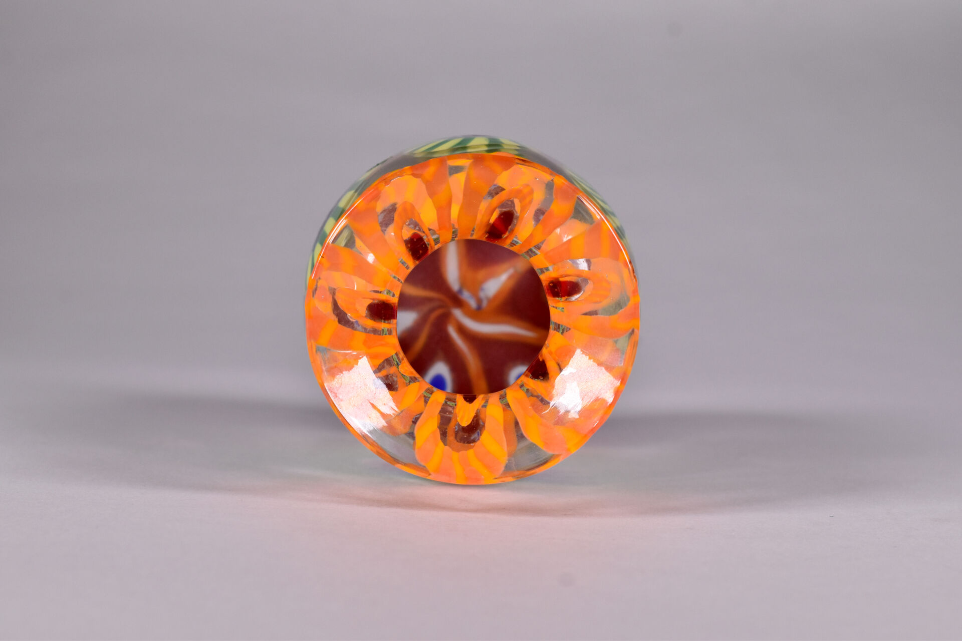 Vase rouleau à col à col resserré en verre à motif géométrique émaillé en orange, vert bleu et rouge. Dans le goût de Murano. Haut. : 16 cm.
