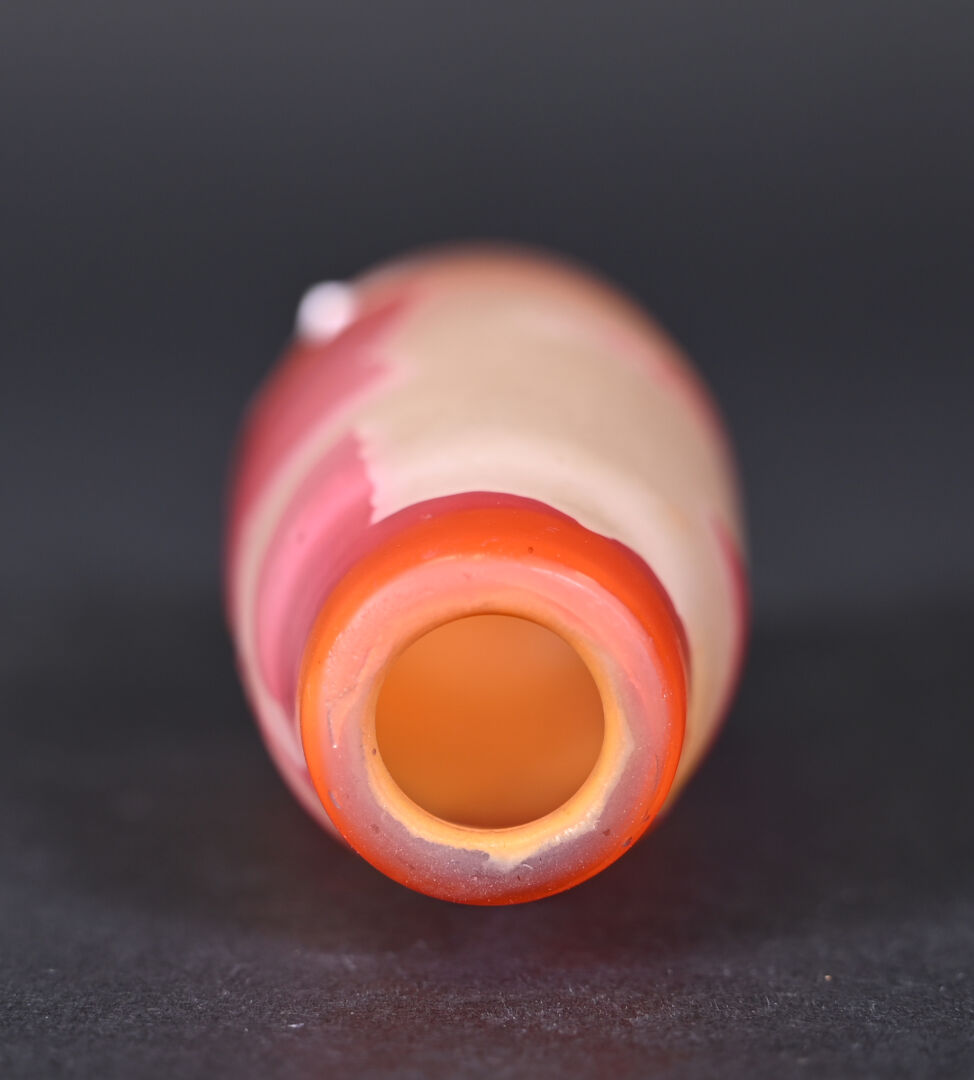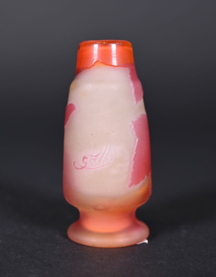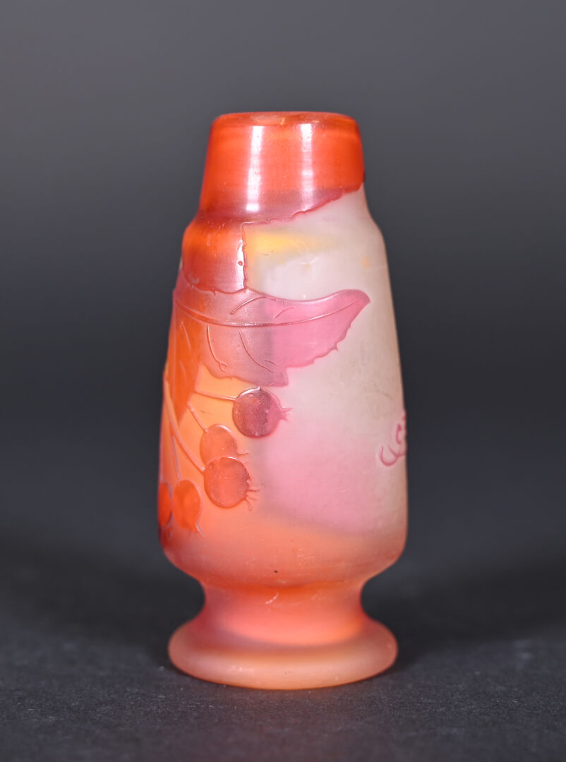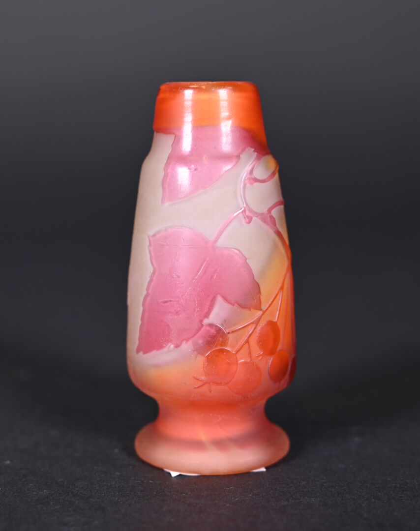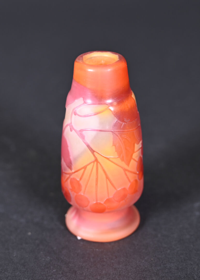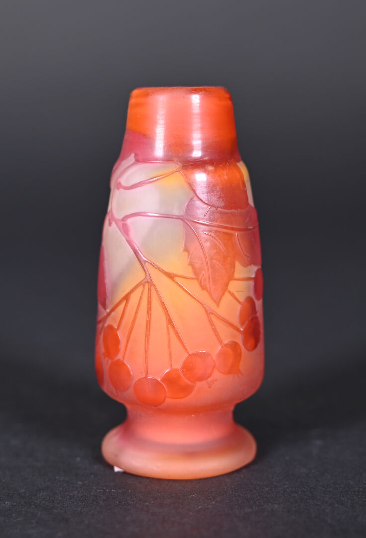 Vase soliflore en verre multicouche à décor dégagé à l’acide de cerisiers en orange sur fond jaune et clair. Signature apocryphe de Gallé. Haut. : 9,5 cm.