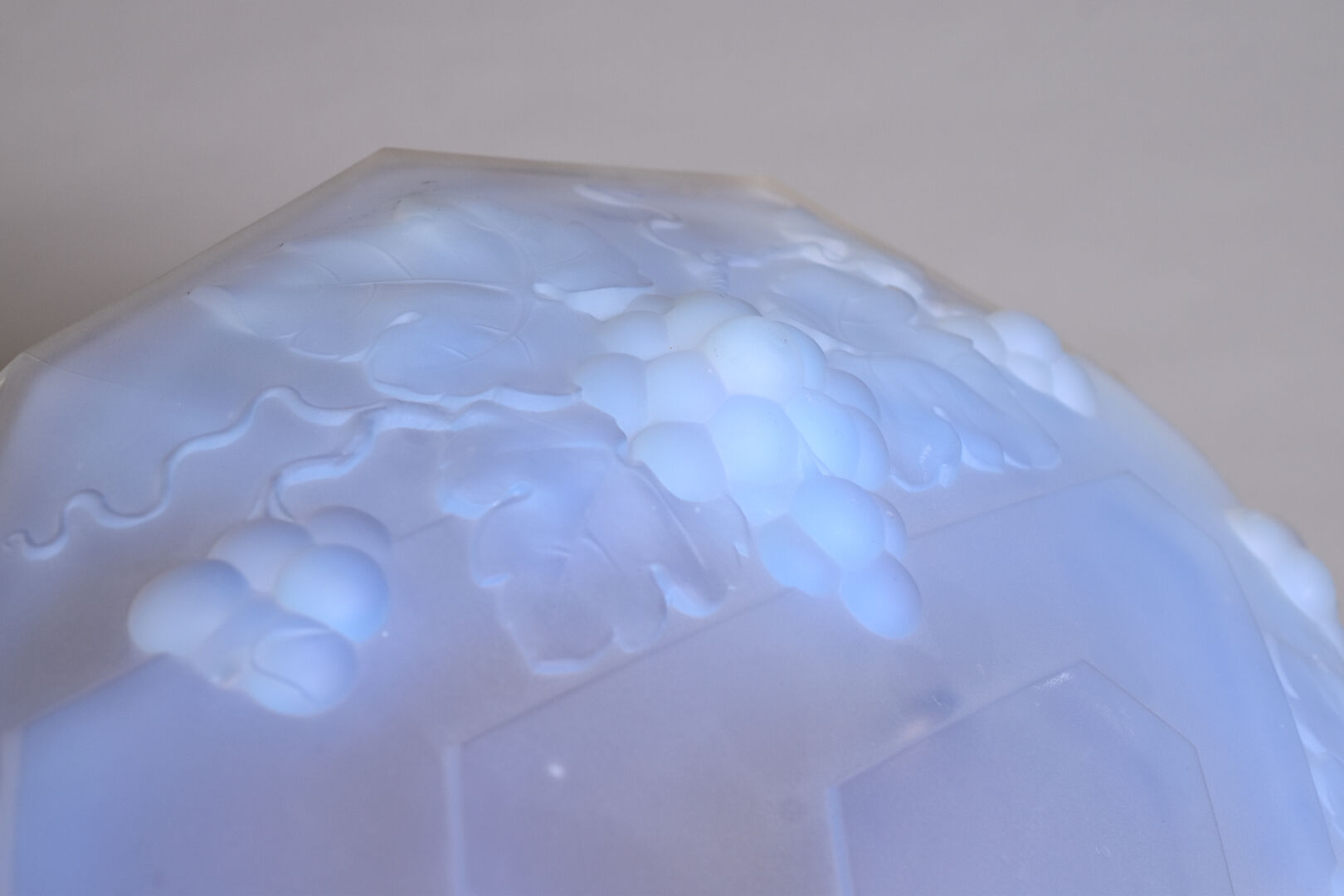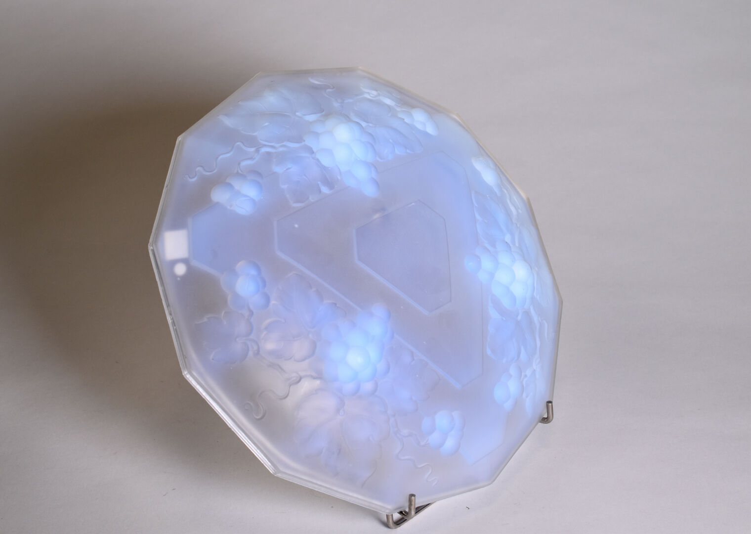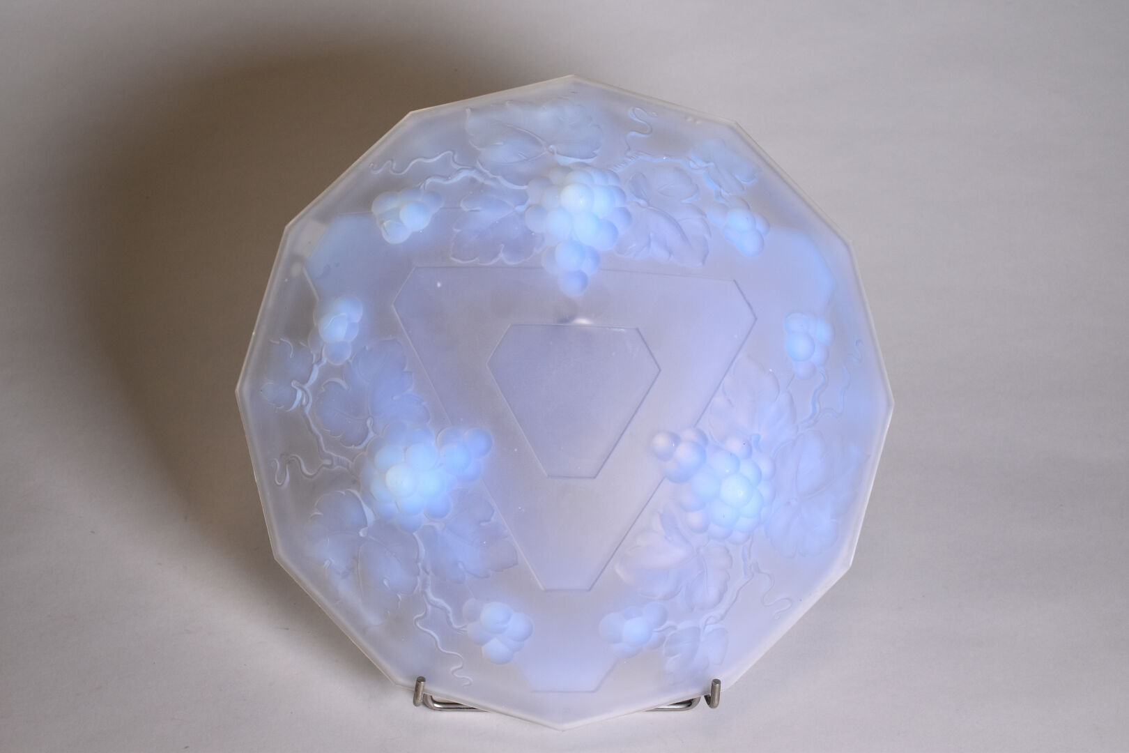 VERLUX. Coupe dodécagonale en verre moulé opalescent à décor de pampres de vigne (quelques égrenures en bordure). Signée. Diam. : 35,5 cm.