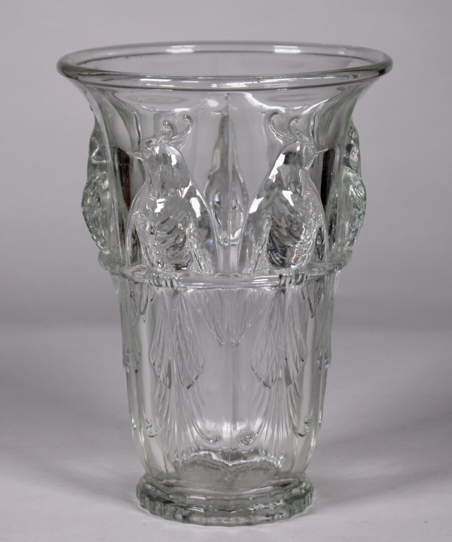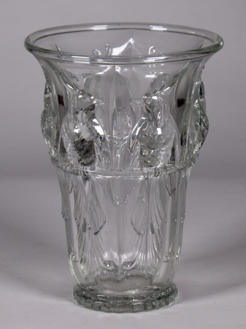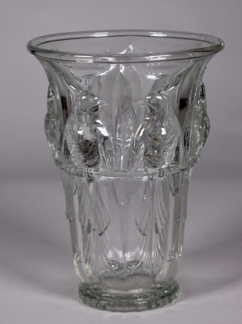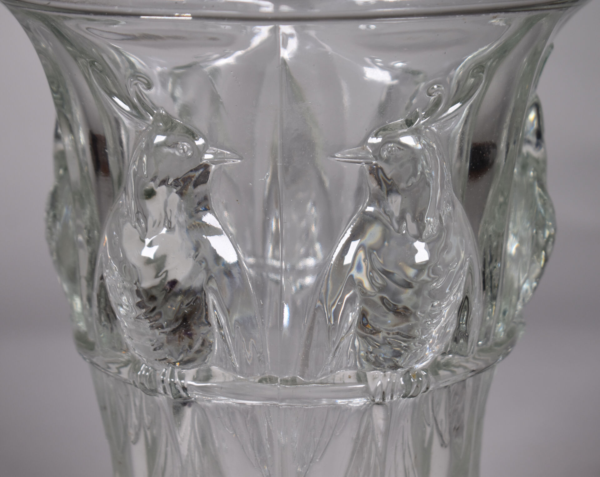 VERLUX. Vase cornet en cristal moulé à décor d’oiseaux fantastiques. Marqué au dessous. Haut. : 24 cm.