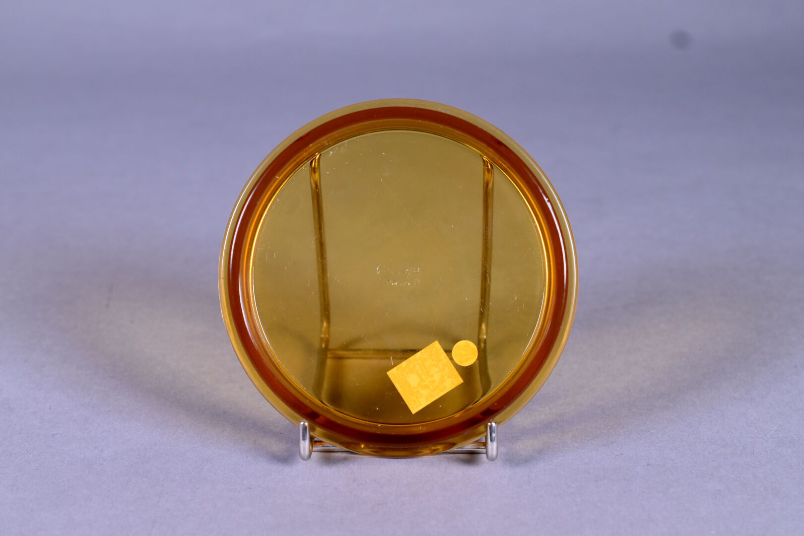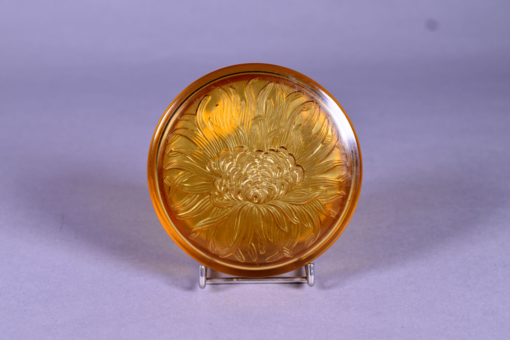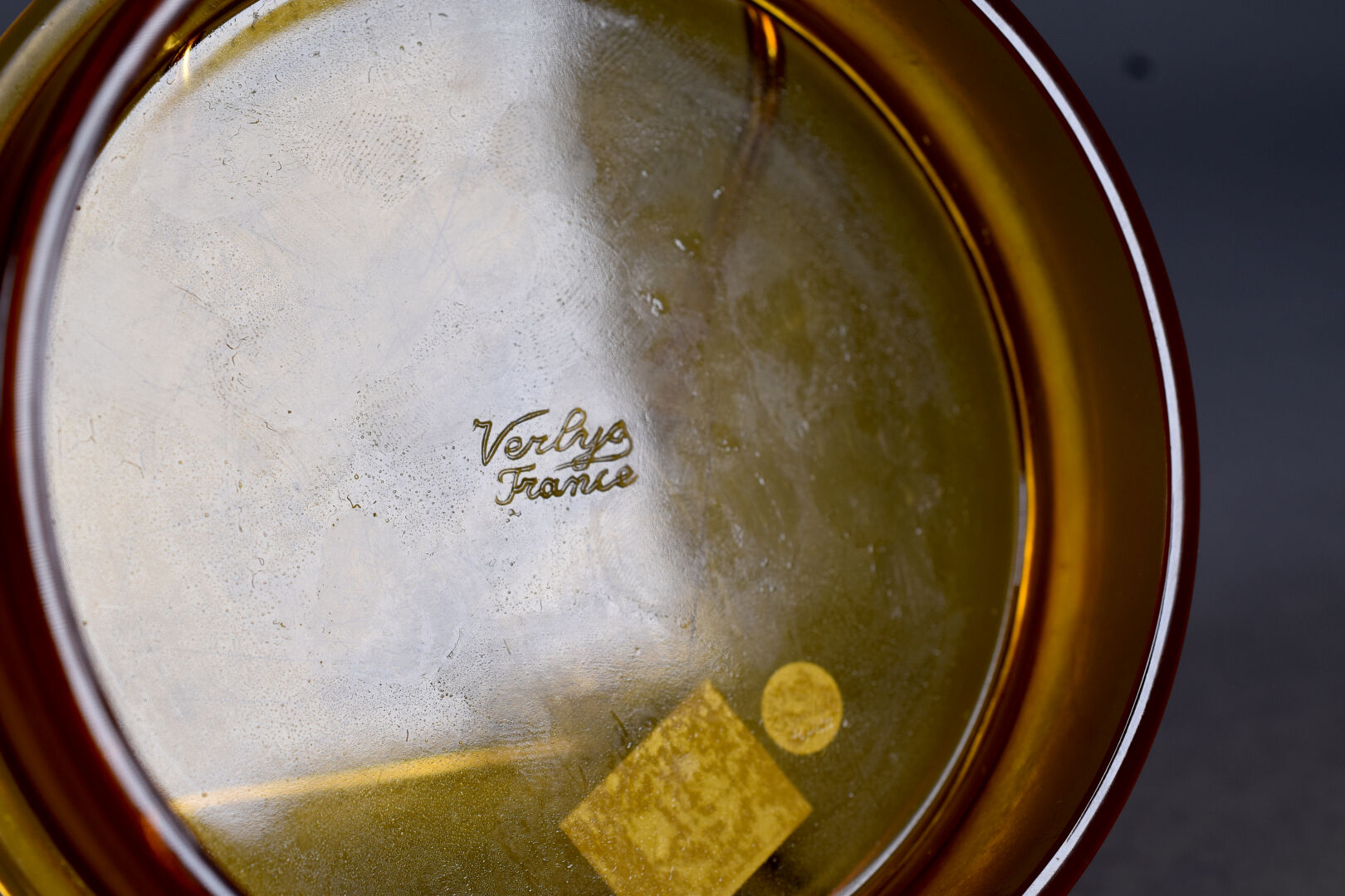 VERLYS FRANCE. Bonbonnière en verre moulé ambré, le couvercle à décor d’un chrysanthème. Signée. Diam. : 11,7 cm.
