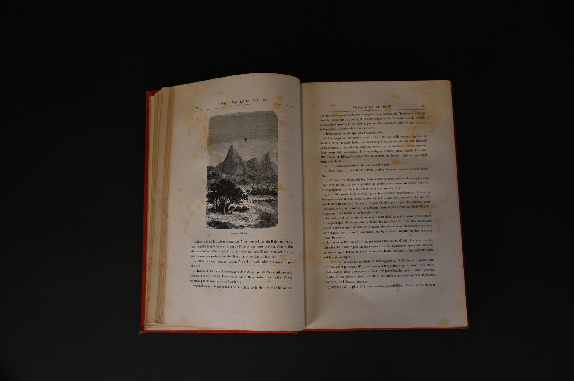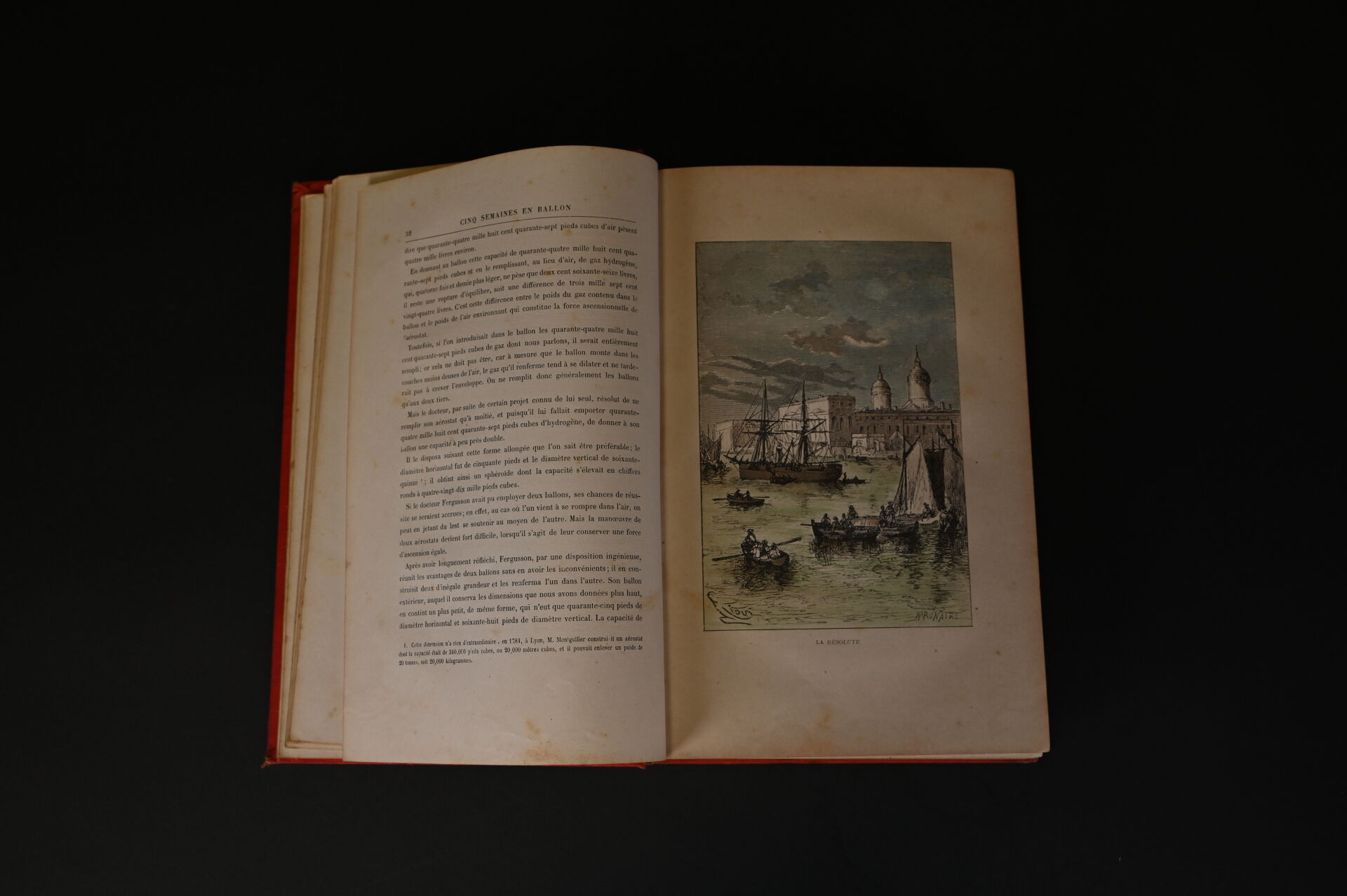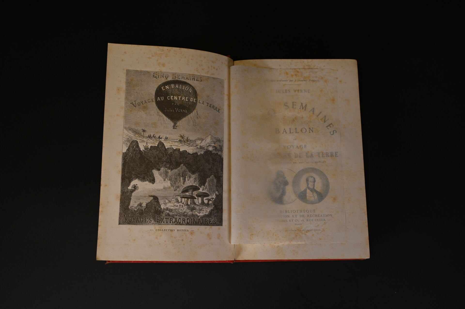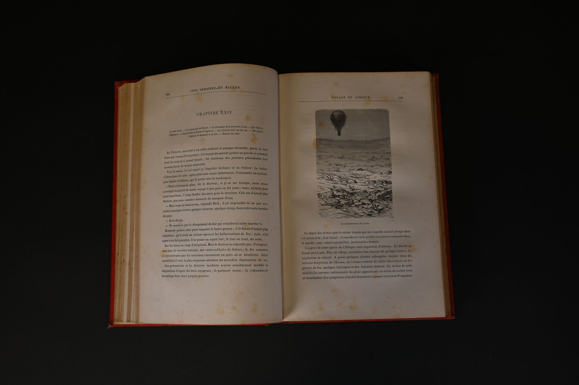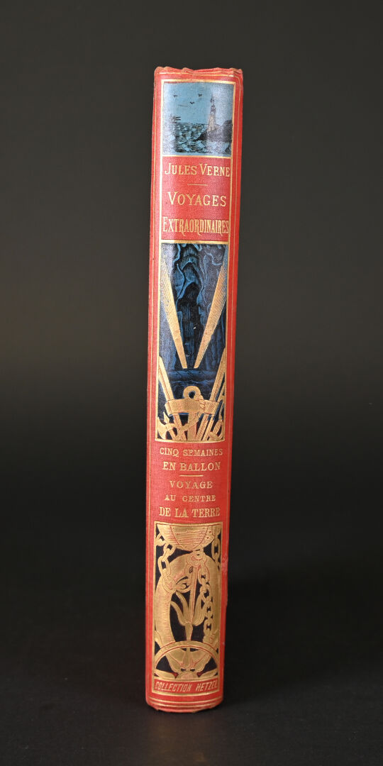 VERNE (J.). CINQ SEMAINES EN BALLON ET VOYAGE AU CENTRE DE LA TERRE. Illustrations par MM. Riou et De Montaut. P., Hetzel, [1898]. Deux ouvrages reliés en un volume grand in-8 percaline rouge de l’éditeur ornée de fers spéciaux, titre dans le cartouche, dos au phare, tranches dorées (Engel Rel., d’après une plaque de C. Blancheland). Catalogue « AJ ». Petit manque d’or au titre dans le cartouche, fente d’un cm au mors supérieur, taches claires au 2nd plat, rousseurs prononcées, 2 ressauts de cahiers. ÉDITION COLLECTIVE GRAND IN-8 ILLUSTRÉE conservée dans sa reliure éditeur décorée « à la sphère dorée » de type 3, avec le dos « au phare », de la série des « Voyages extraordinaires ». ¶ Jauzac, 170.