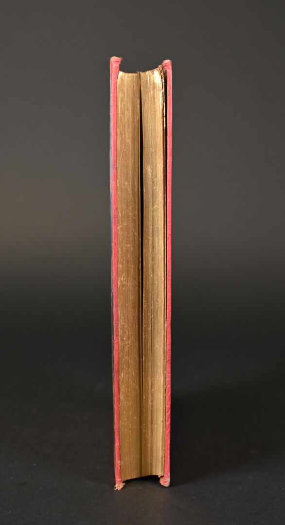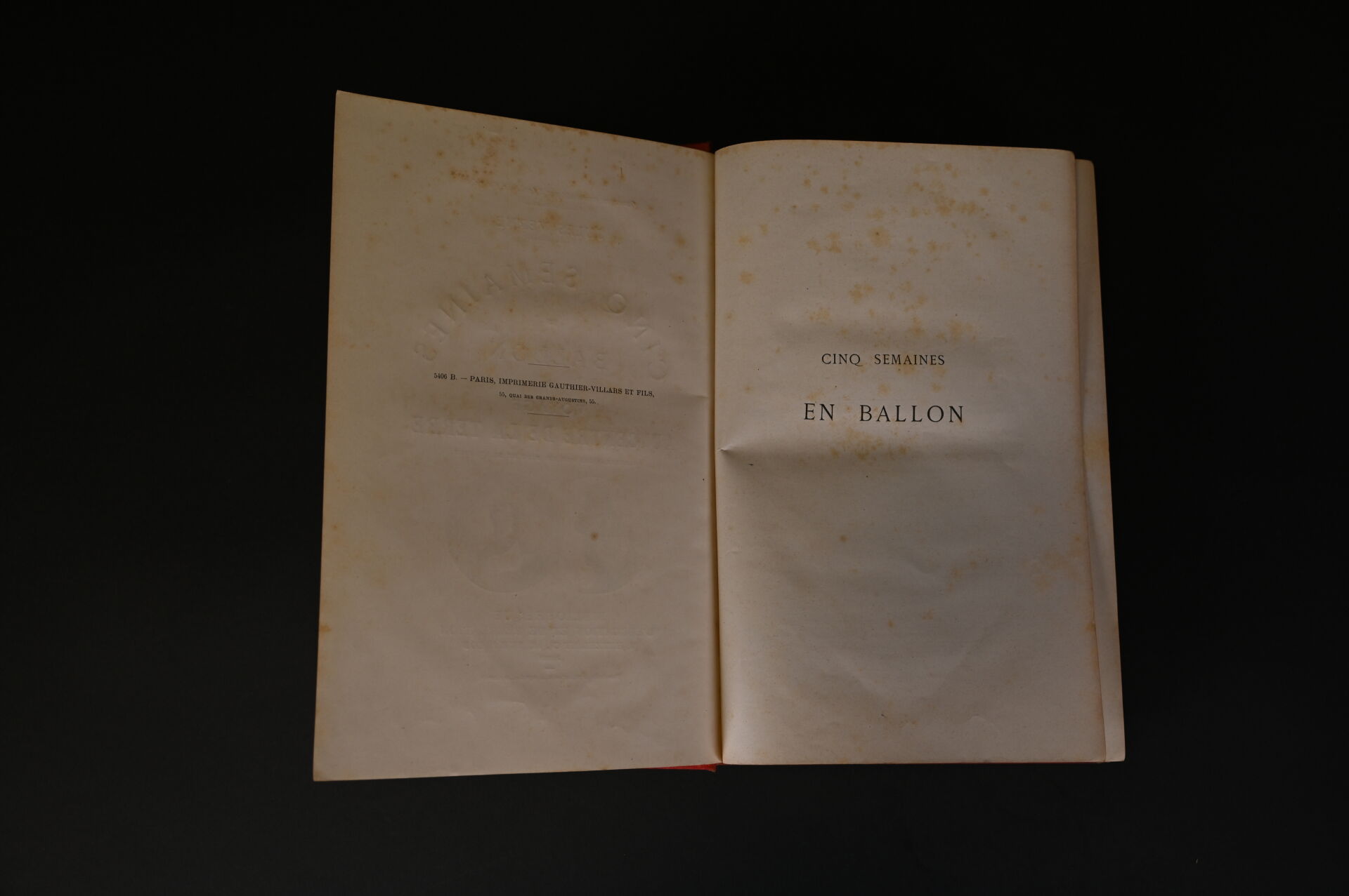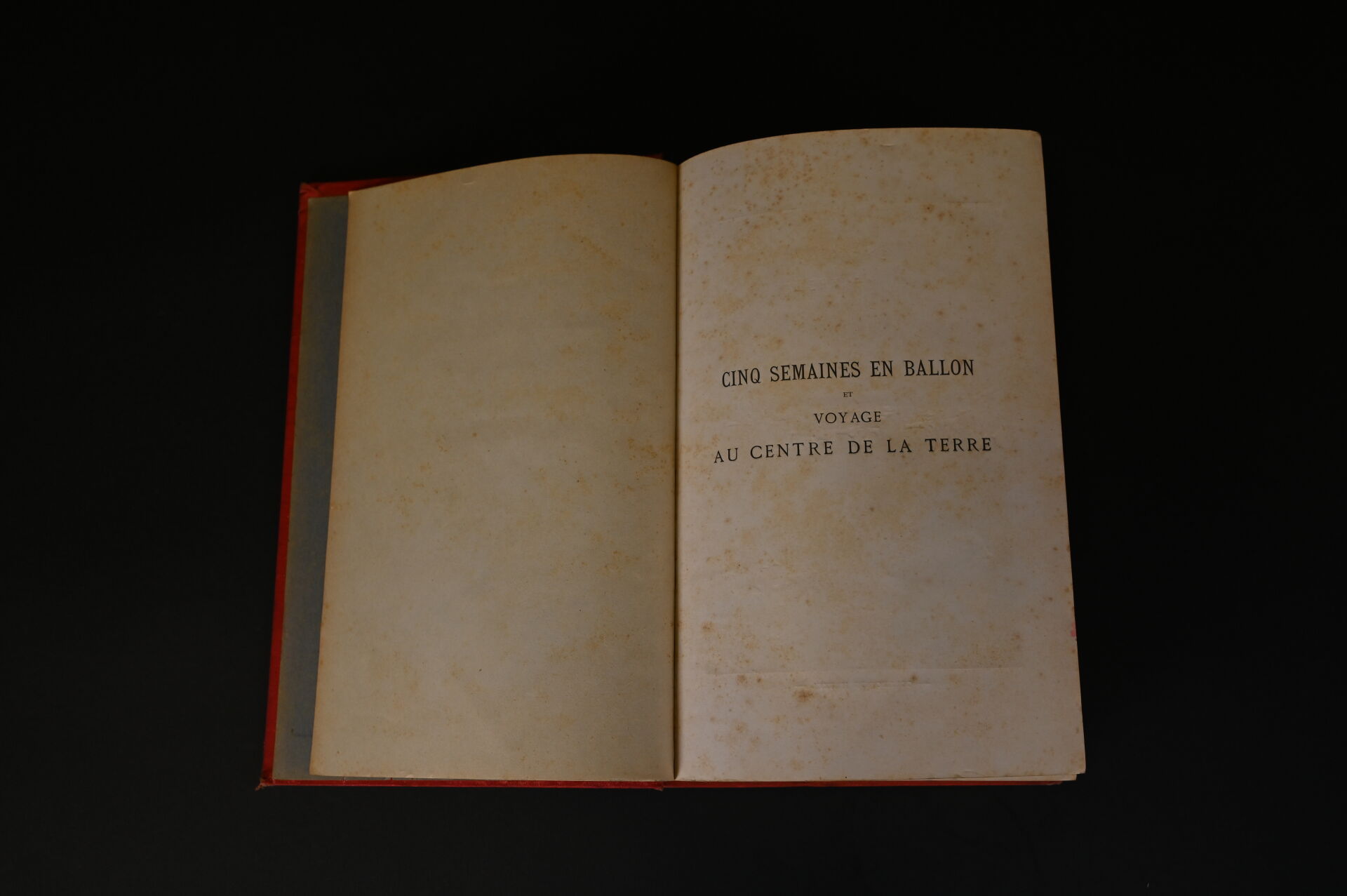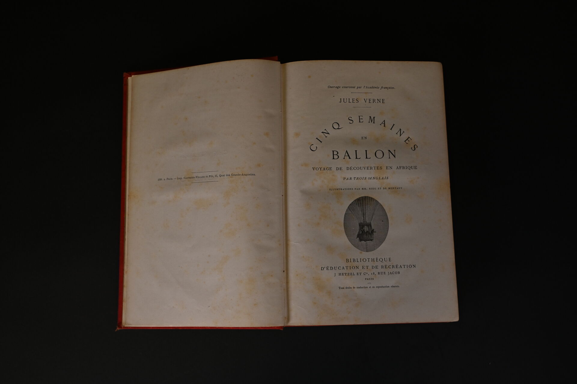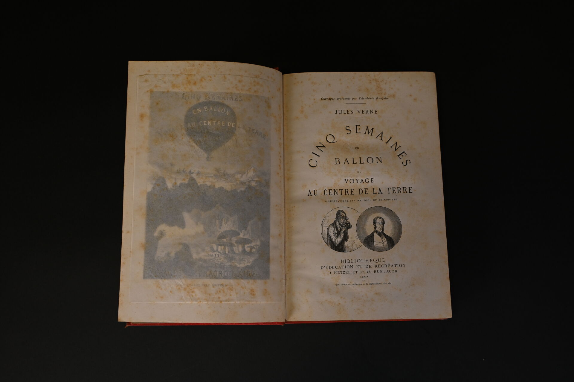 VERNE (J.). CINQ SEMAINES EN BALLON ET VOYAGE AU CENTRE DE LA TERRE. Illustrations par MM. Riou et De Montaut. P., Hetzel, [1898]. Deux ouvrages reliés en un volume grand in-8 percaline rouge de l’éditeur ornée de fers spéciaux, titre dans le cartouche, dos au phare, tranches dorées (Engel Rel., d’après une plaque de C. Blancheland). Catalogue « AJ ». Petit manque d’or au titre dans le cartouche, fente d’un cm au mors supérieur, taches claires au 2nd plat, rousseurs prononcées, 2 ressauts de cahiers. ÉDITION COLLECTIVE GRAND IN-8 ILLUSTRÉE conservée dans sa reliure éditeur décorée « à la sphère dorée » de type 3, avec le dos « au phare », de la série des « Voyages extraordinaires ». ¶ Jauzac, 170.
