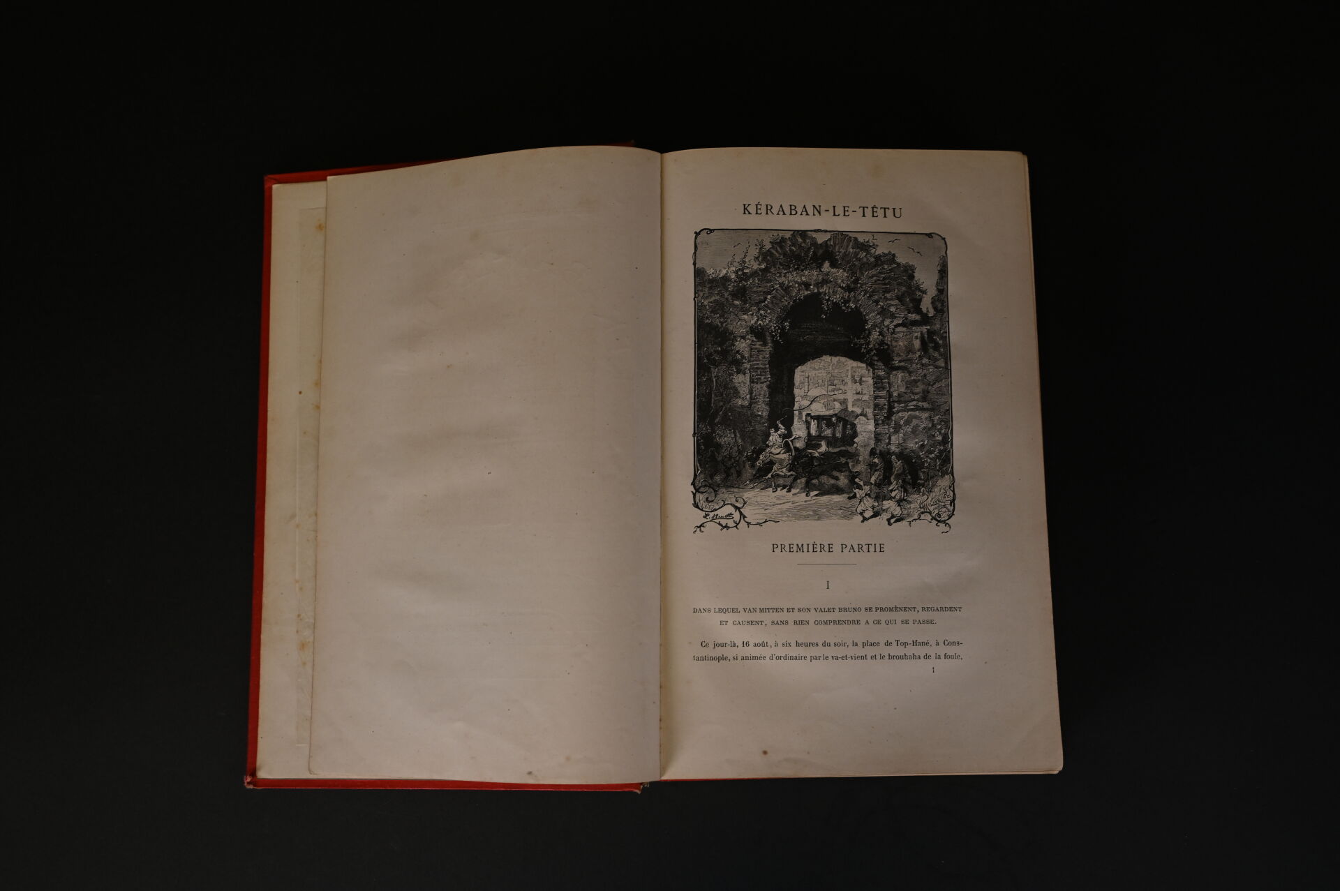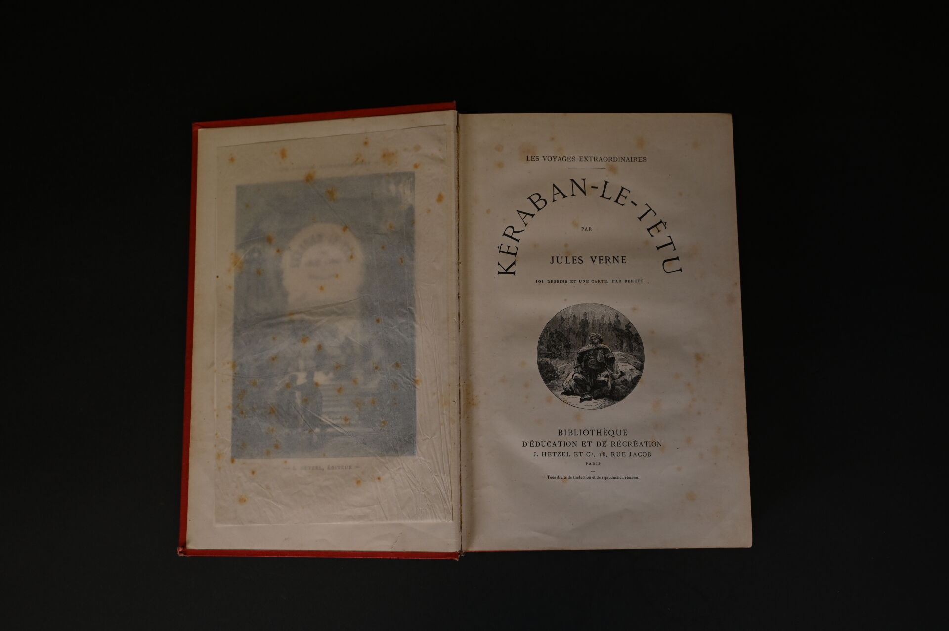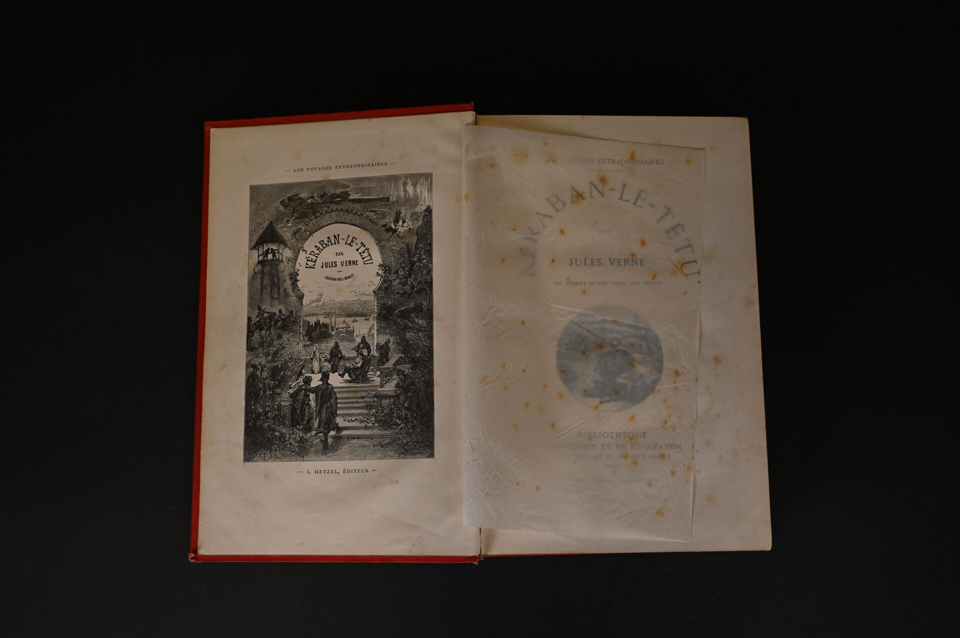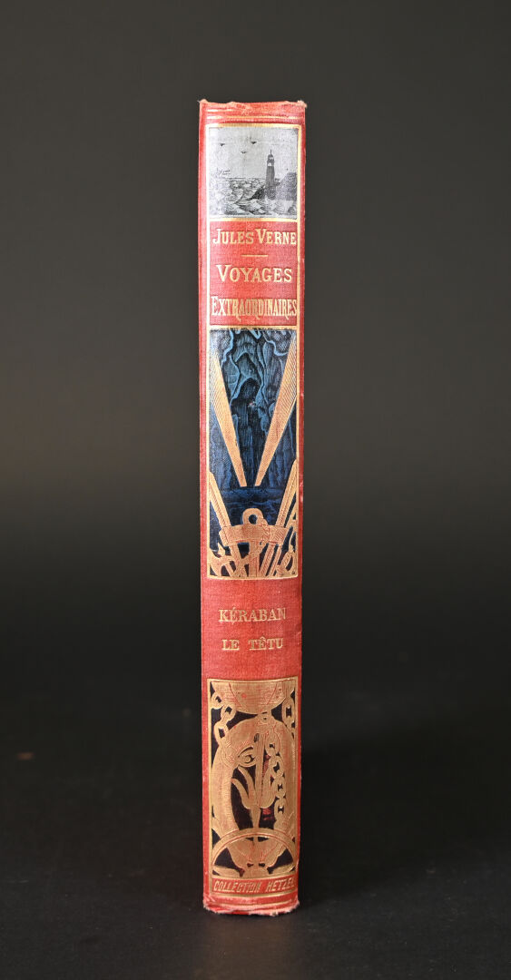 VERNE (J.). KÉRABAN-LE-TÉTU. 101 dessins et une carte, par Benett. P., Hetzel, [1903-1904]. Grand in-8 percaline rouge de l’éditeur ornée de fers spéciaux, titre dans le cartouche, tranches dorées (Engel Rel., d’après une plaque de C. Blancheland). Petit frottement en partie inférieure gauche du 1er plat avec manque d’or, légers accrocs aux coiffes, 2 coins émoussés, rousseurs au feuillet de titre. ÉDITION COLLECTIVE GRAND IN-8 ILLUSTRÉE conservée dans sa reliure éditeur décorée « au globe doré » de type 4 (2nd plat de type Engel « i »), avec le dos « au phare », de la série des « Voyages extraordinaires ». ¶ Jauzac, 237.