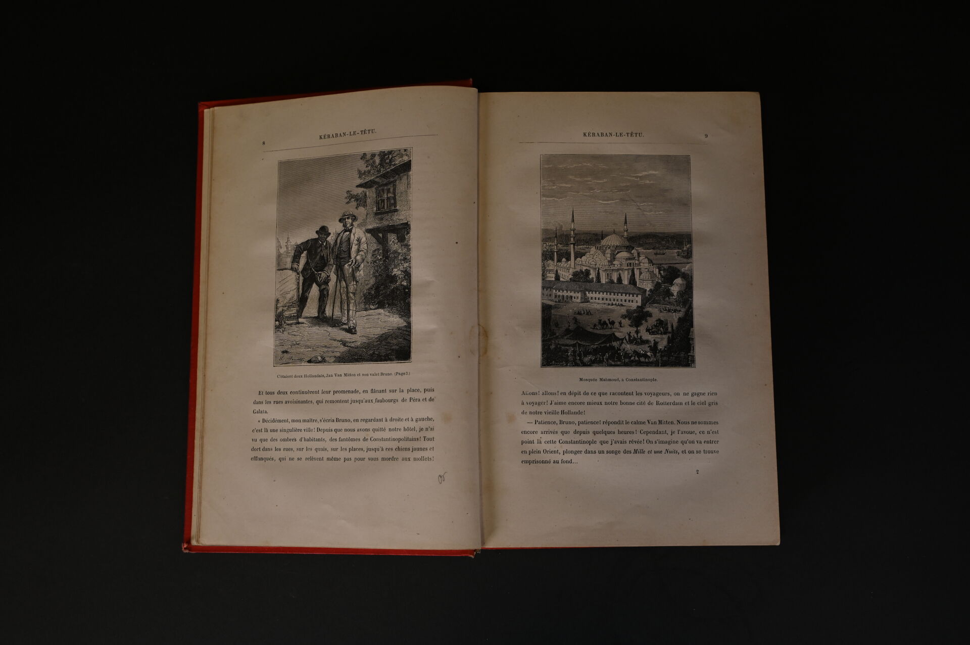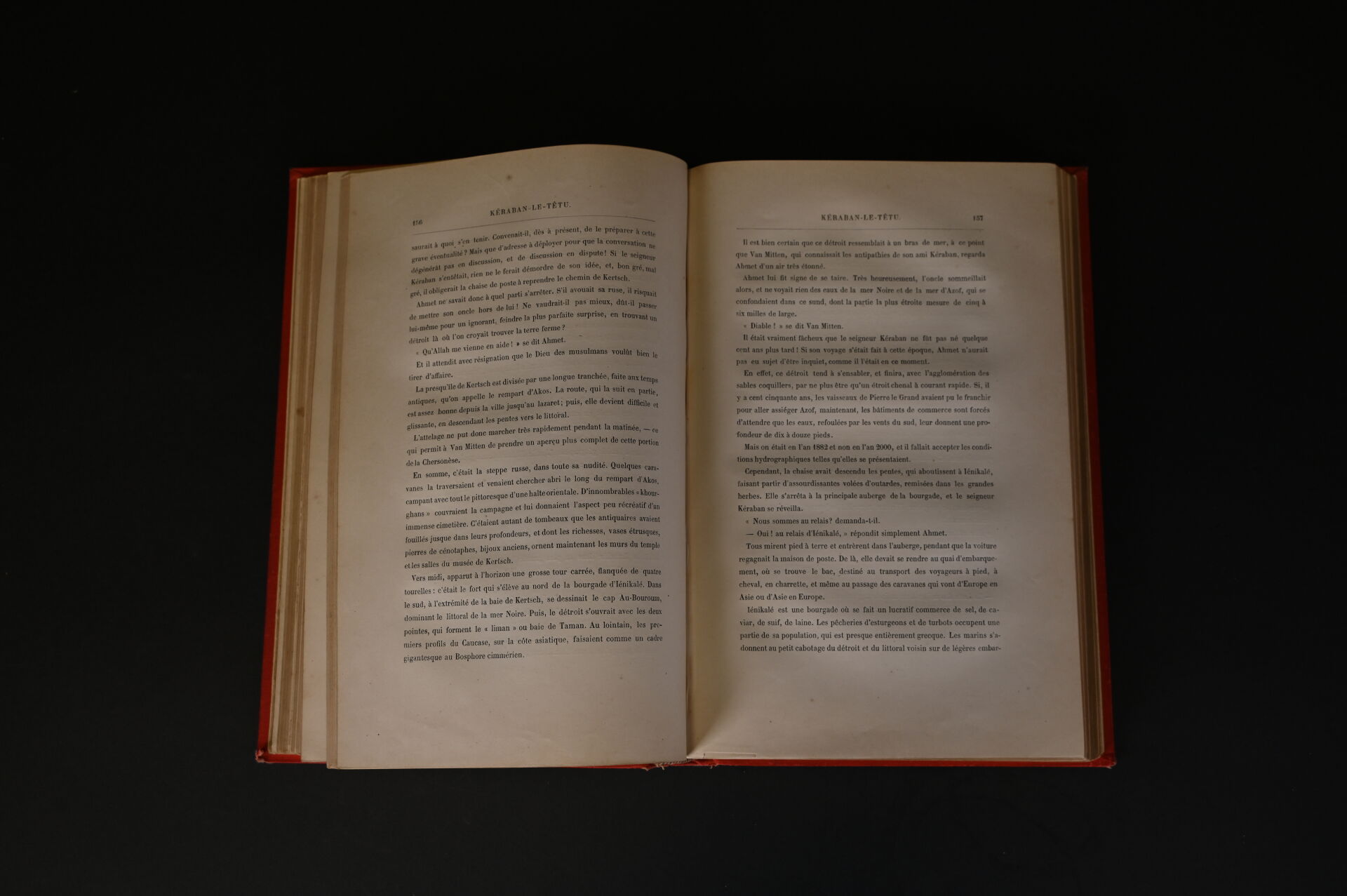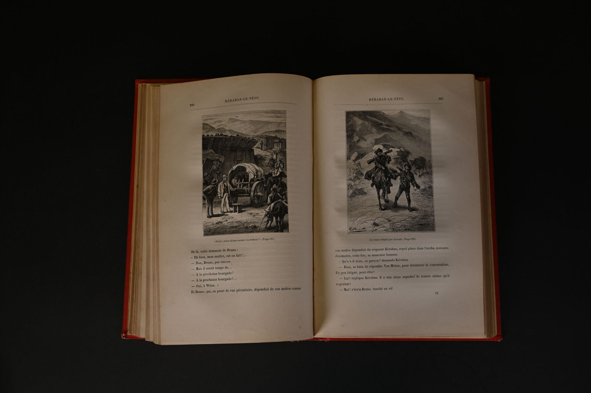 VERNE (J.). KÉRABAN-LE-TÉTU. 101 dessins et une carte, par Benett. P., Hetzel, [1903-1904]. Grand in-8 percaline rouge de l’éditeur ornée de fers spéciaux, titre dans le cartouche, tranches dorées (Engel Rel., d’après une plaque de C. Blancheland). Petit frottement en partie inférieure gauche du 1er plat avec manque d’or, légers accrocs aux coiffes, 2 coins émoussés, rousseurs au feuillet de titre. ÉDITION COLLECTIVE GRAND IN-8 ILLUSTRÉE conservée dans sa reliure éditeur décorée « au globe doré » de type 4 (2nd plat de type Engel « i »), avec le dos « au phare », de la série des « Voyages extraordinaires ». ¶ Jauzac, 237.