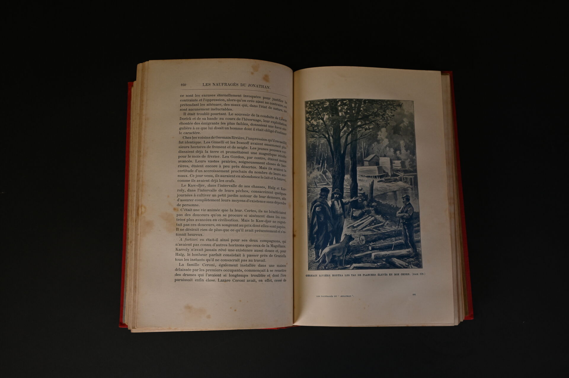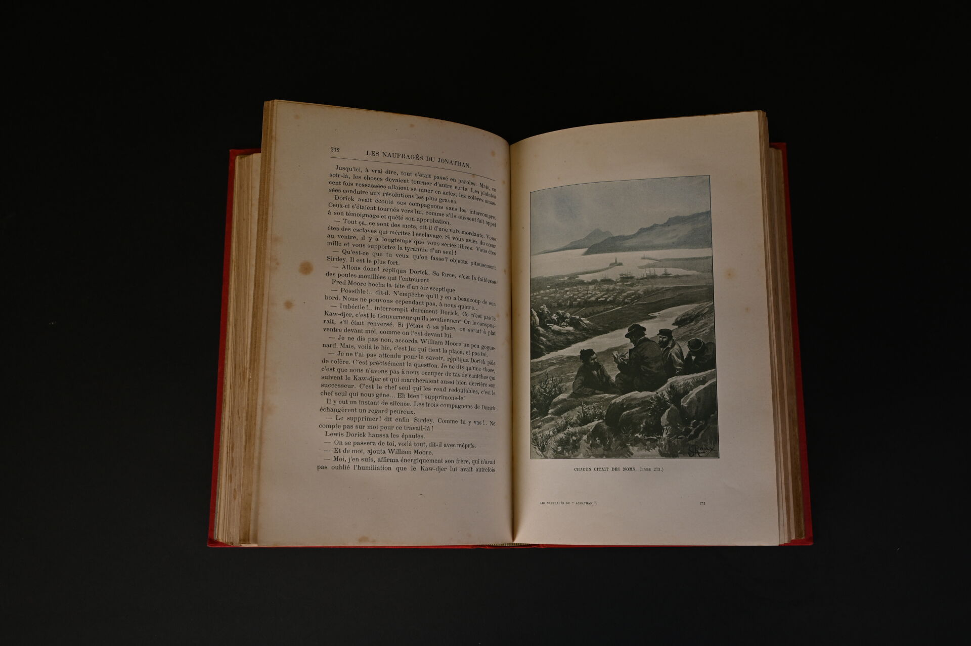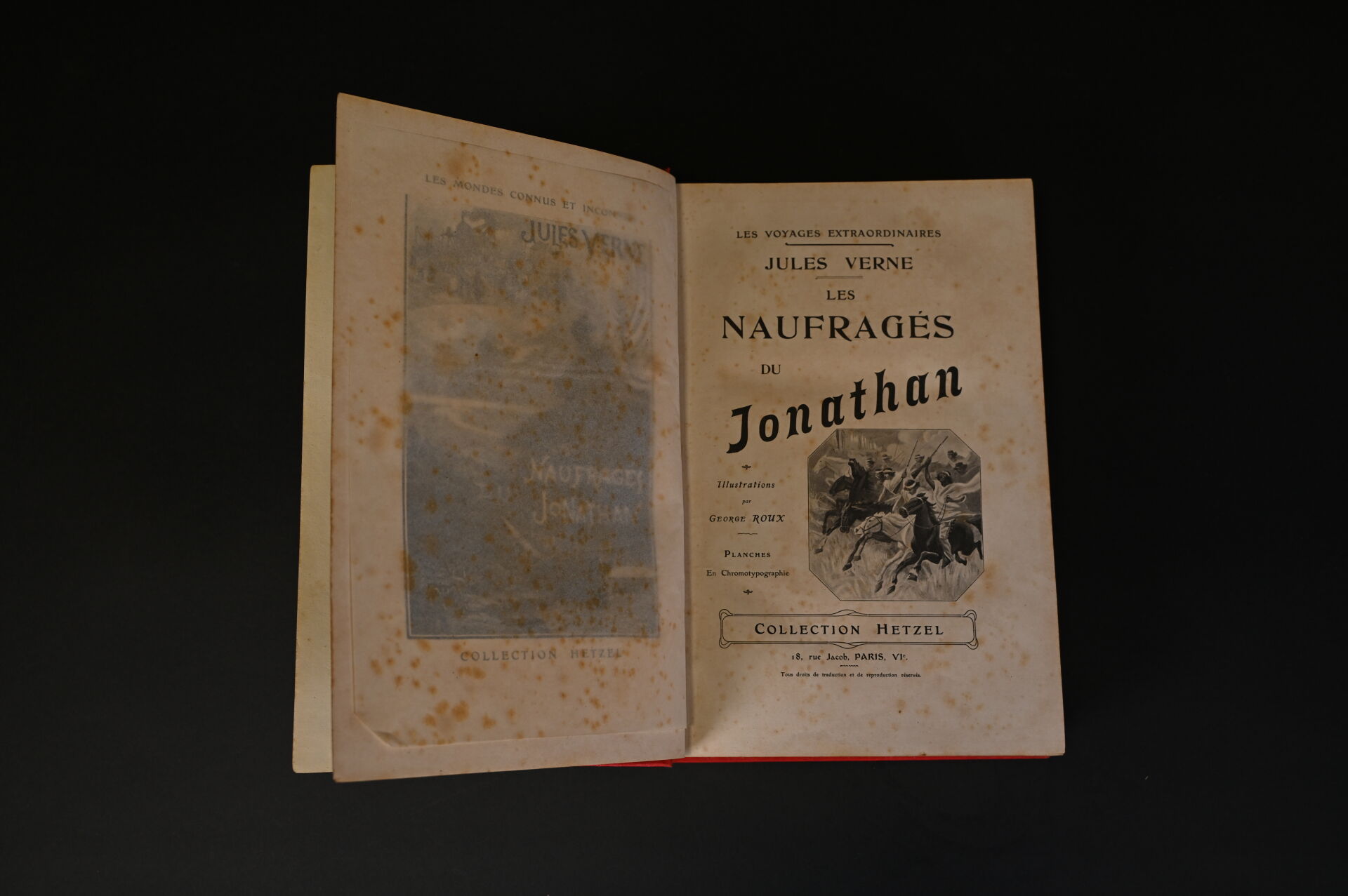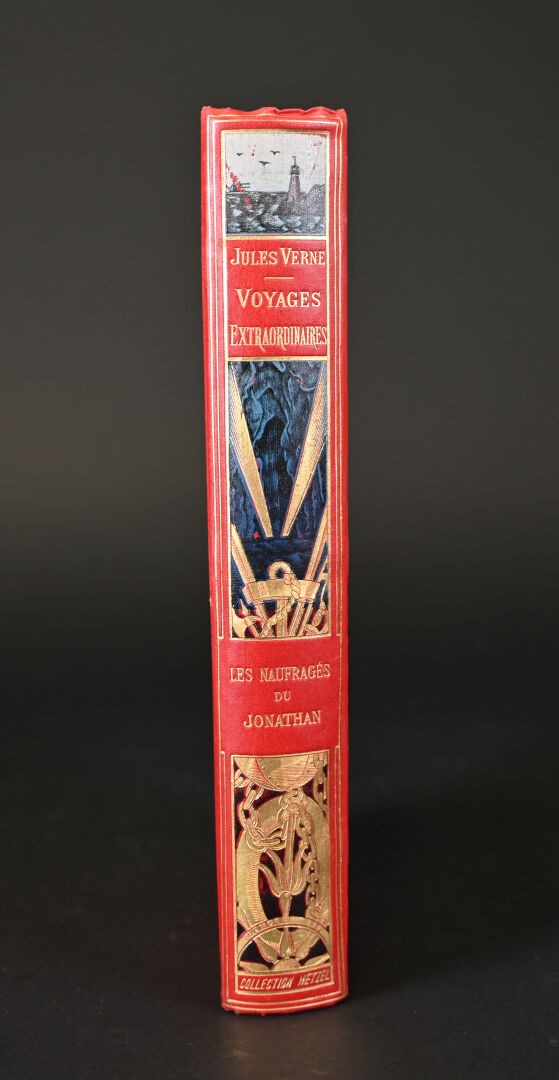 VERNE (J.). LES NAUFRAGÉS DU JONATHAN. Illustrations par George Roux. Planches en chromotypographie. P., Hetzel, [1909]. Grand in-8 percaline rouge de l’éditeur ornée de fers spéciaux, dos au phare, tranches dorées. Infimes manques de peinture au dos, léger accroc au mors inférieur, rousseurs prononcées, 2 ressauts de cahiers. PREMIÈRE ET SEULE ÉDITION grand in-8 illustrée, conservée dans sa reliure éditeur décorée « à un éléphant, titre dans l’éventail », avec le dos « au phare », de la série des « Voyages extraordinaires ». ¶ Jauzac, 310.