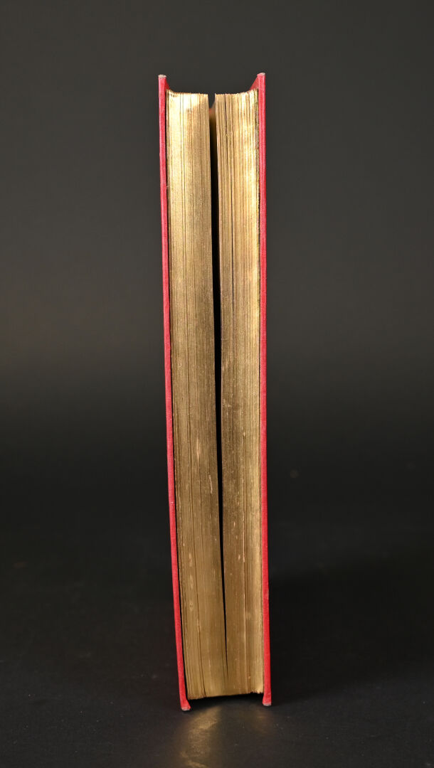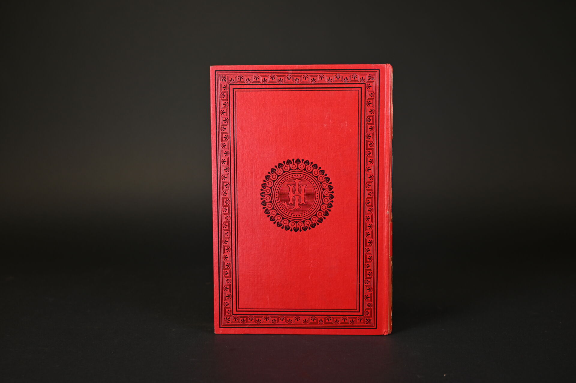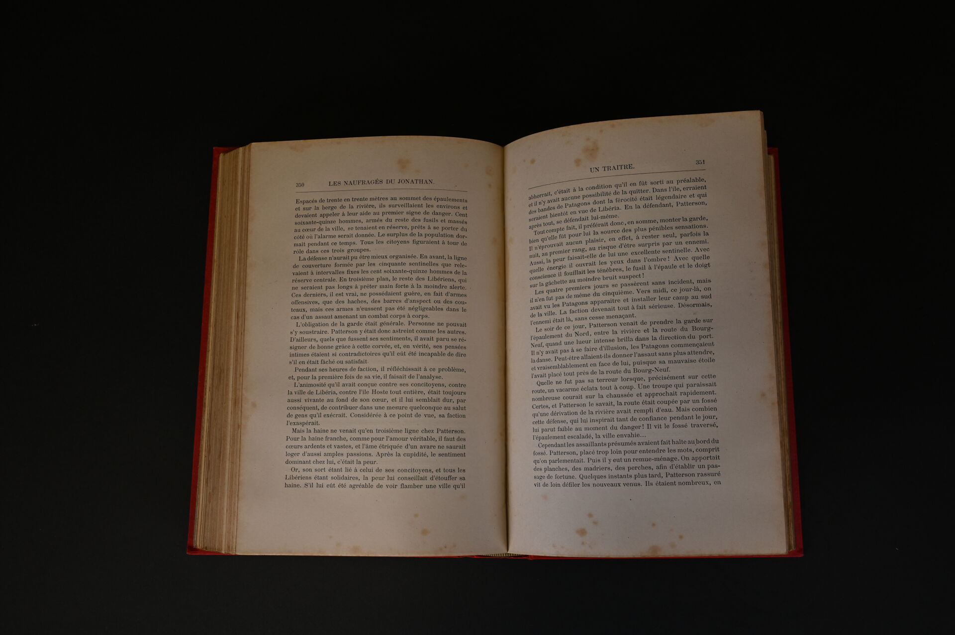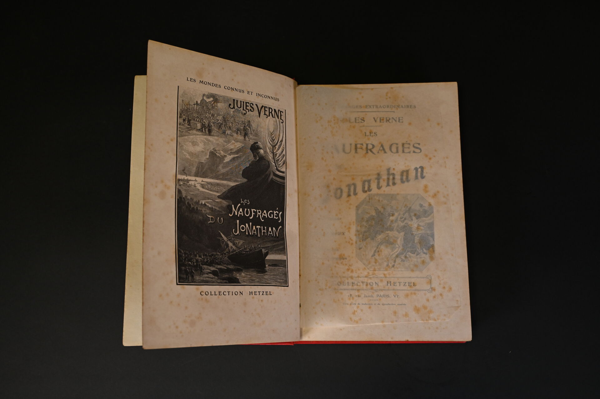 VERNE (J.). LES NAUFRAGÉS DU JONATHAN. Illustrations par George Roux. Planches en chromotypographie. P., Hetzel, [1909]. Grand in-8 percaline rouge de l’éditeur ornée de fers spéciaux, dos au phare, tranches dorées. Infimes manques de peinture au dos, léger accroc au mors inférieur, rousseurs prononcées, 2 ressauts de cahiers. PREMIÈRE ET SEULE ÉDITION grand in-8 illustrée, conservée dans sa reliure éditeur décorée « à un éléphant, titre dans l’éventail », avec le dos « au phare », de la série des « Voyages extraordinaires ». ¶ Jauzac, 310.