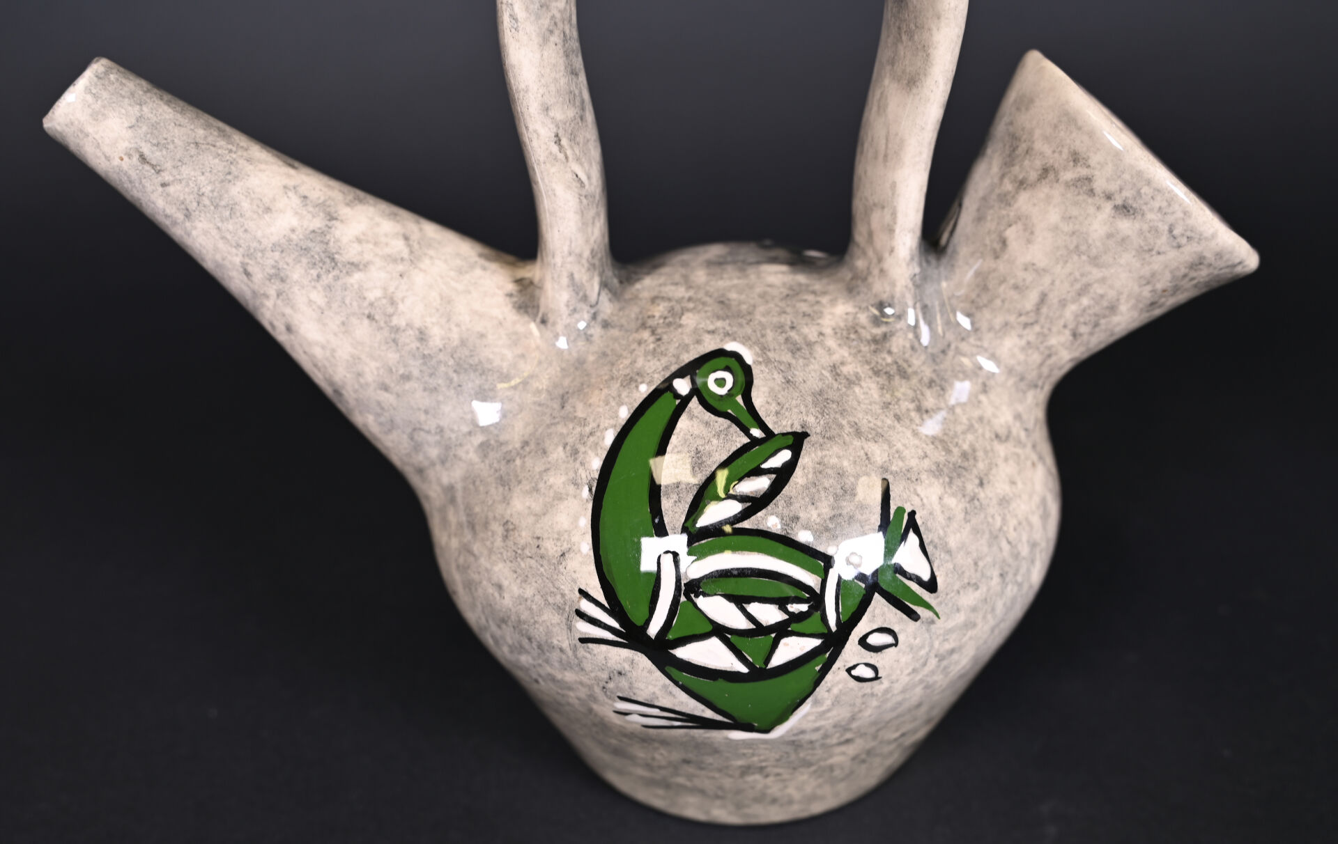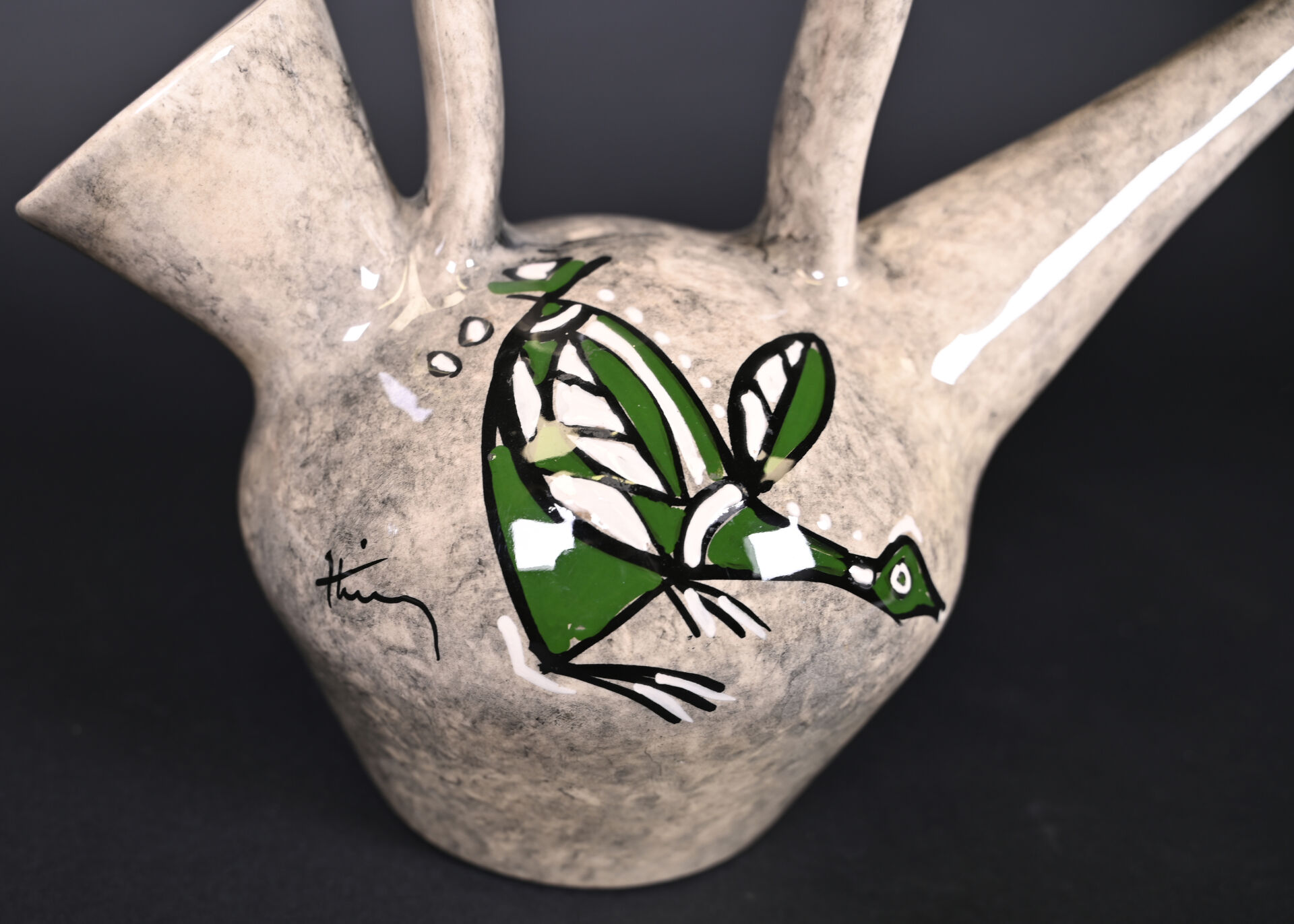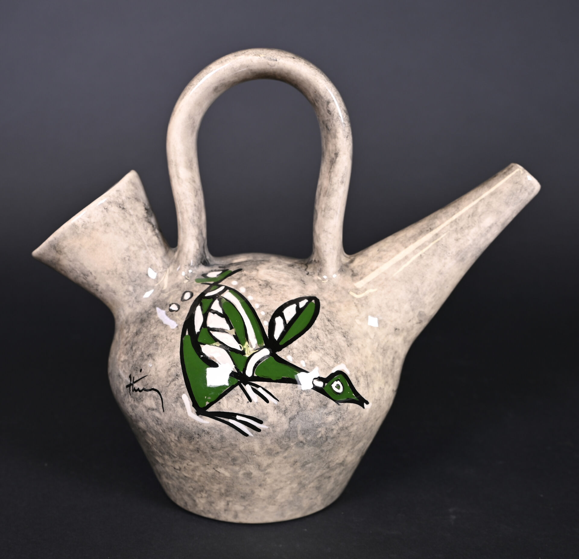 Verseuse en céramique à décor émaillé en polychromie d’oiseaux en vert, noir et blanc. Signé, probablement Vallauris, vers 1950/60. Haut. : 28 cm.