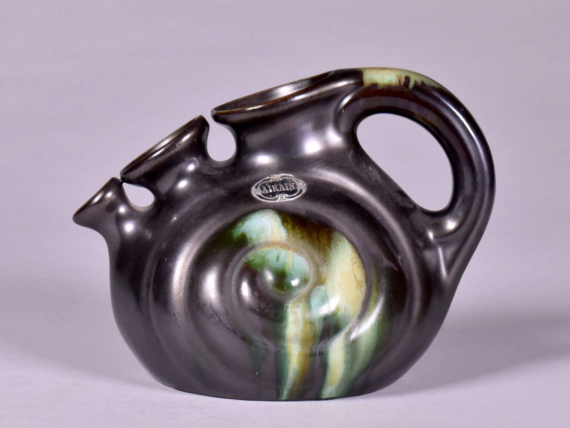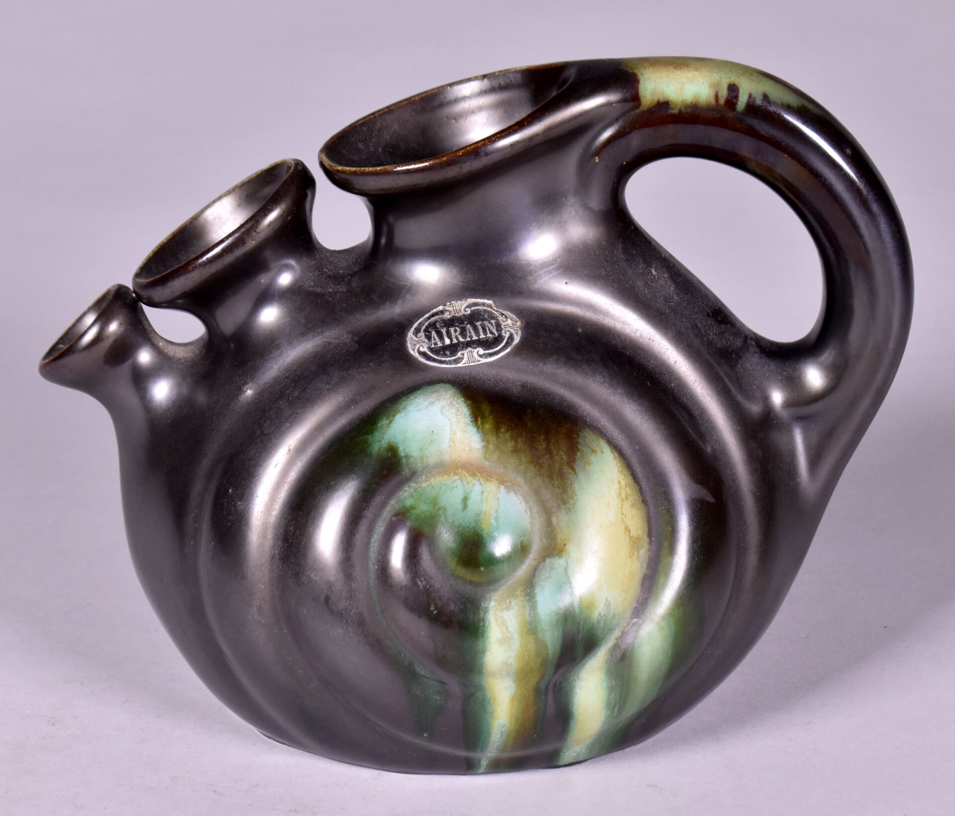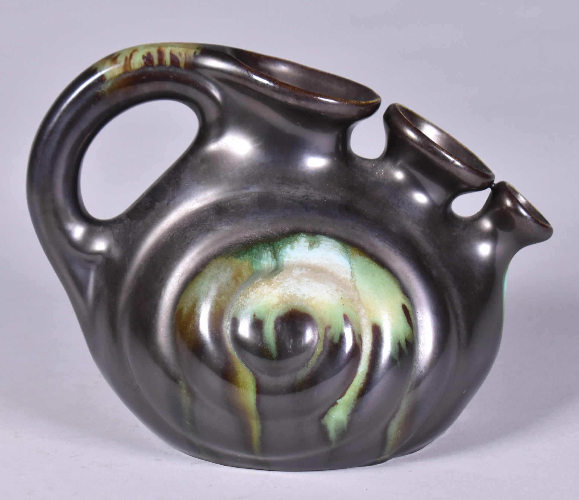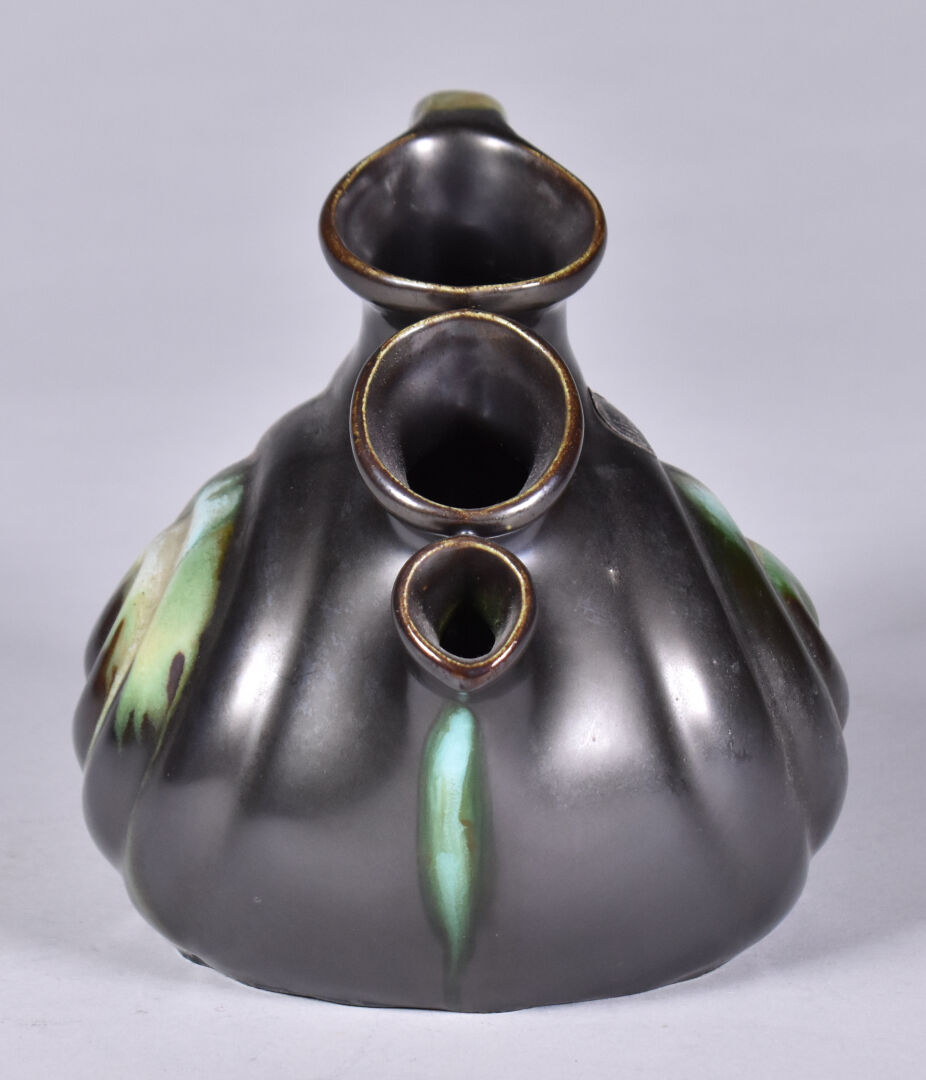 Verseuse en céramique émaillée noir et vert à trois cols et décor de spirales. Travail Belge. Haut. : 14,5 cm.