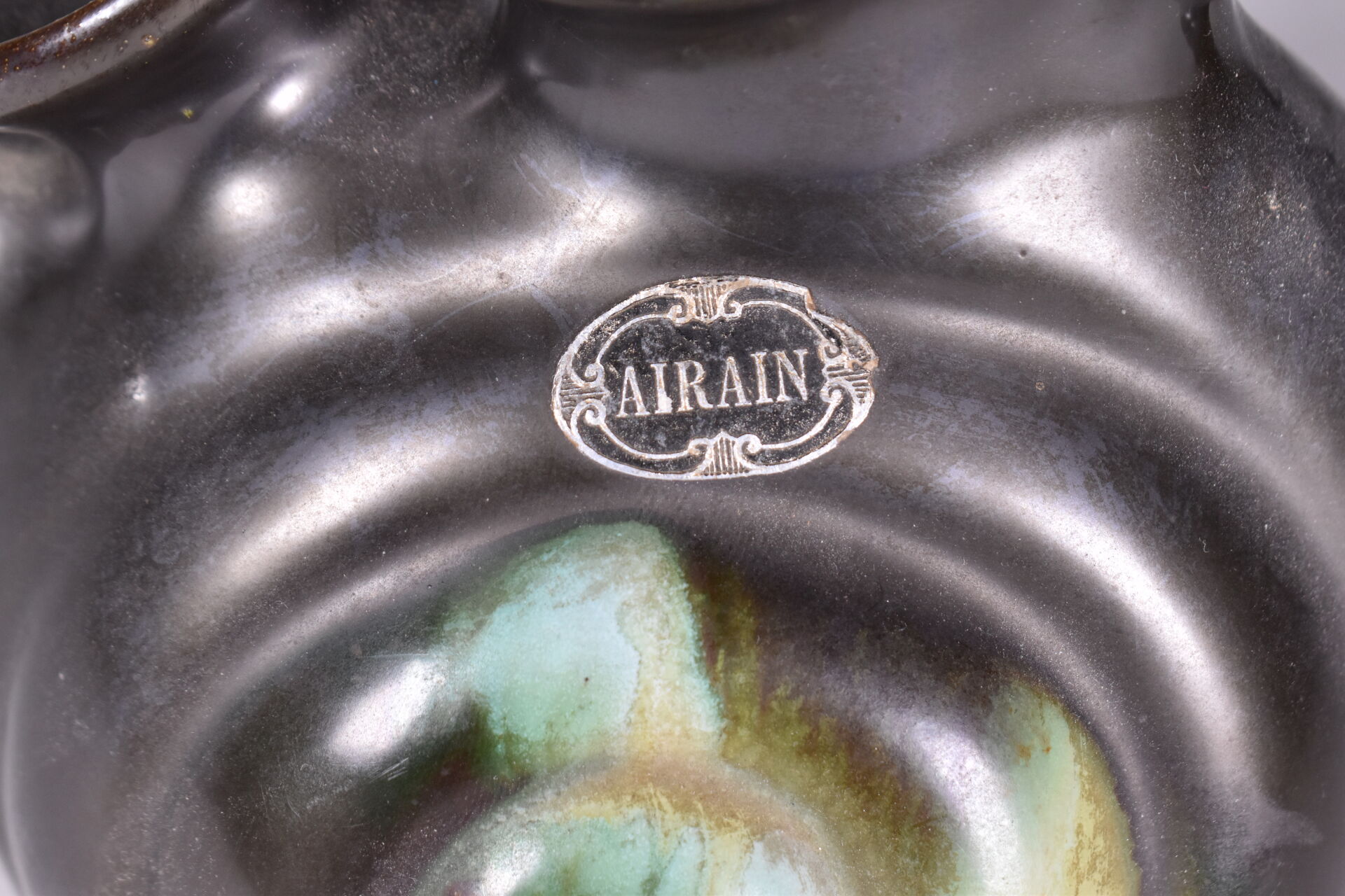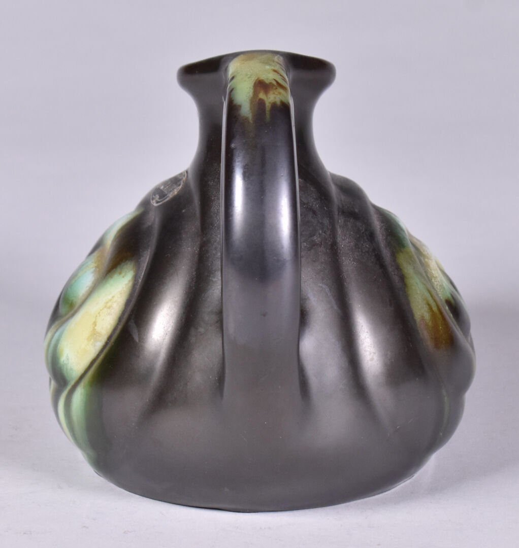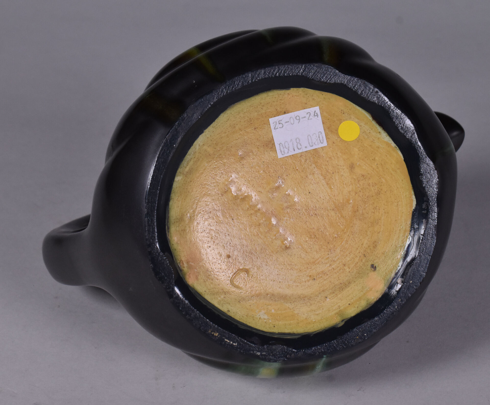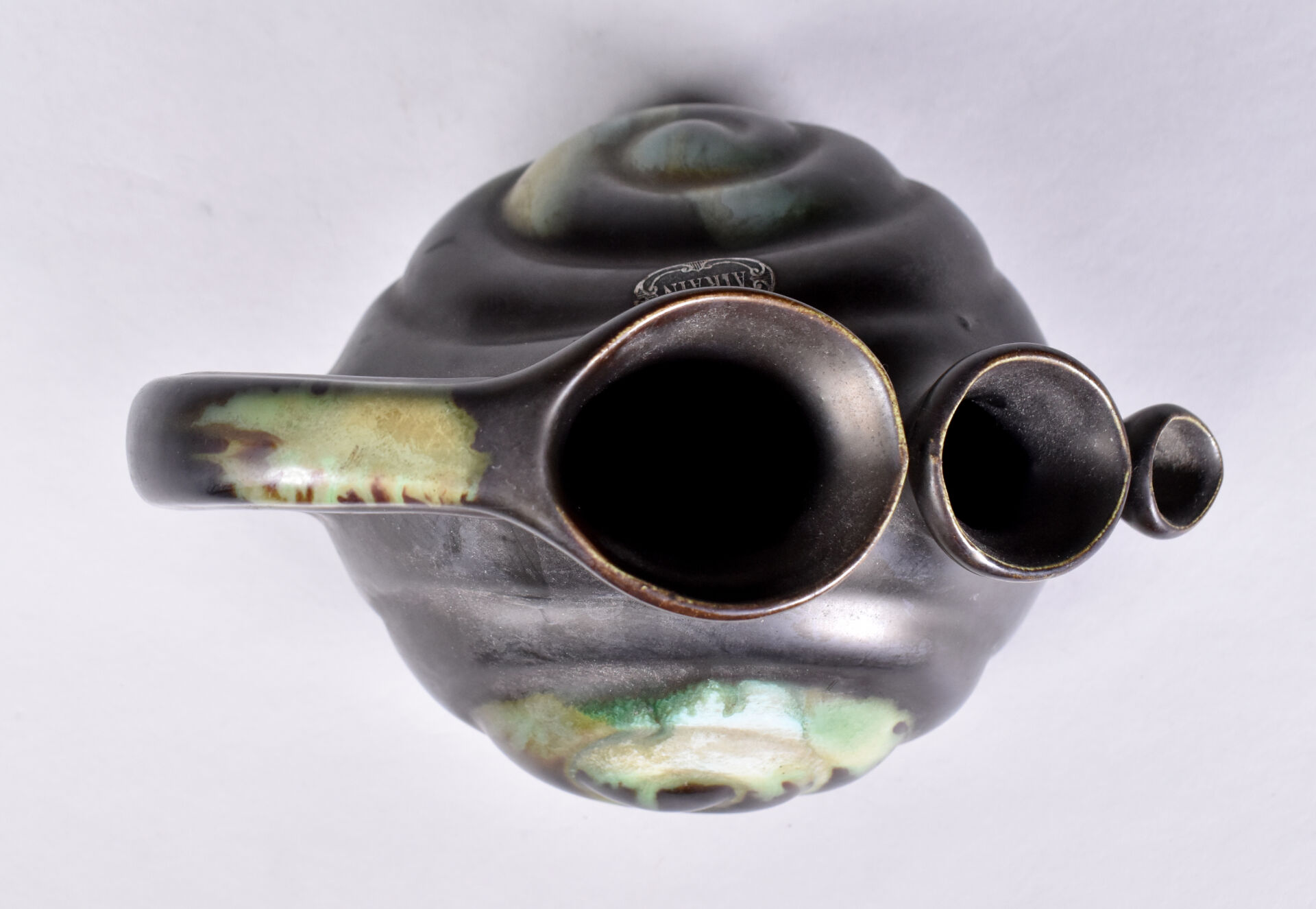 Verseuse en céramique émaillée noir et vert à trois cols et décor de spirales. Travail Belge. Haut. : 14,5 cm.