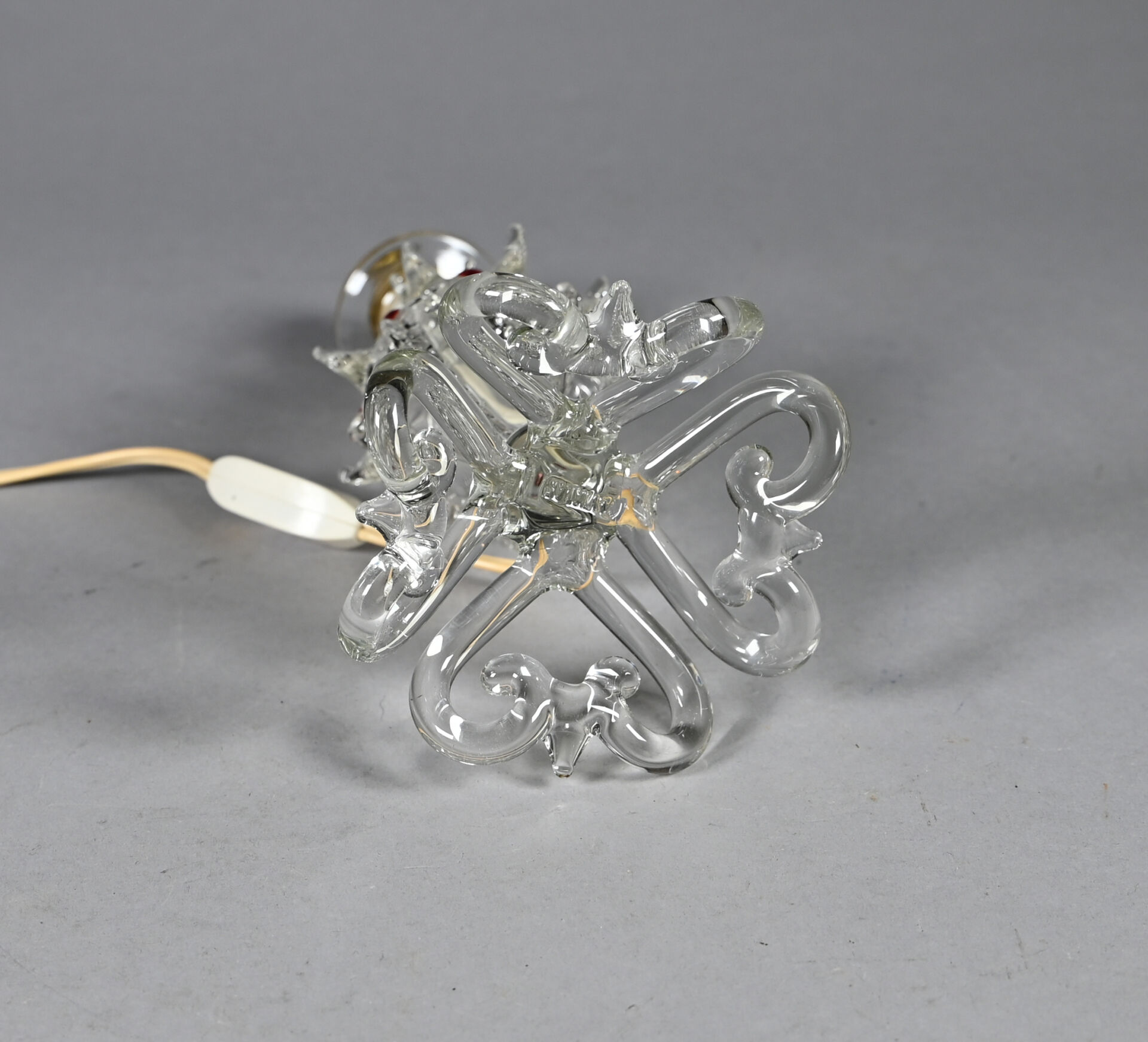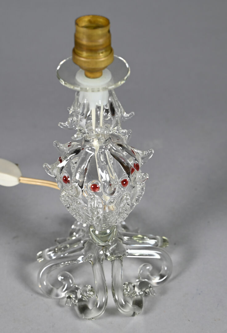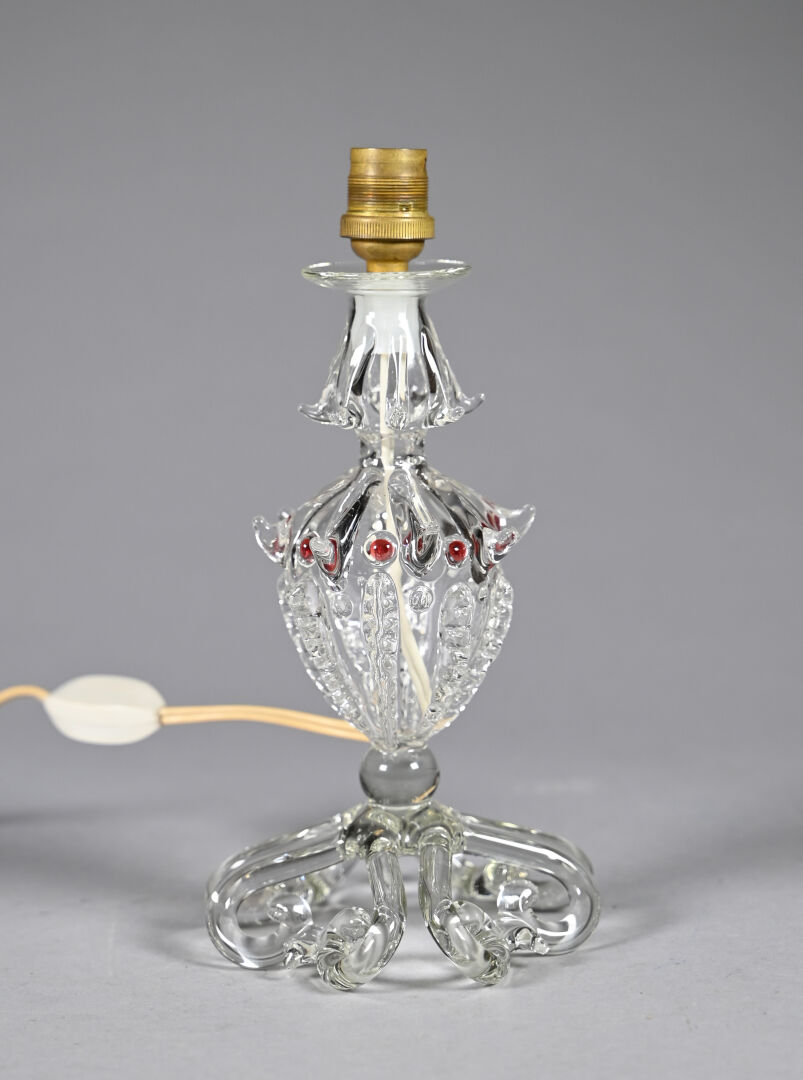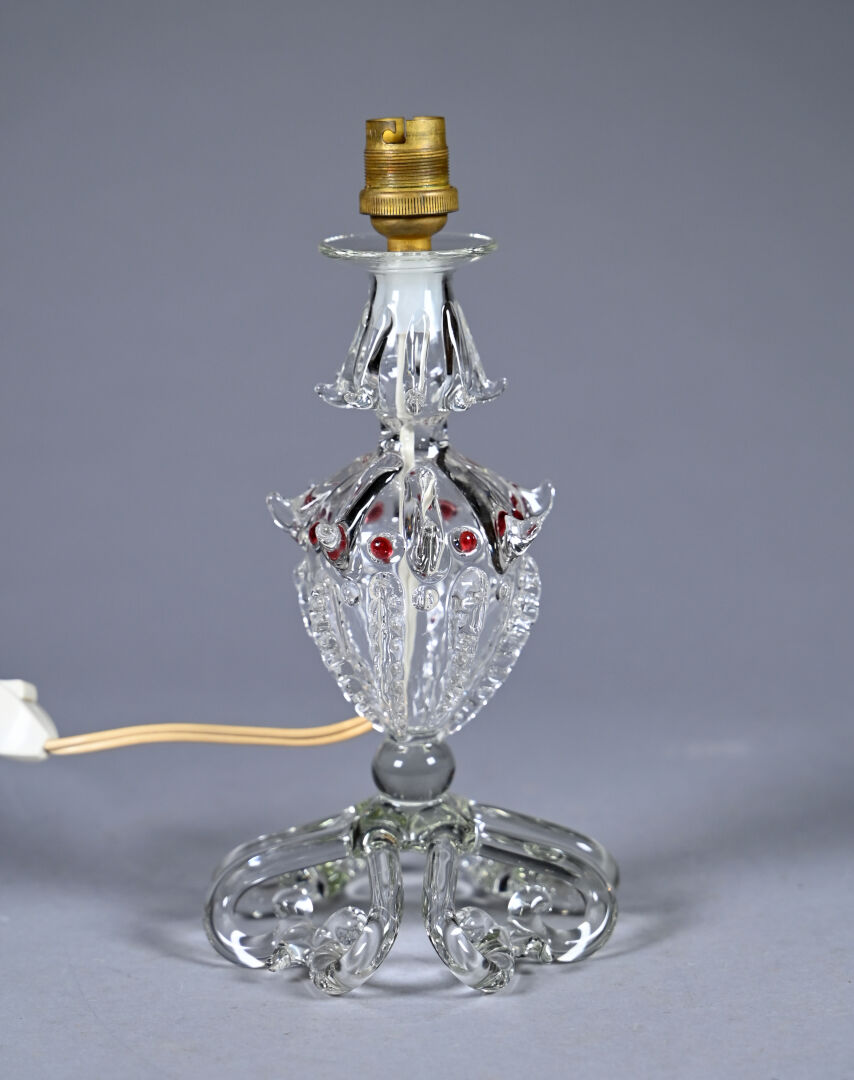 VIALAS. Lampe à poser en verre clair et ajouré et pastilles de verre rouge. Marqué au dessous. Milieu du XXe siècle. Haut. : 26 cm.