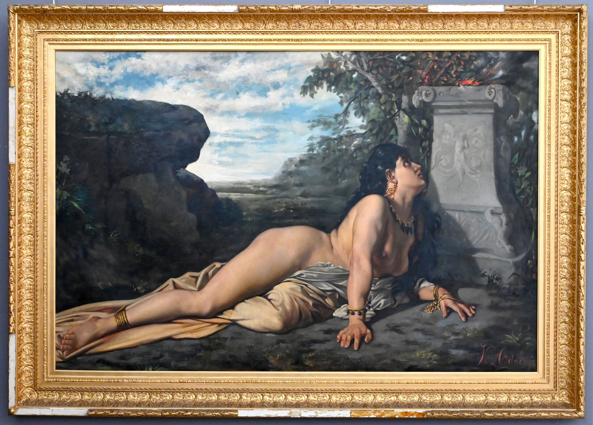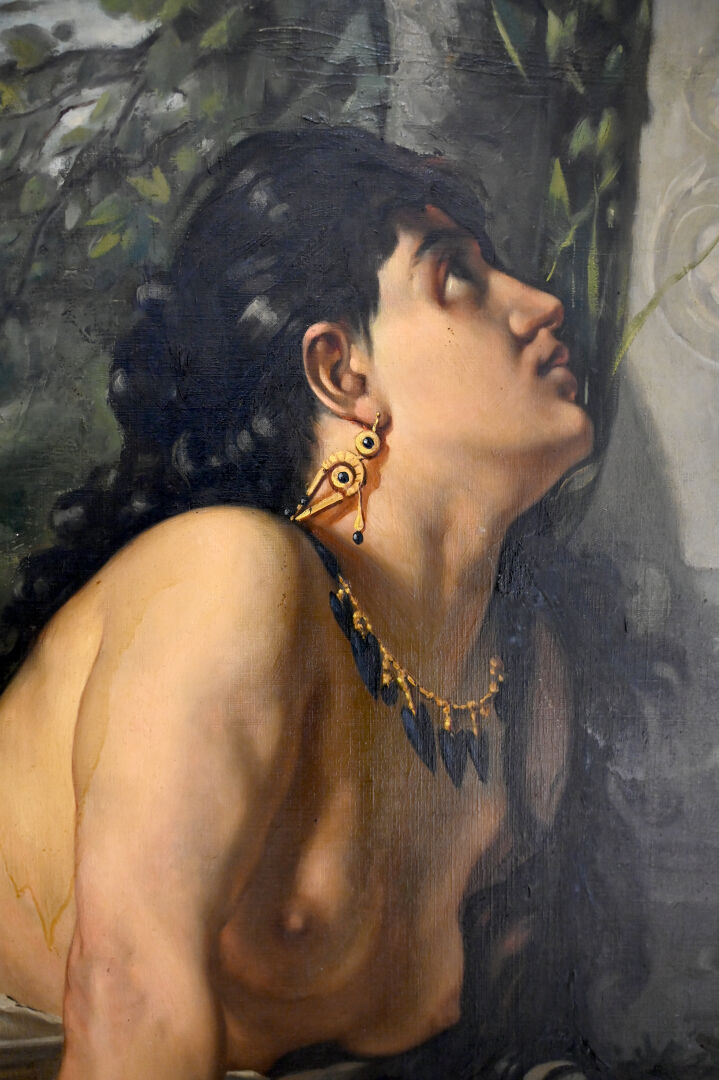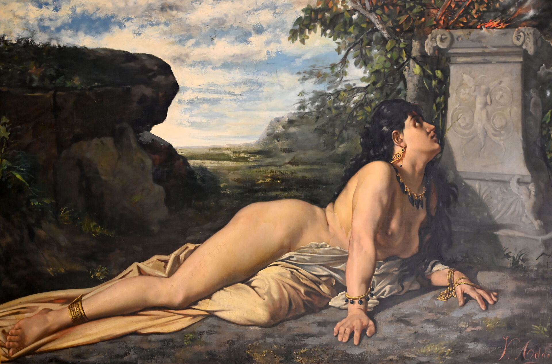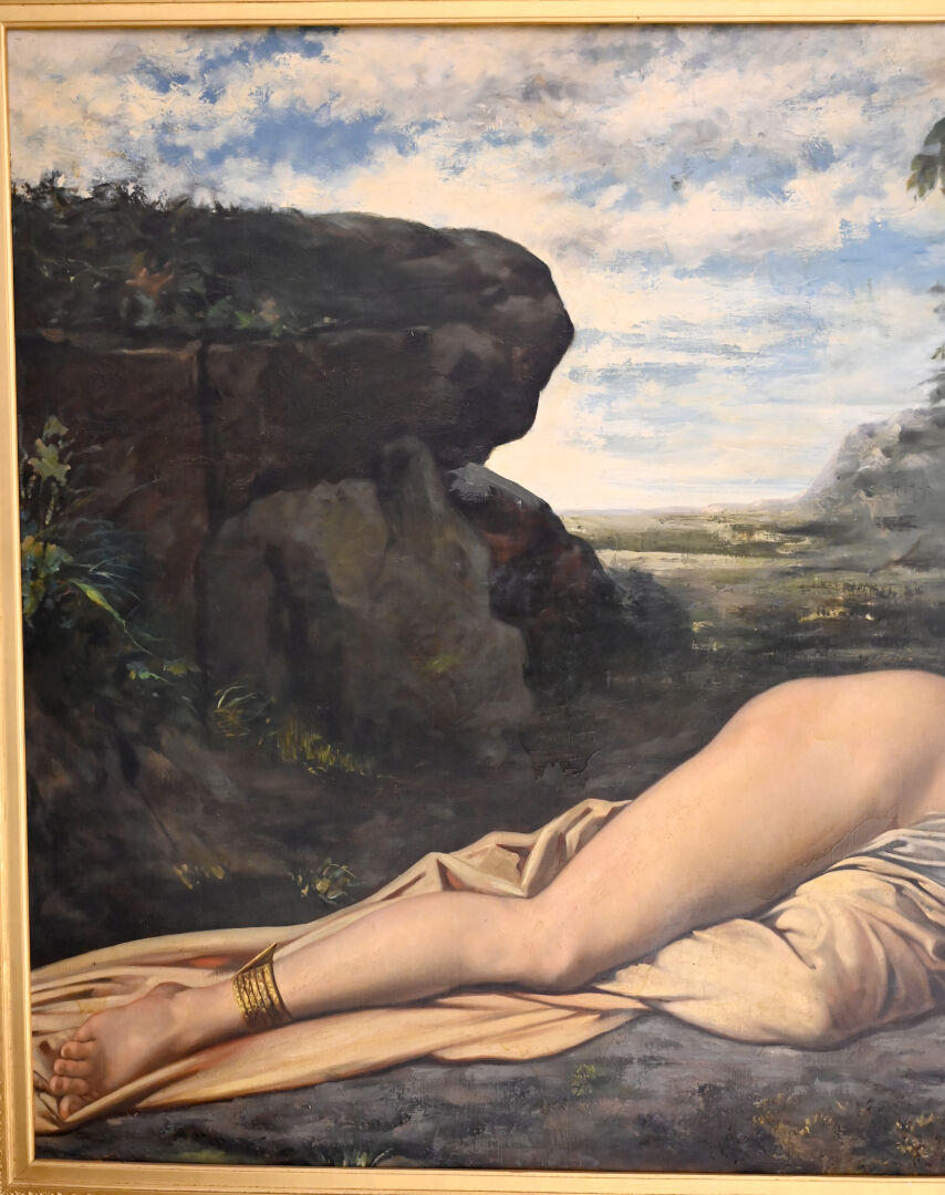 (*) Victor ADDE VIDAL (XIXe siècle). Femme orientale au drapé, couchée devant une stèle, 1878. Huile sur toile signée et datée en bas à droite (mouillures). Dimensions : 130,5 x 196 cm. Frais réduits à 14,28 % TTC pour ce lot.