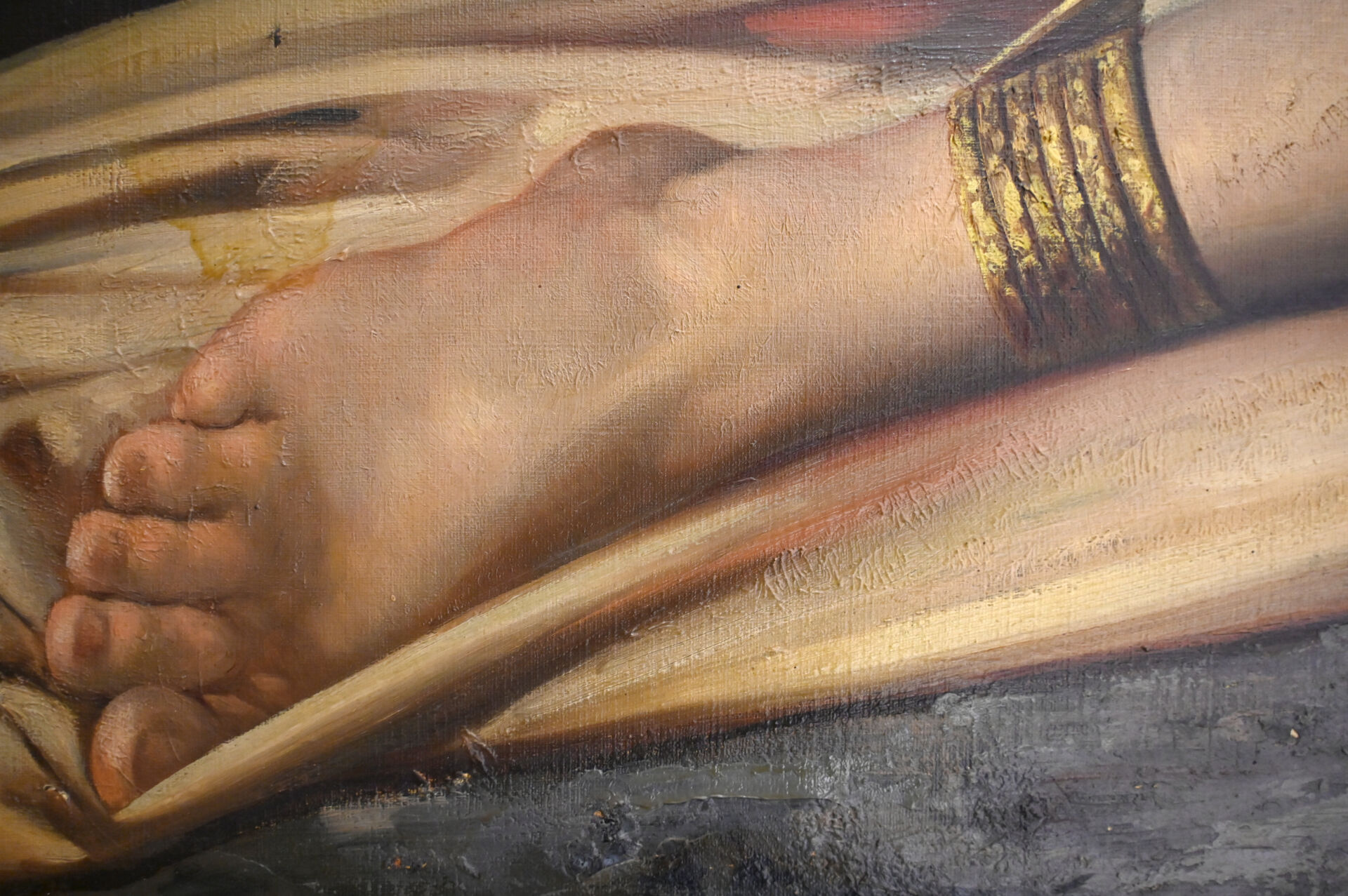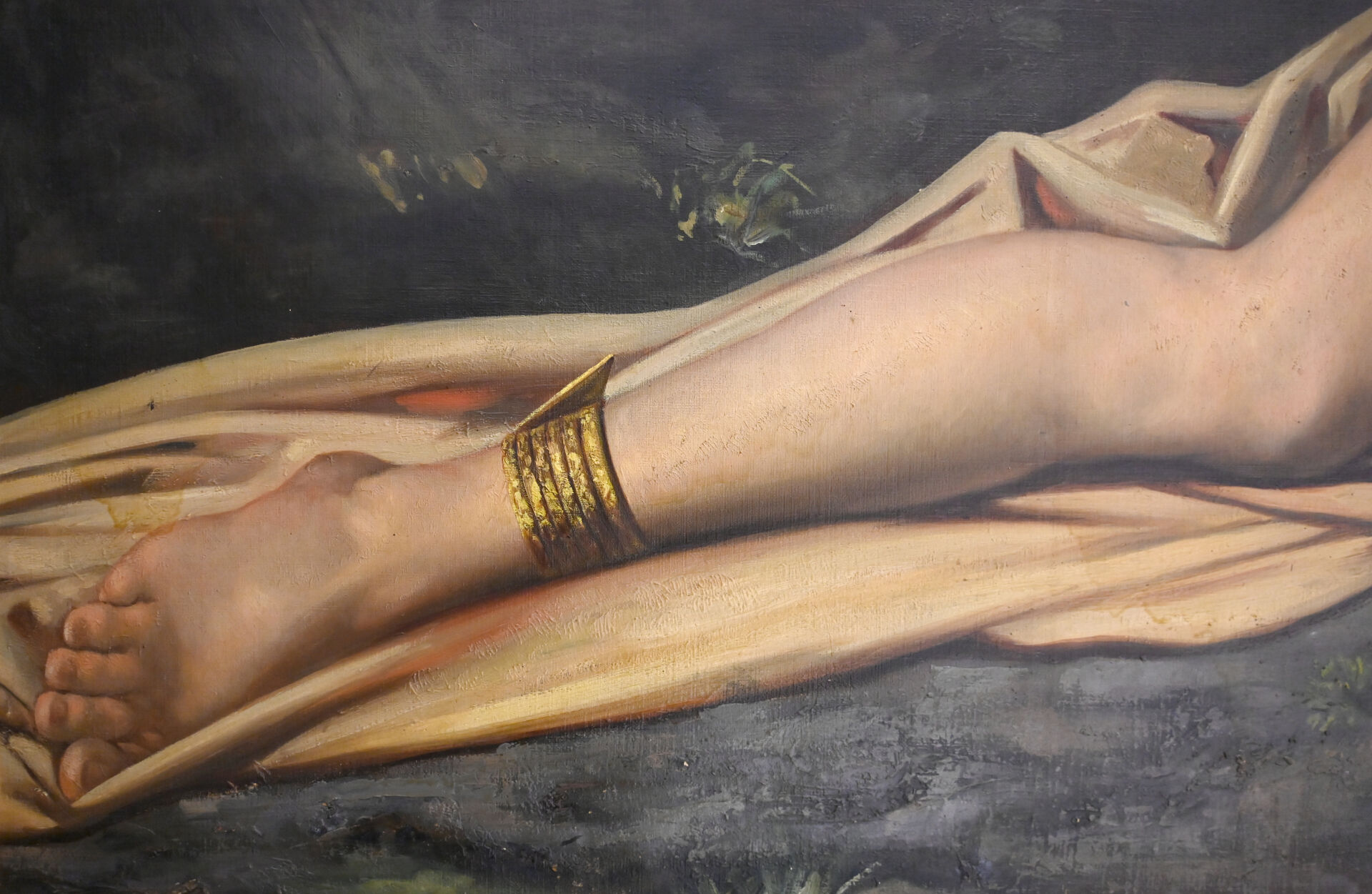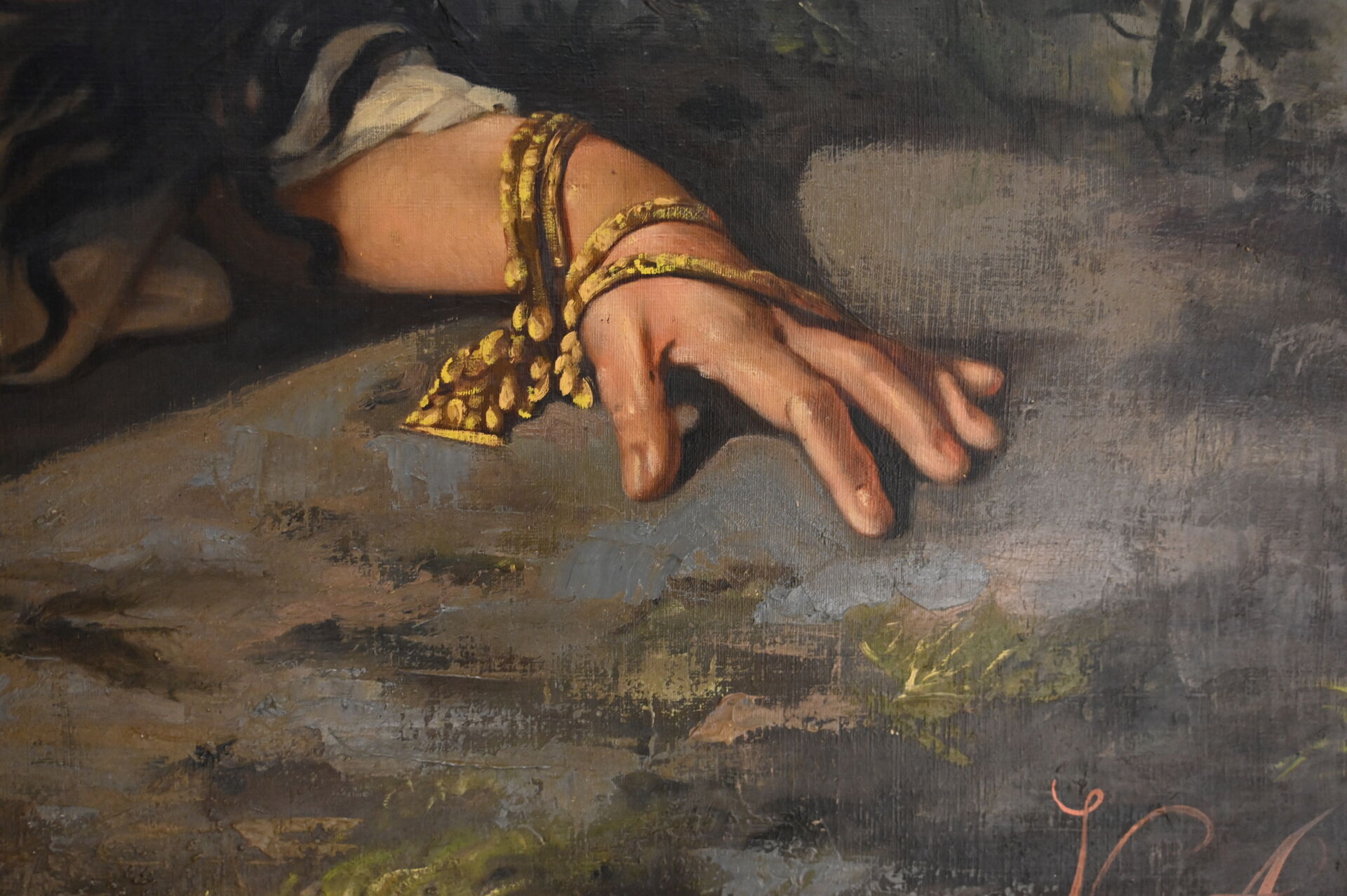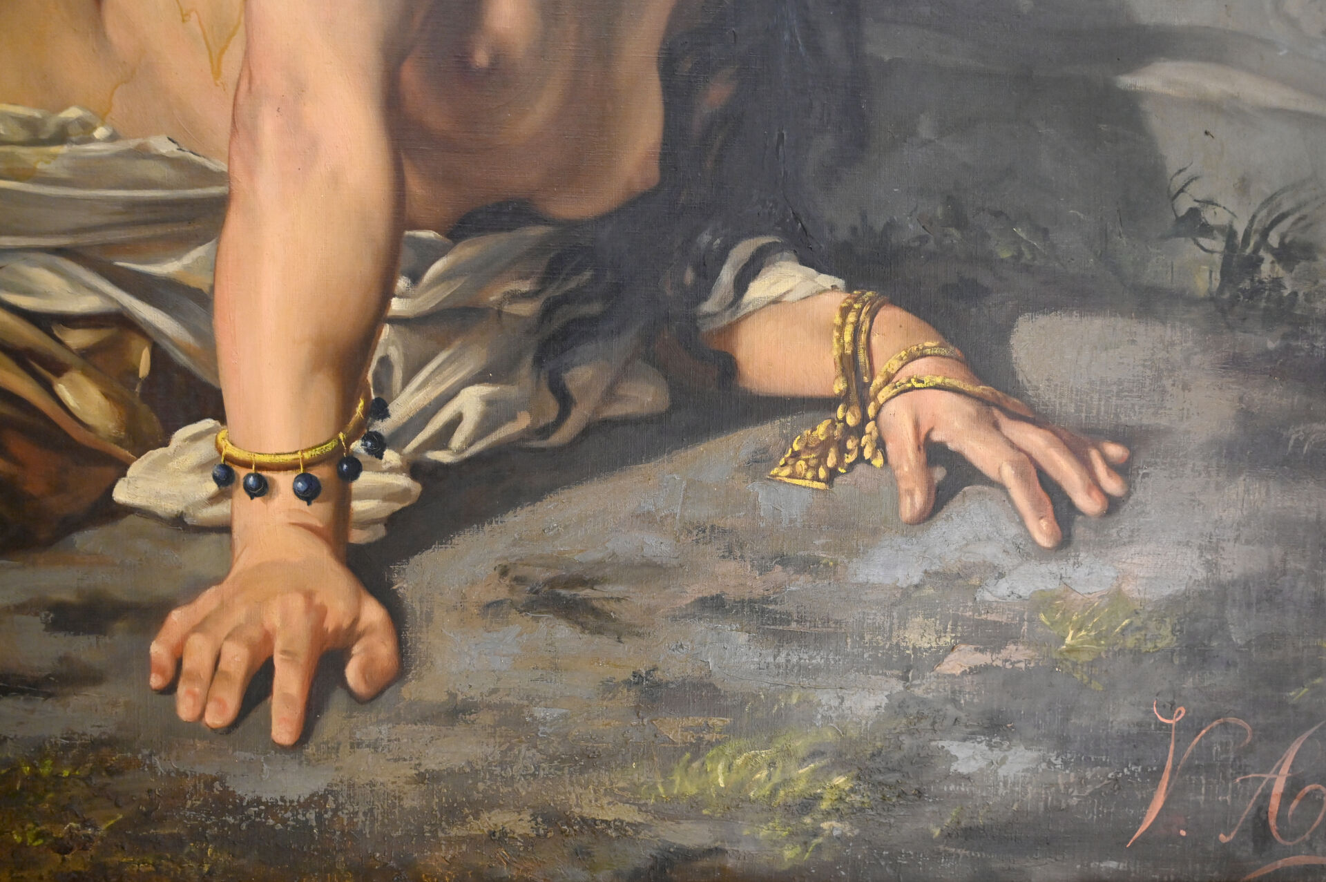(*) Victor ADDE VIDAL (XIXe siècle). Femme orientale au drapé, couchée devant une stèle, 1878. Huile sur toile signée et datée en bas à droite (mouillures). Dimensions : 130,5 x 196 cm. Frais réduits à 14,28 % TTC pour ce lot.