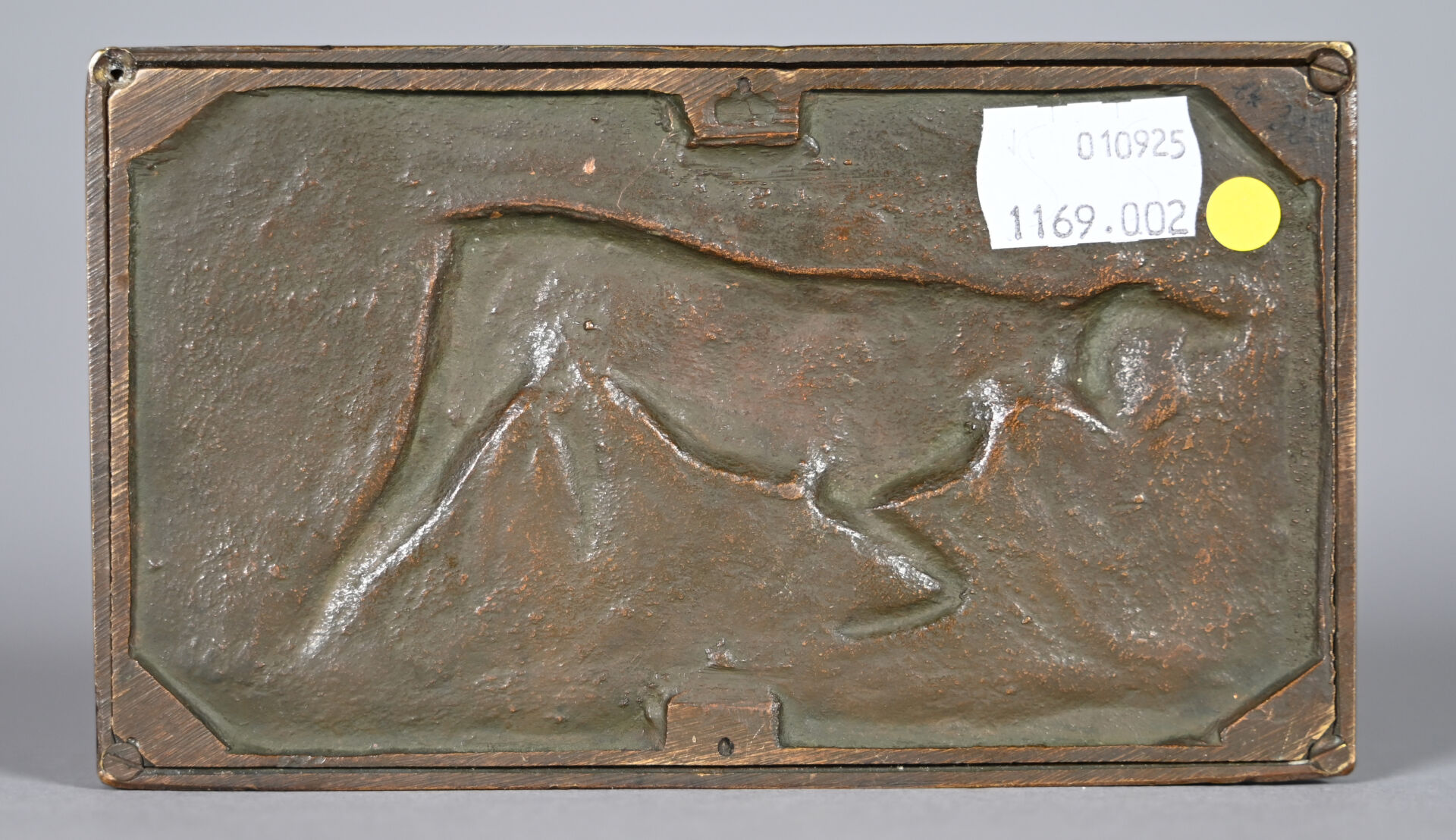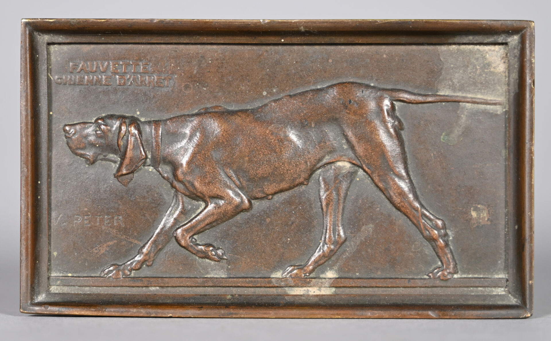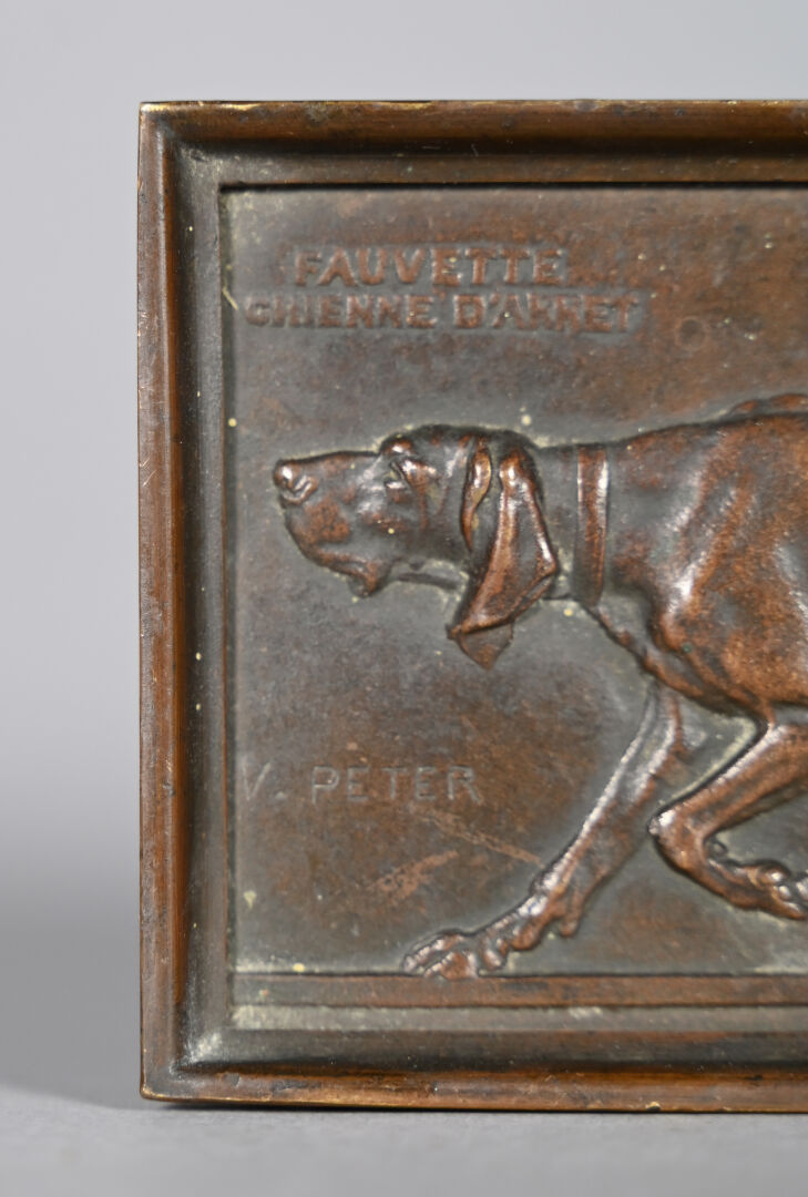 Victor PETER (1840-1914). Plaque en bronze « Fauvette Chienne d’arret ». Signée et titrée. 9 X 15 cm.