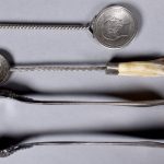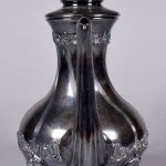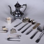 VICTOR SAGLIER. Théière en métal argenté à motif de palmettes. On joint une pince à sucre, deux cuillères en argent (poids brut : 93 g) et un ensemble en métal argenté dont des couverts de service d’époque Art Déco.