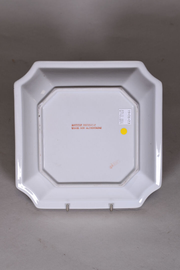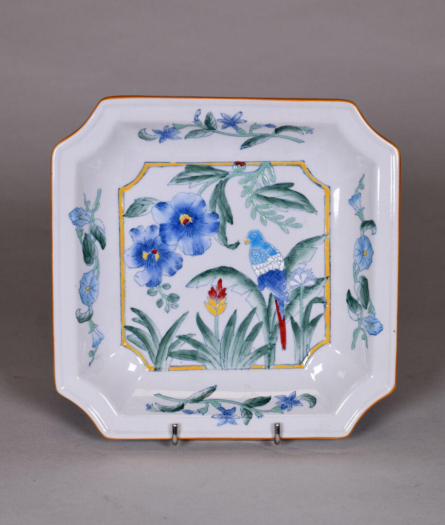 Vide-poche octogonal en porcelaine à décor émaillé en polychromie d’un perroquet et de fleurs. 20,5 cm x 20,5 cm.