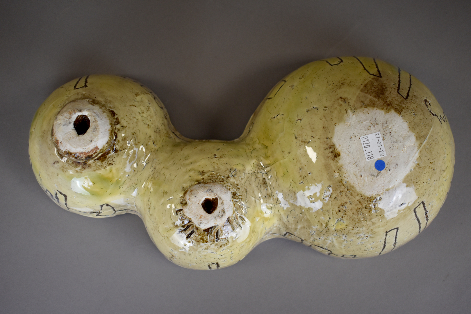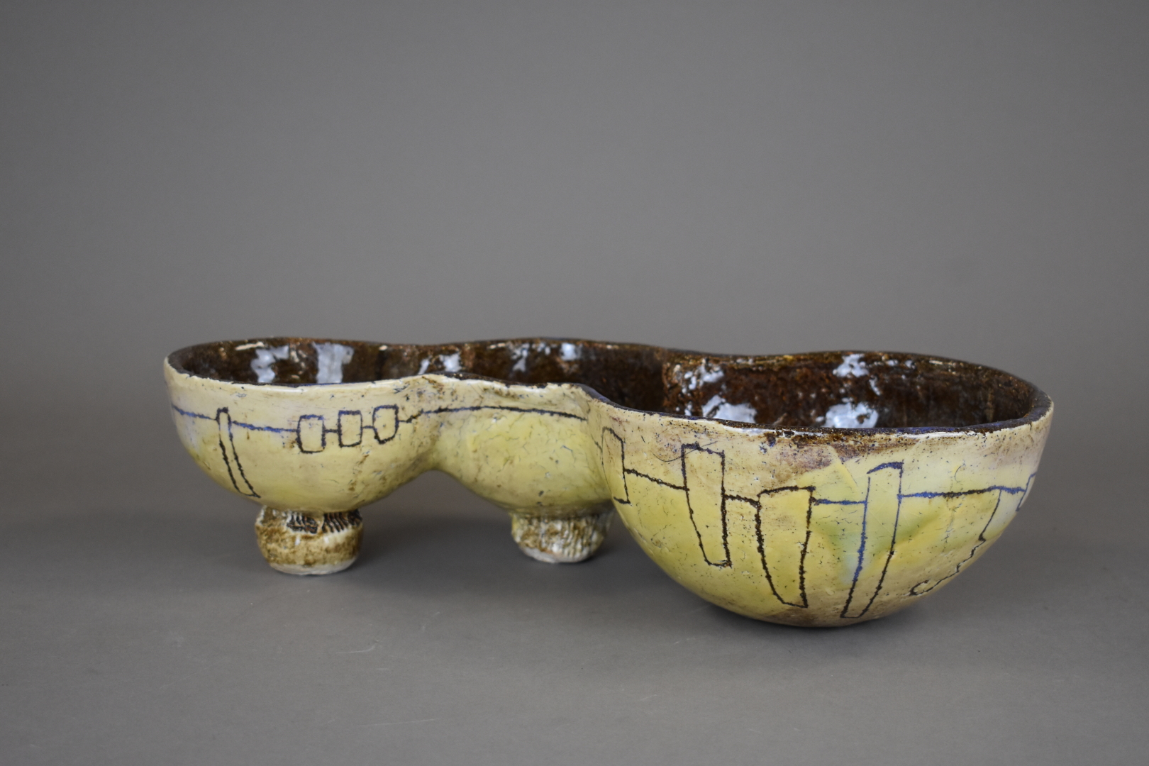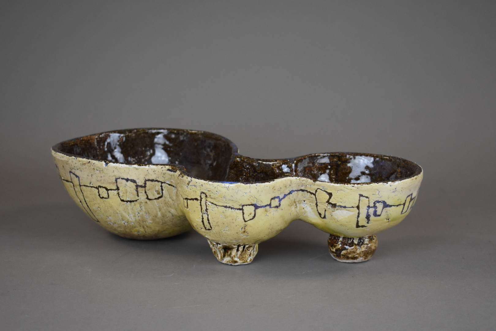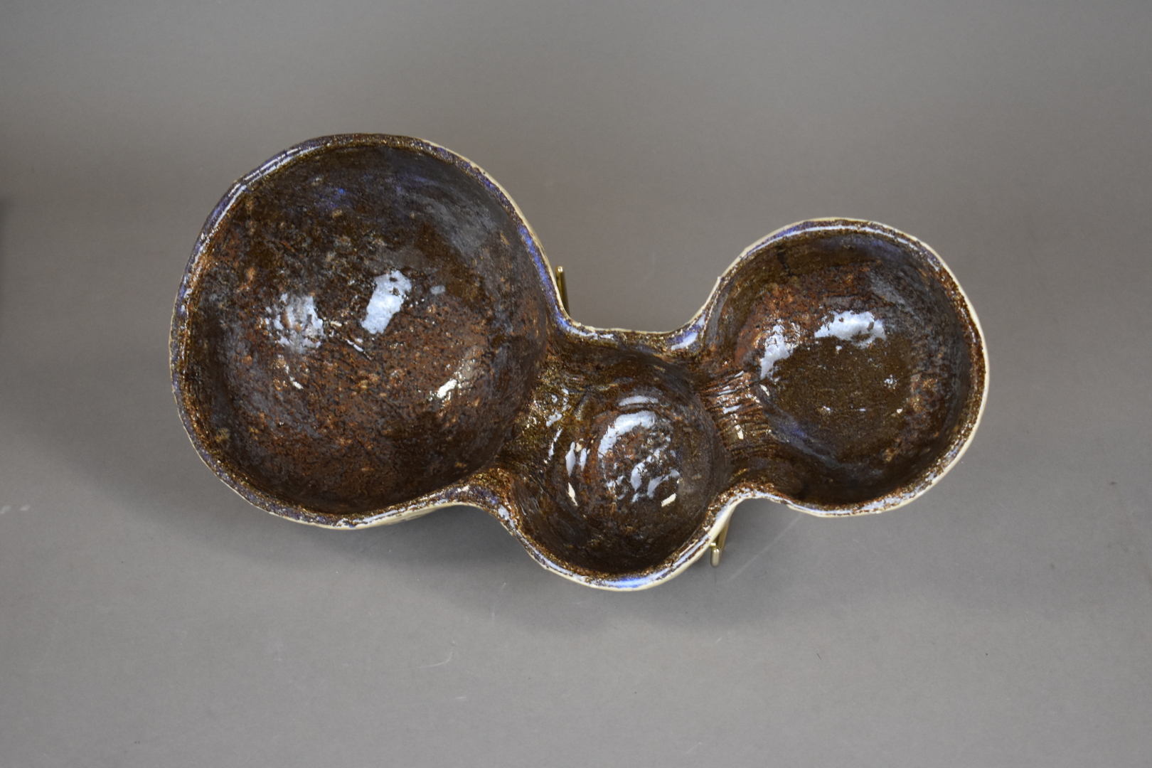 Vide-poche trilobé en céramique, l’intérieur émaillé brun, l’extérieur émaillé crème à décor géométrique gravé. Vers 1950 – 1960. Haut. : 10 cm – Larg. : 39 cm – Prof. :18,5 cm.